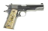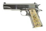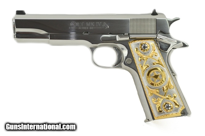 Description: Colt Government .45 ACP caliber pistol. Customized bright stainless model with fancy Texas grips.