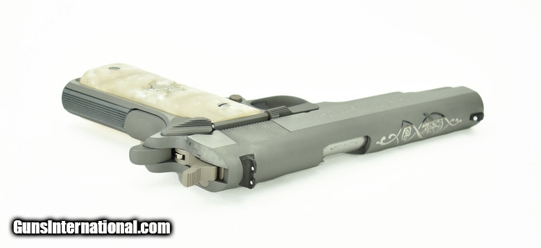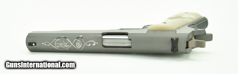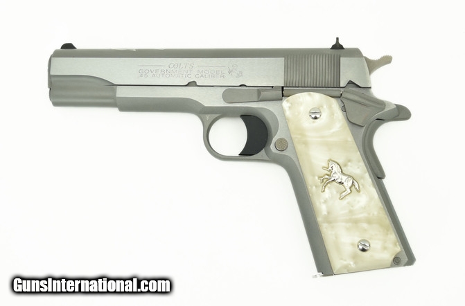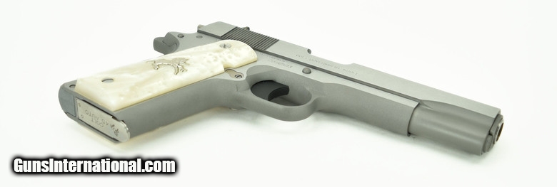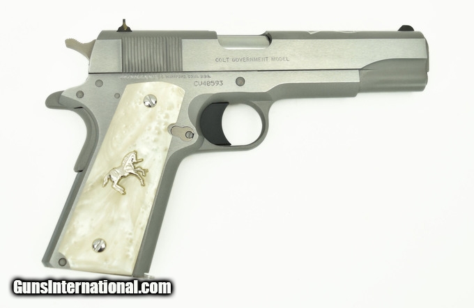 Description: Colt Government .45 ACP caliber pistol. Stainless Steel with etched design on slide and fancy grips. SOLD |
