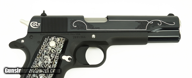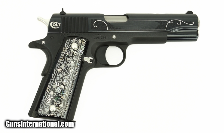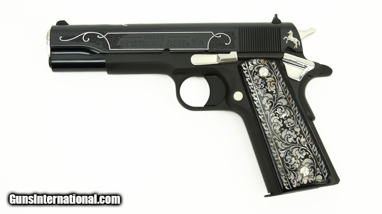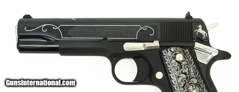 Description: Colt Government .45 ACP caliber pistol. “Black and White” Special Edition with polished blue slide, nickel silver inlay, and fancy grips. New SOLD |