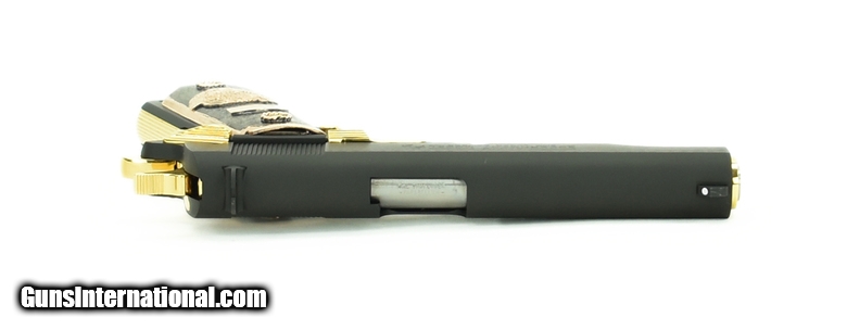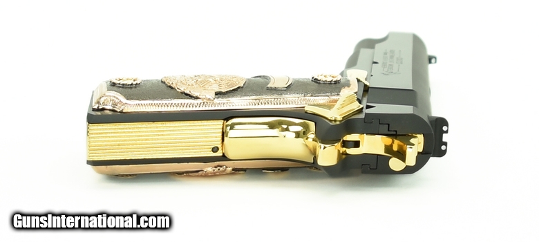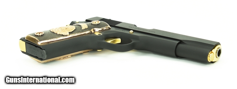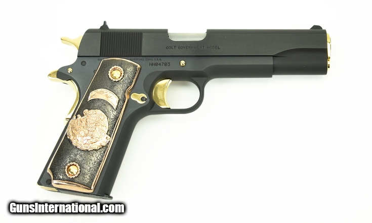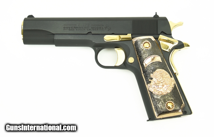 Description: Colt Government 9mm caliber pistol. Customized with gold plated parts and Mexican style grips.New