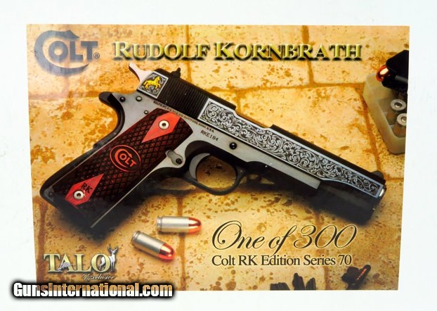 Description: Colt Government Kornbrath .45 ACP caliber pistol. Rudolph Kornbrath one of 300 limited edition. Engraved in the style of Kornbrath. Mint condition with box. SOLD |