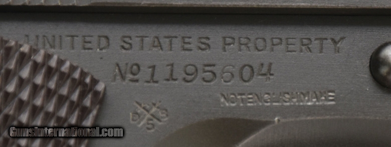 Description: Colt M1911A1 .45 ACP caliber pistol. Lend-Lease for Britain. U.S. inspector “GHD” (George H. Dain) on frame. British proofs from The Birmingham Proof House with “Crown BV” on slide and frame. Also marked “Not English made” on frame. Bore is excellent. Gun has 97-98% original finish. Serial number is from 1945 year of production. Excellent Lend-Lease Colt 1911A1.