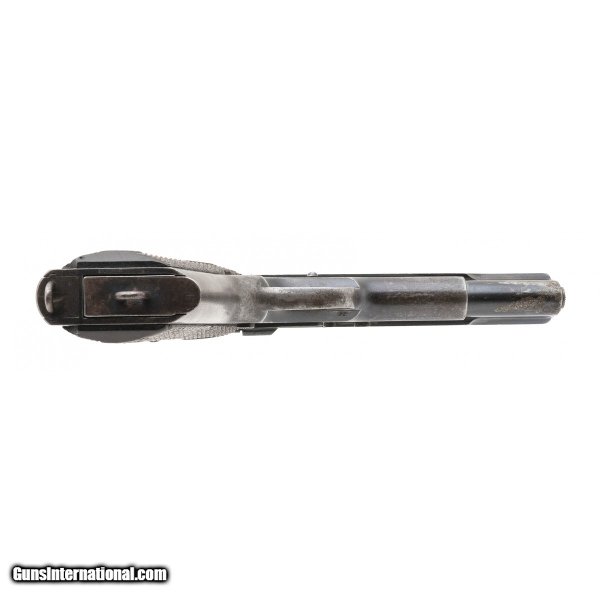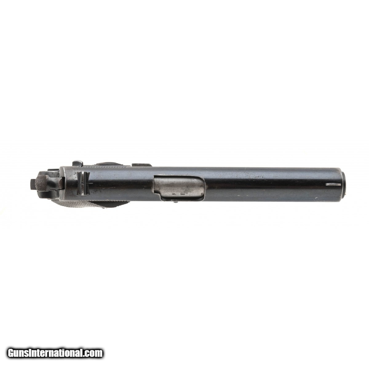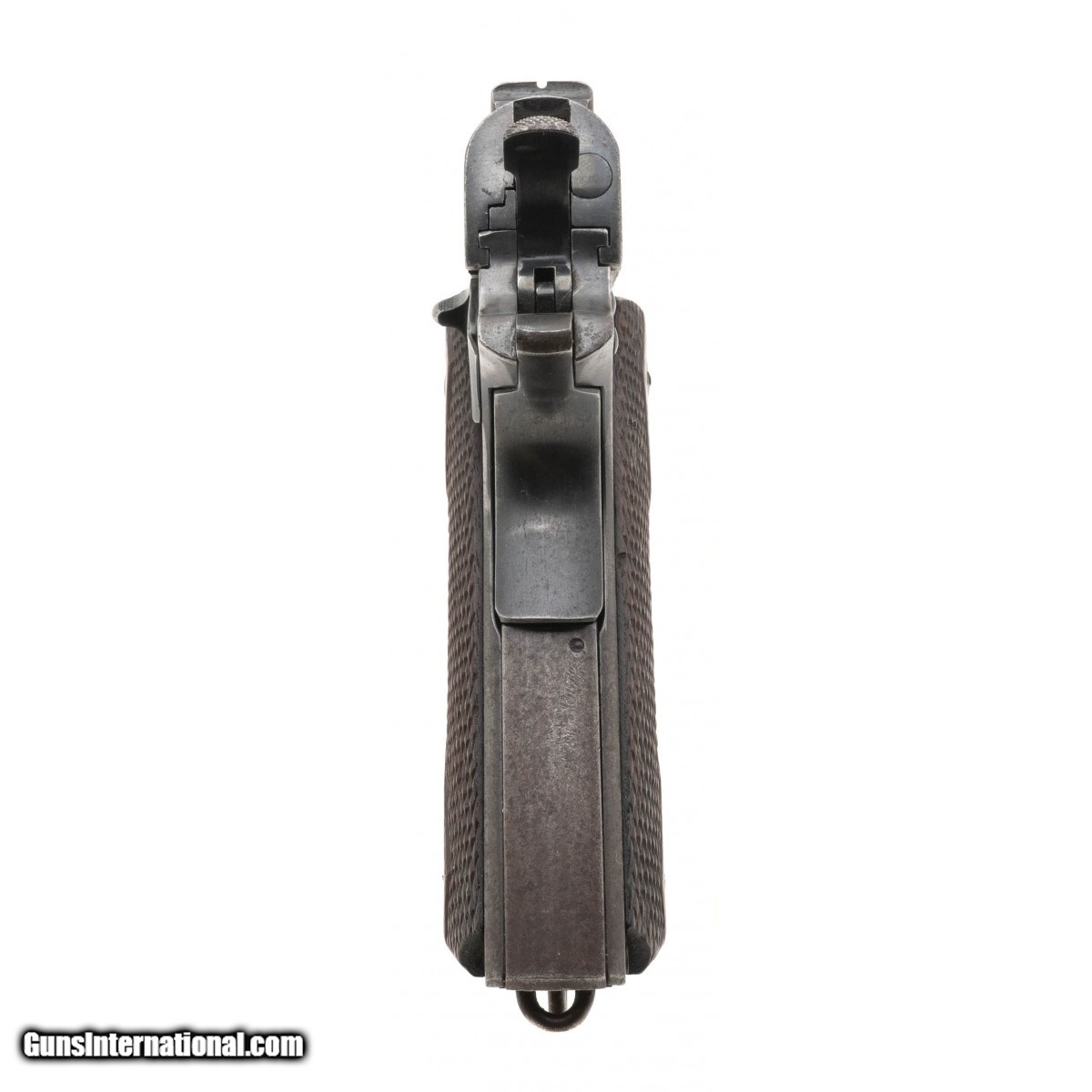 Description: " Serial No.W29066, chambered in .455 Eley with a 5"" round barrel, manufacture in 1915. Very fine gun with about 65% original finish remaining. Bore is good with frosting in the grooves. Magazine is a broad arrow marked two-tone .45acp not .455 Eley. Action functions correctly. SOLD Curio/Relic: Yes |