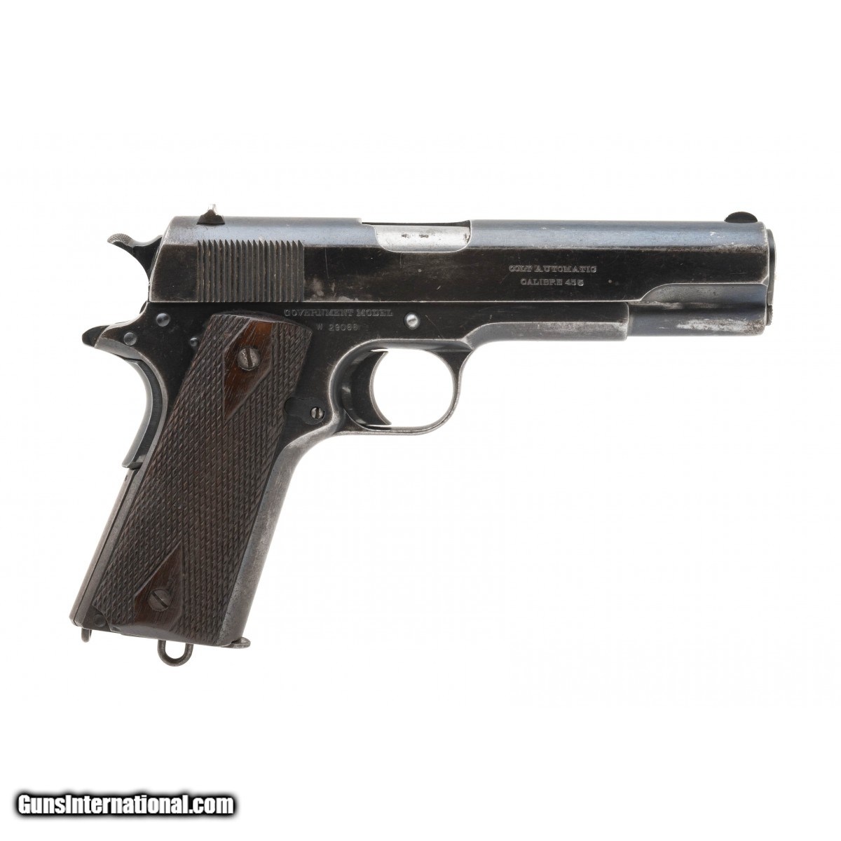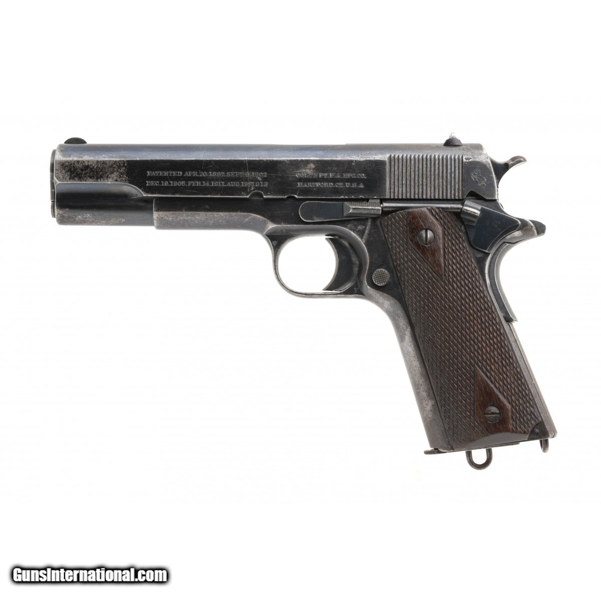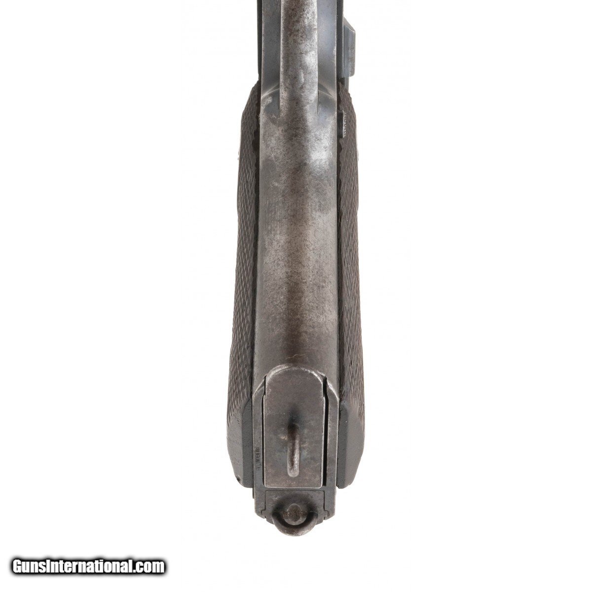 Description: " Serial No.W29066, chambered in .455 Eley with a 5"" round barrel, manufacture in 1915. Very fine gun with about 65% original finish remaining. Bore is good with frosting in the grooves. Magazine is a broad arrow marked two-tone .45acp not .455 Eley. Action functions correctly. SOLD Curio/Relic: Yes |