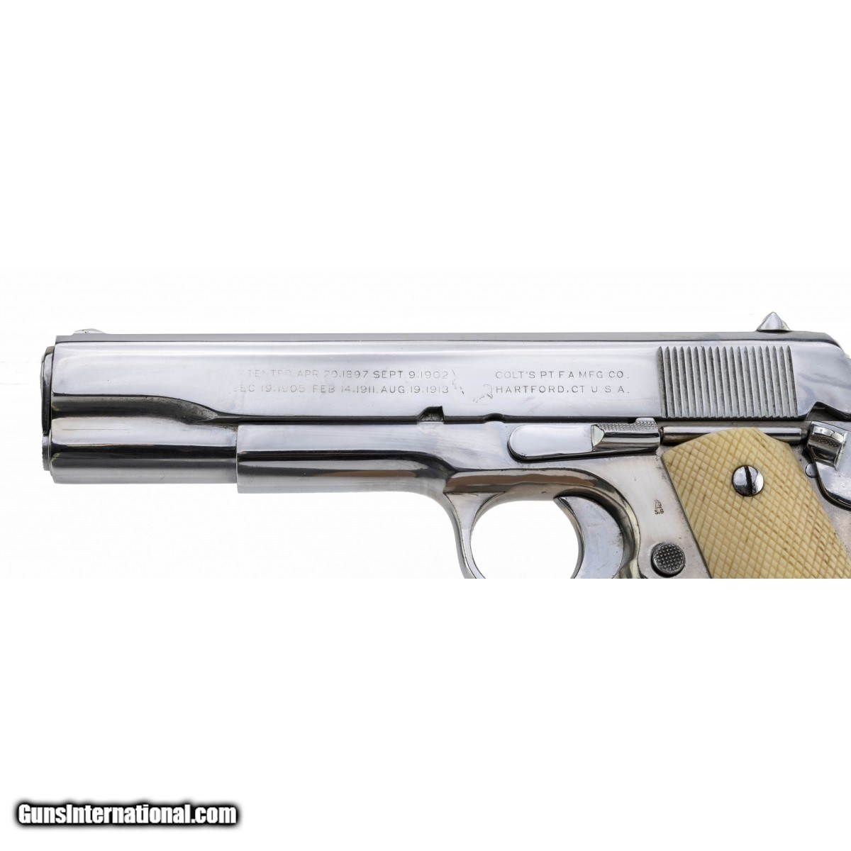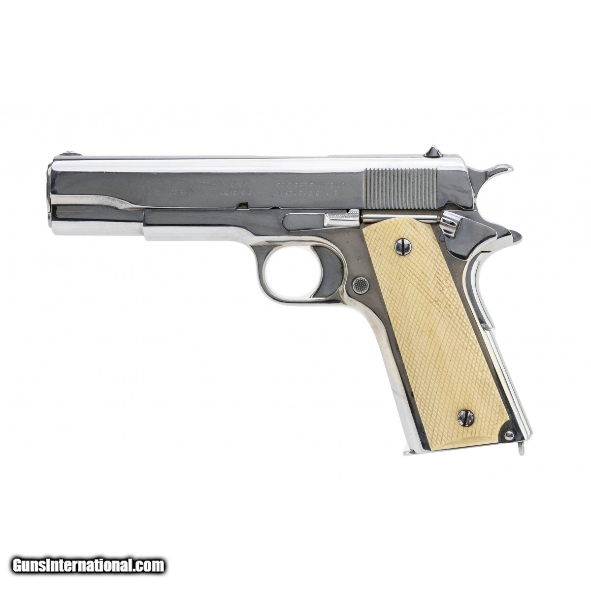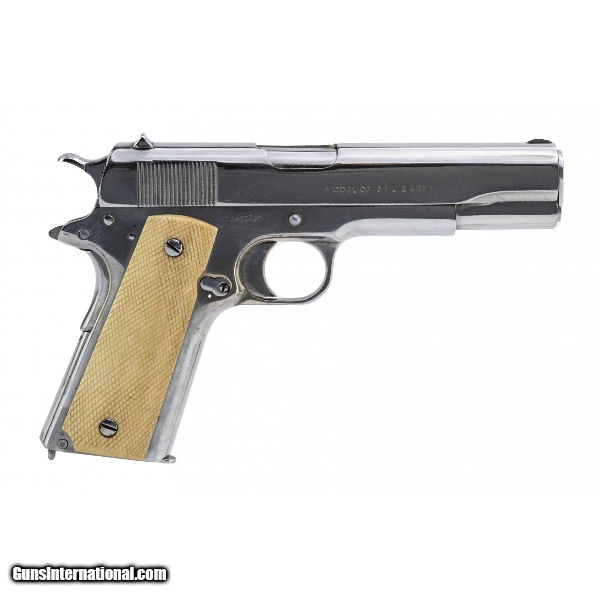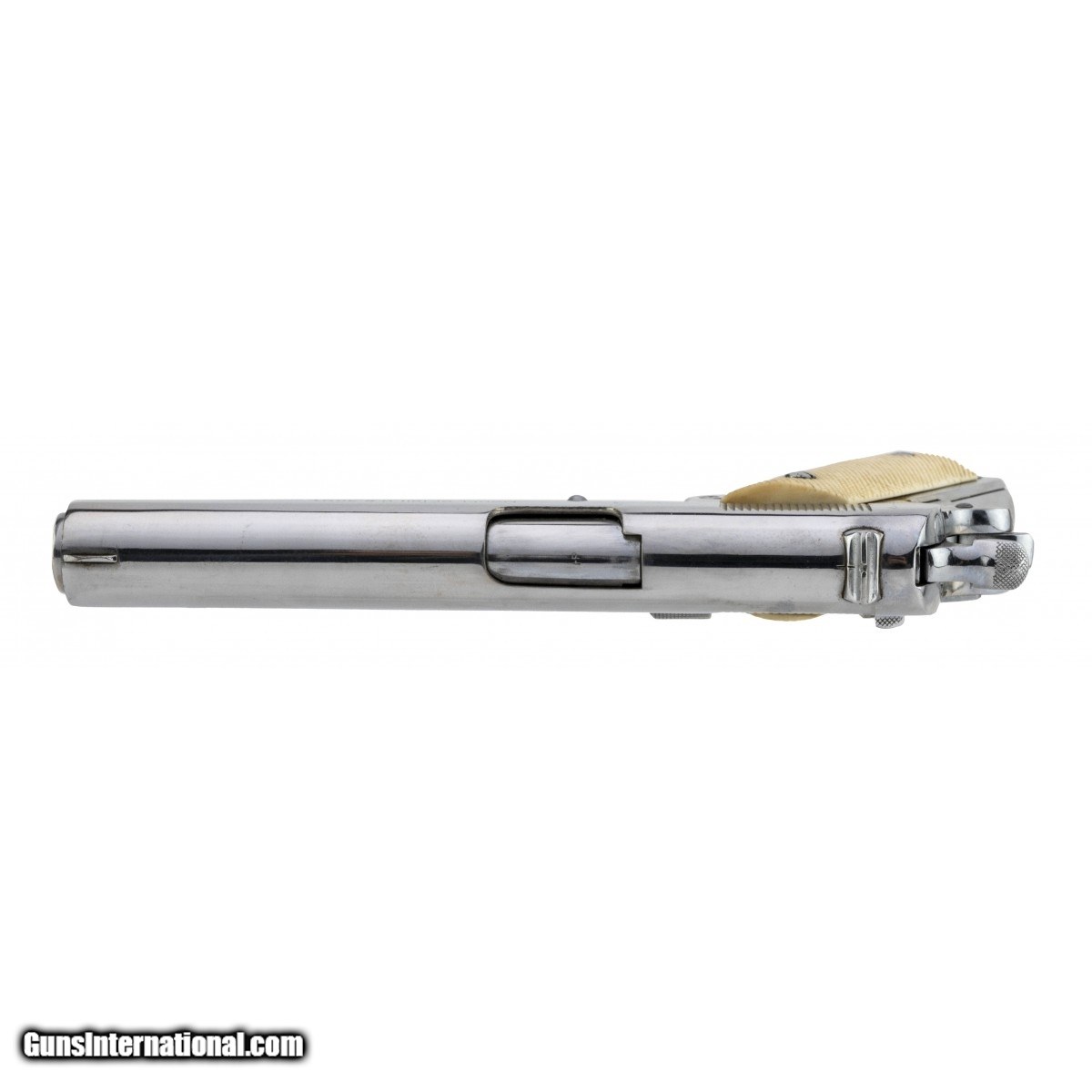 Description: " Customized U.S. military pistol. The gun has been chrome plated, which is very common for G.I. bring back pistols. The finish is in very good condition with light wear. The bore is good with light frosting throughout. The grips are old checkered ivory. A neat looking old school barbecue gun. SOLD |