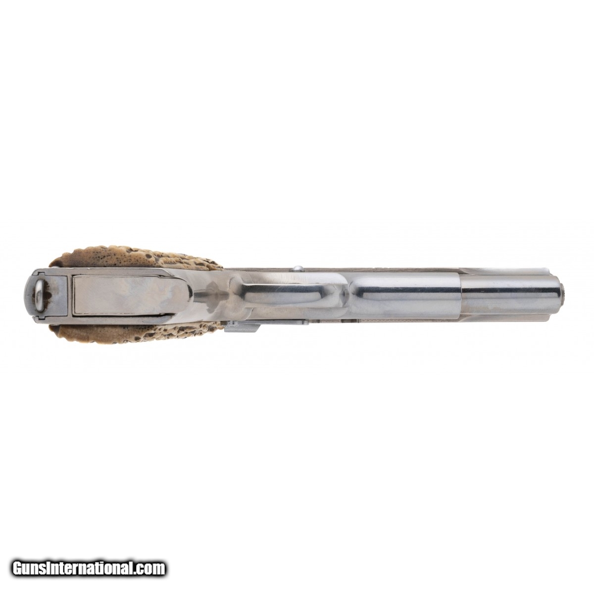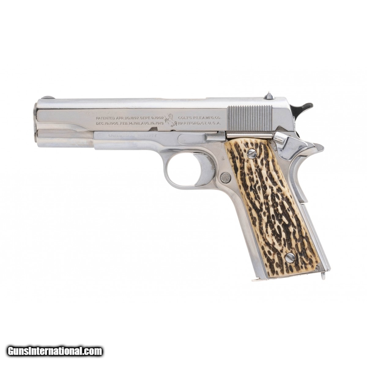 Description: " SN: 369254. WWI U.S. military pistol made in 1918. Bore is good with light etching. Has been customized with chrome finish and stag grips. Looks good, very good condition. SOLD |