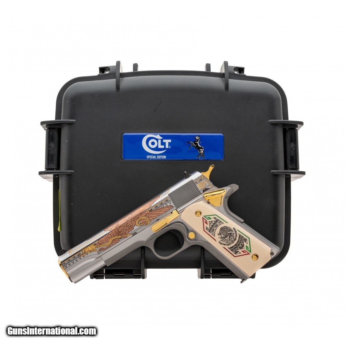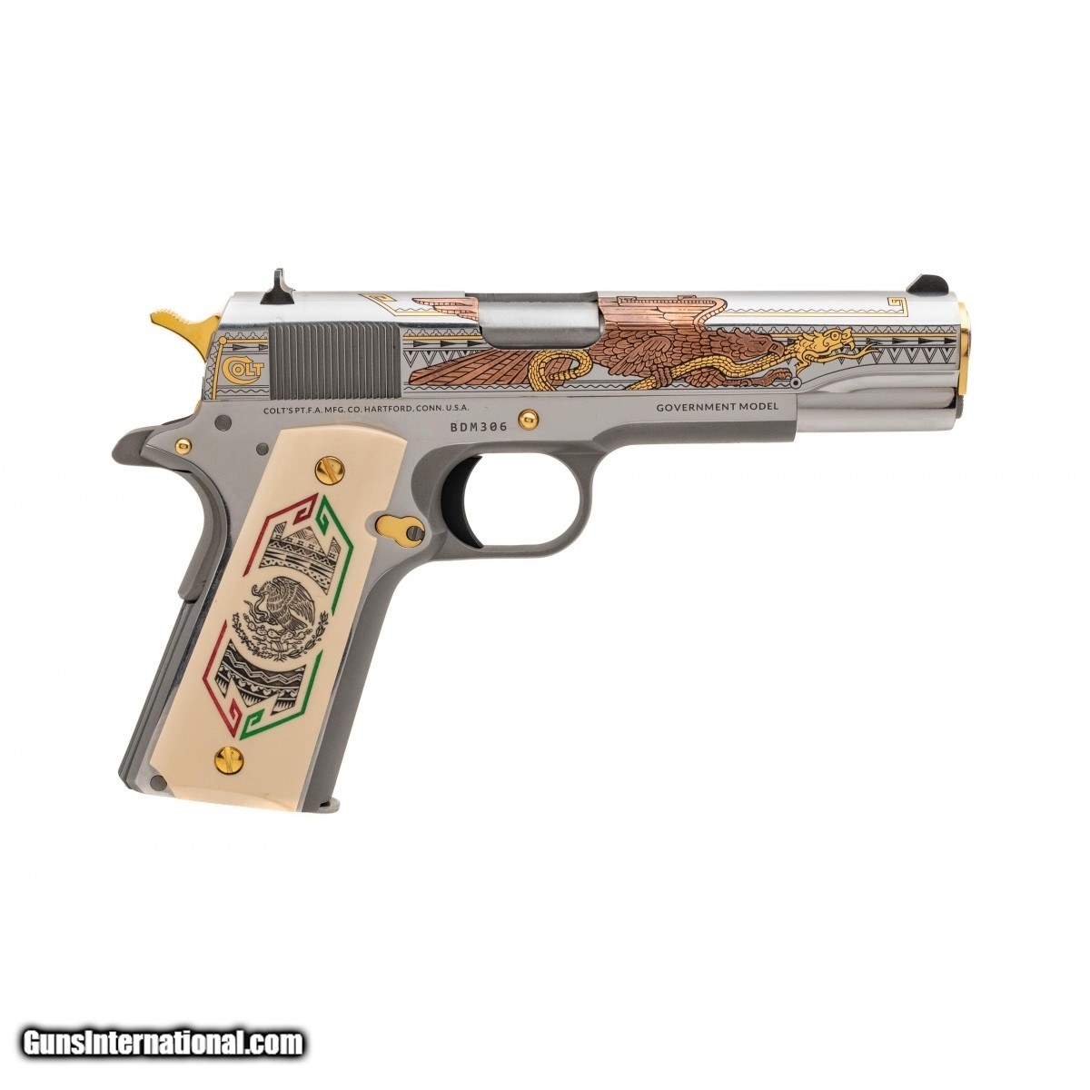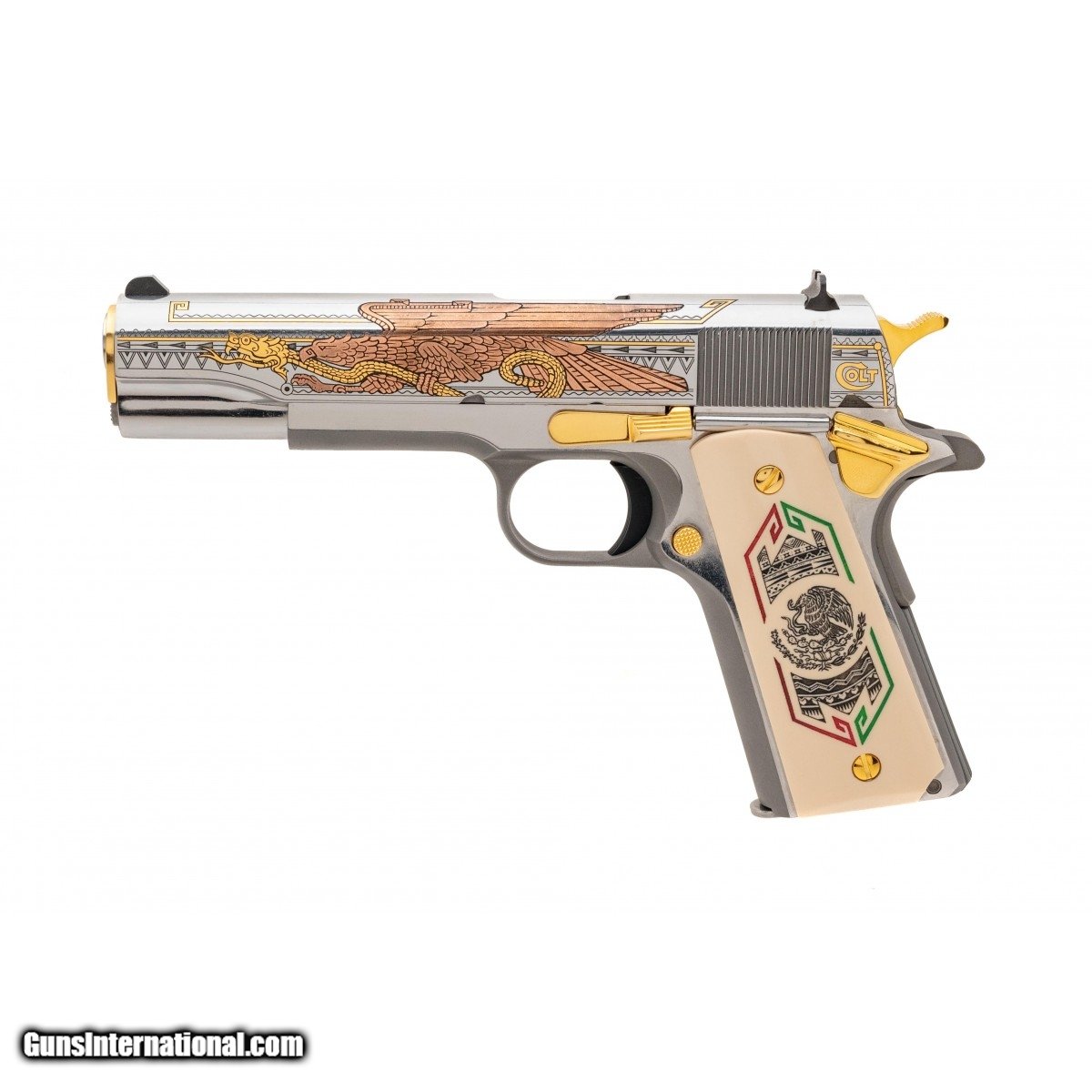 Description: " SN: BDM306. Limited edition 1 of 500 ""Bandera de Mexico"" decorated with a Mexican motif and engraved slide. Overall excellent condition. Comes with Colt hard case. SOLD |