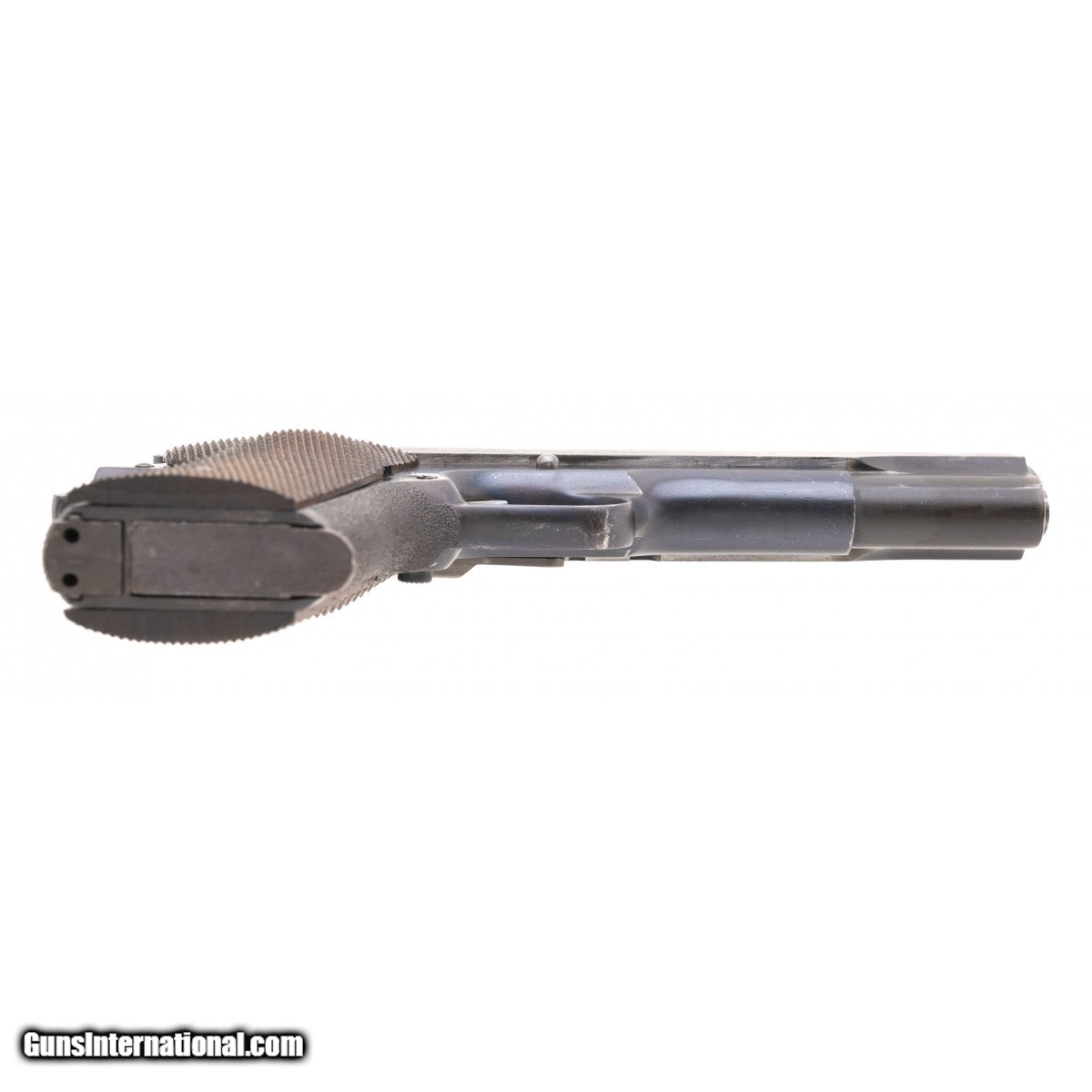 Description: " SN: 341021. Made in 1918. .45ACP with a 5"" barrel. Bore is bright with strong rifling. Custom competition 1911 with target sights. Finish is in very good condition with wear noted. Custom wood grips are in very good condition. Actions functions properly. Overall condition is very good. SOLD |
