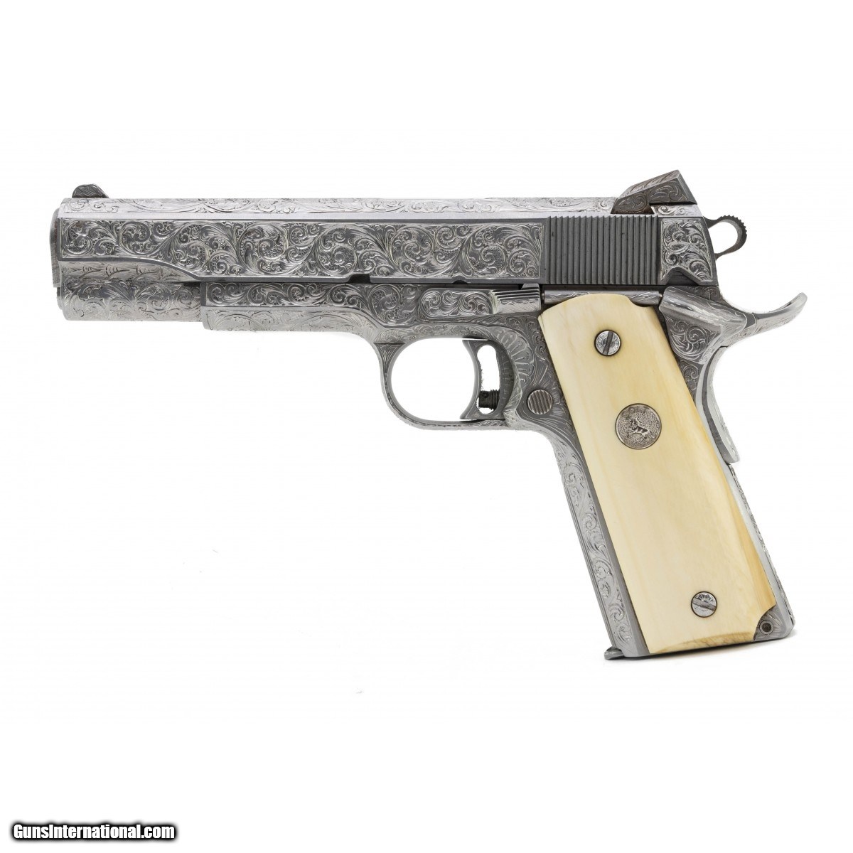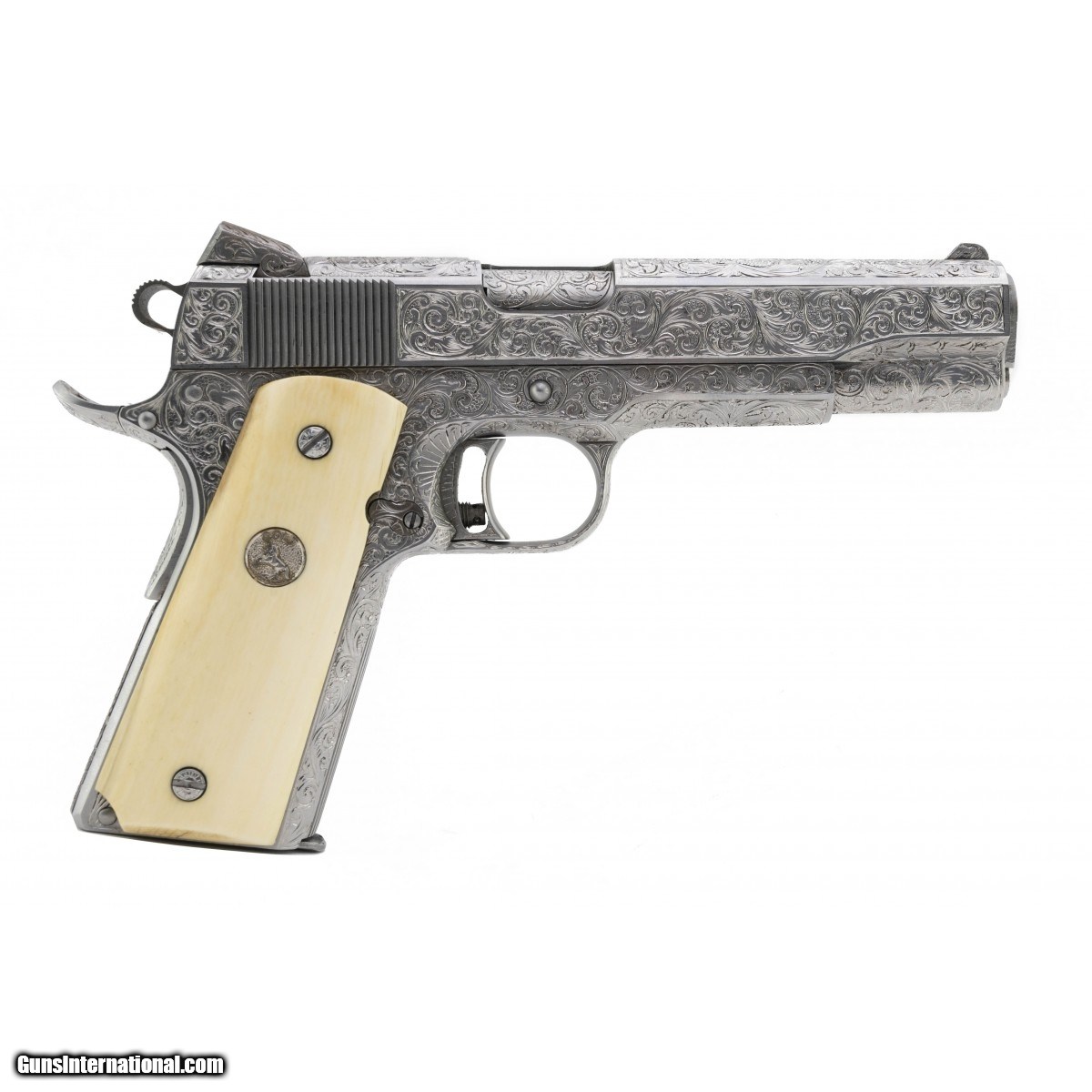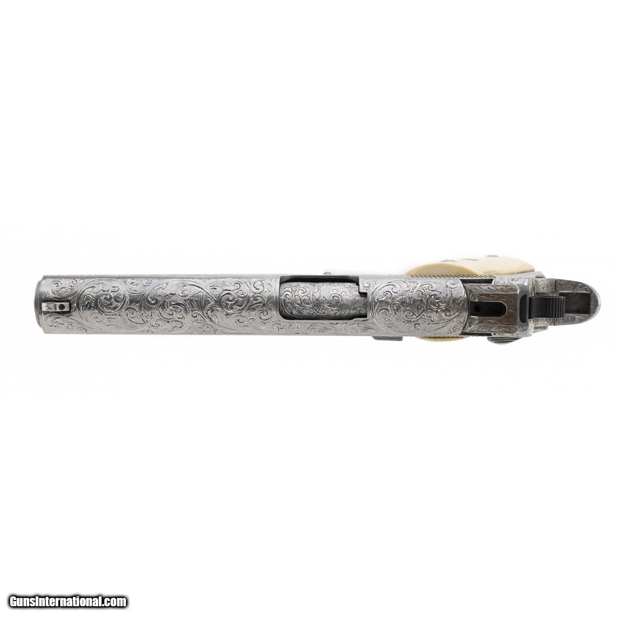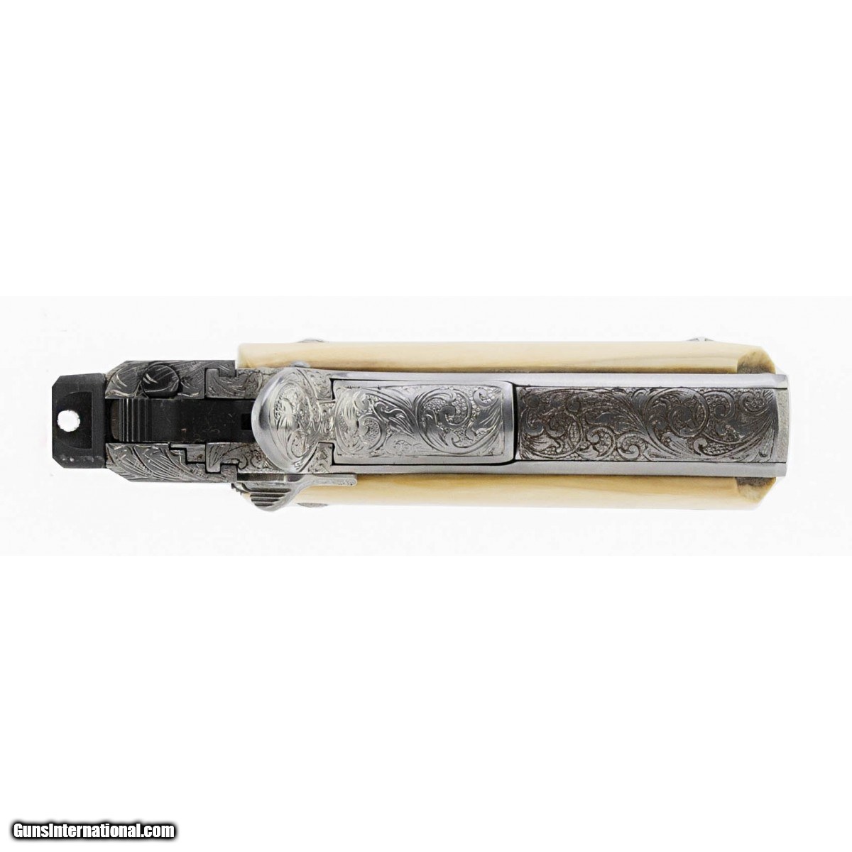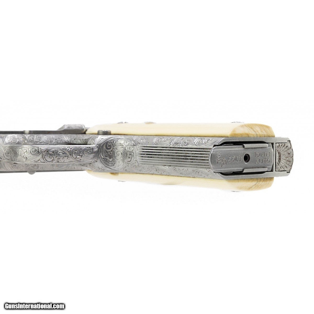 This outstanding piece is a rare Colt Ultra Ten limited edition 10mm pistol that has been profusely engraved with full coverage scroll by J.W. Thompson. The gun is signed on the right side frame under the grip ""ENG. JW THOMPSON"", and the serial number has been re-stamped there, since every inch of the metal was engraved, including over all the slide and frame markings. The gun was customized prior to engraving with Novak style ghost ring sights, and upgrade beavertail safety and hammer. The grips are mellow ivory panels with Colt medallions, marked on the inside ""Hand Crafted For Colt Firearms"". A truly beautiful and ornate pistol, in excellent condition.