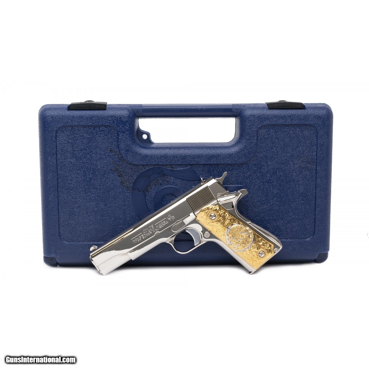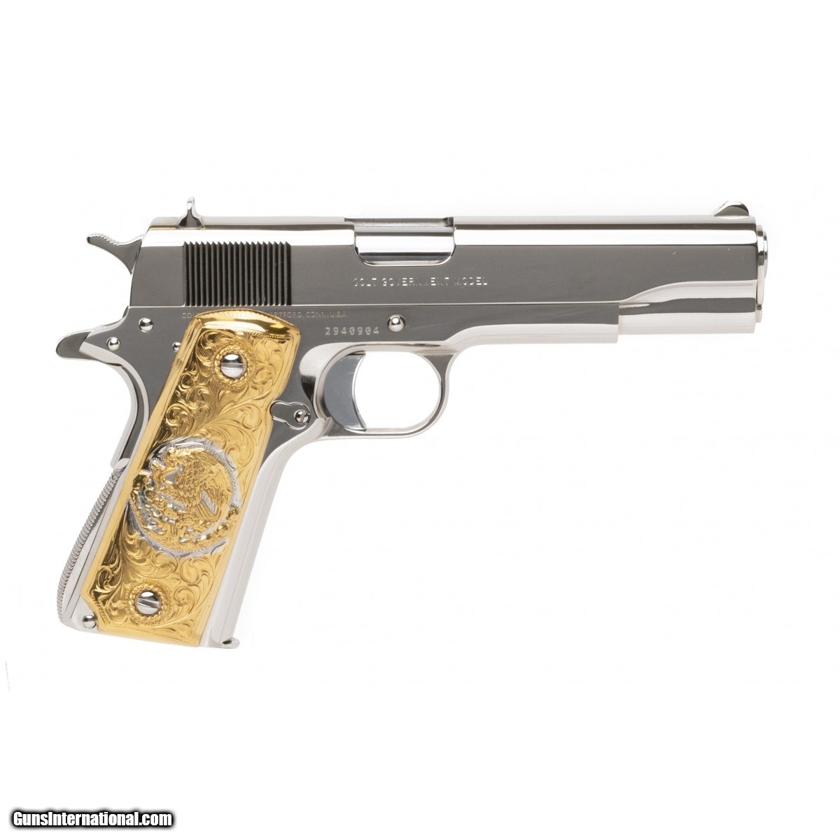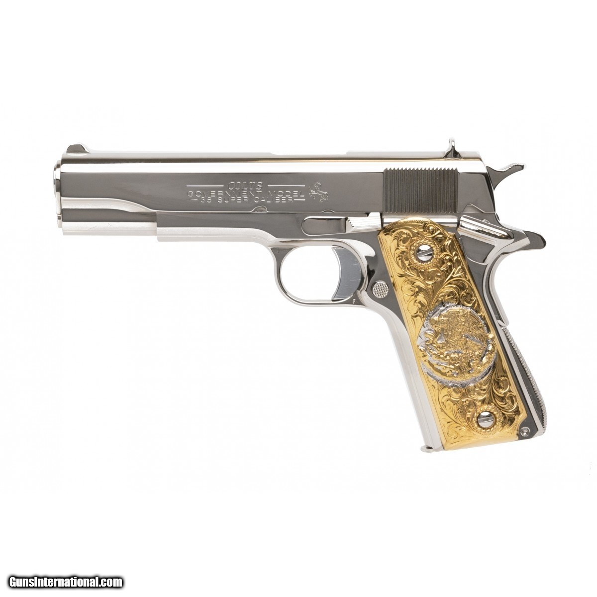 5"" Government model customized with bright nickel finish and gold plated Mexican style grips. Popular .38 Super caliber.