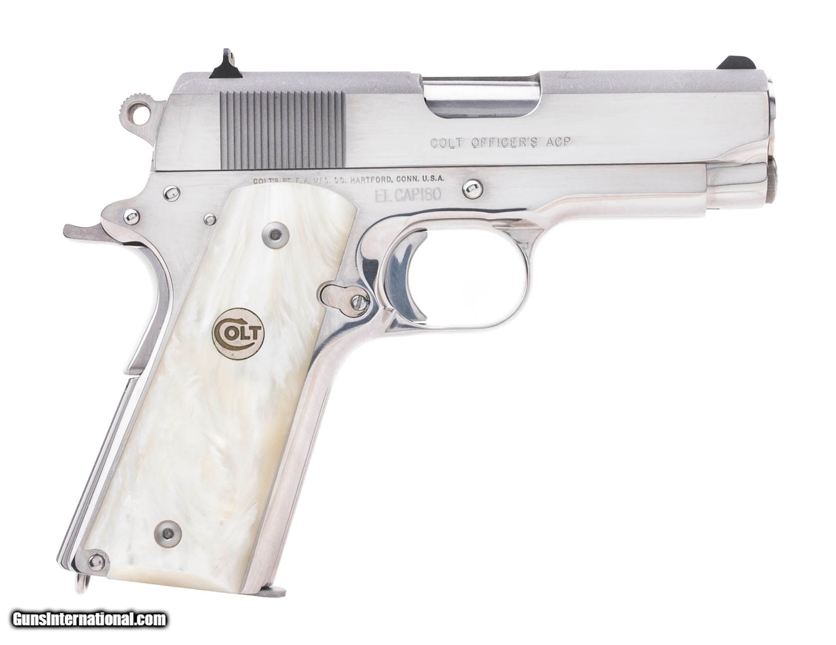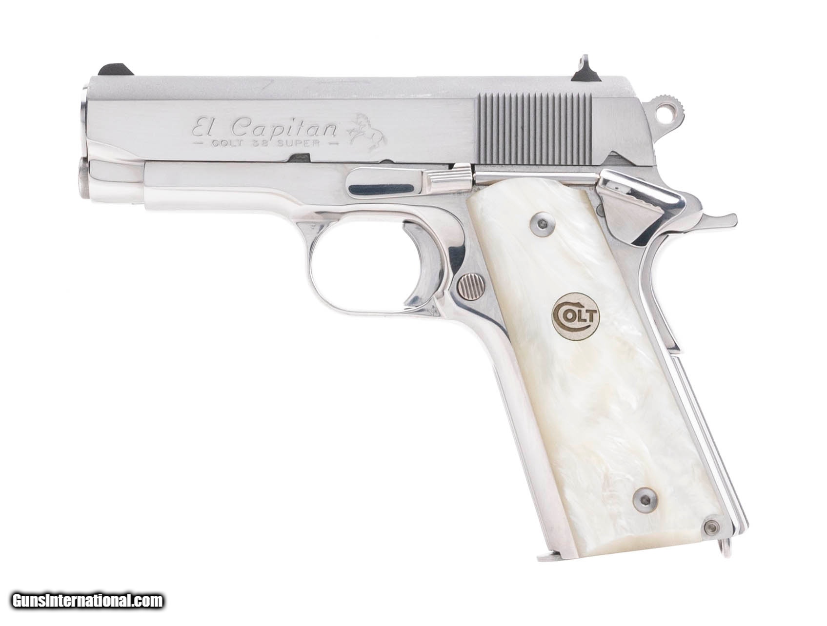 Description: "SN: ELCAP180. Made in 1991. .38 Super with a 3.5"" barrel. Bore is bright with strong rifling. Rare El Capitan 1 of 500 1911, issued by Lew Horton. Metal is in very good condition with light handling wear. Colt pearlite grips are in excellent condition. Overall very good condition. SOLD |