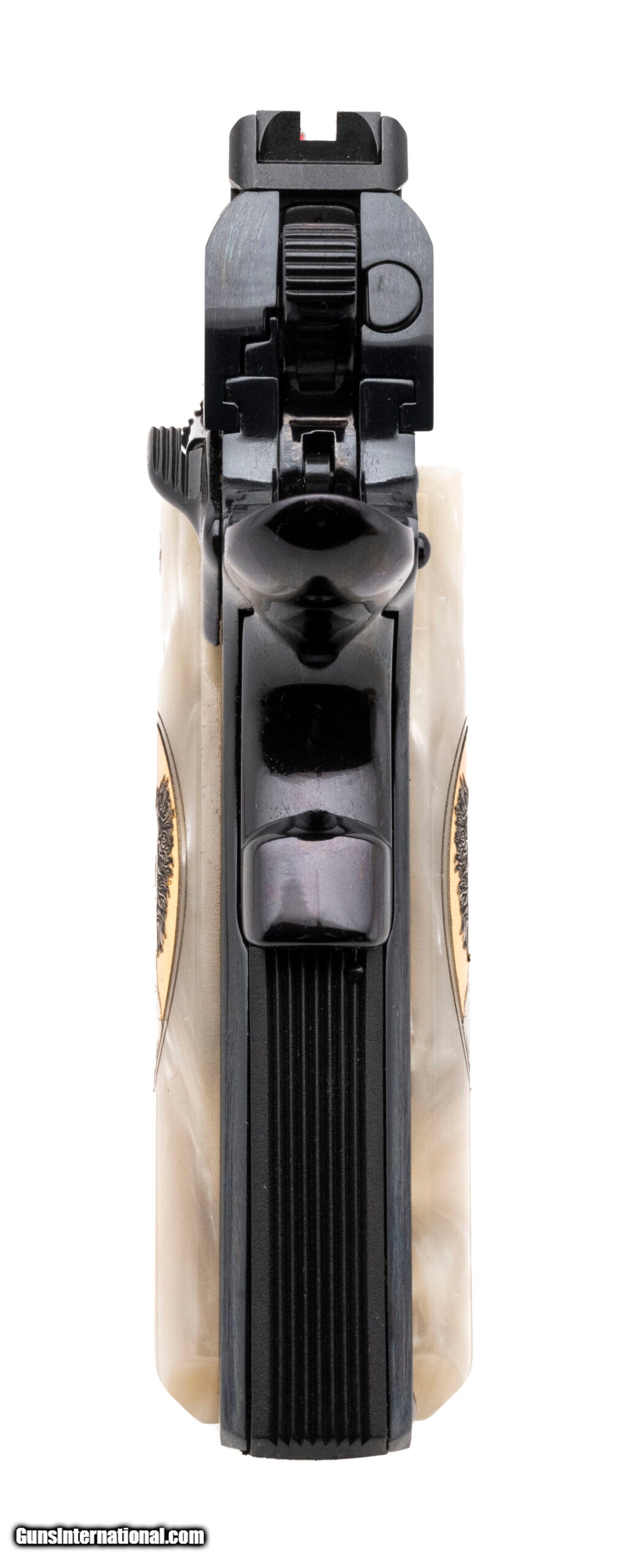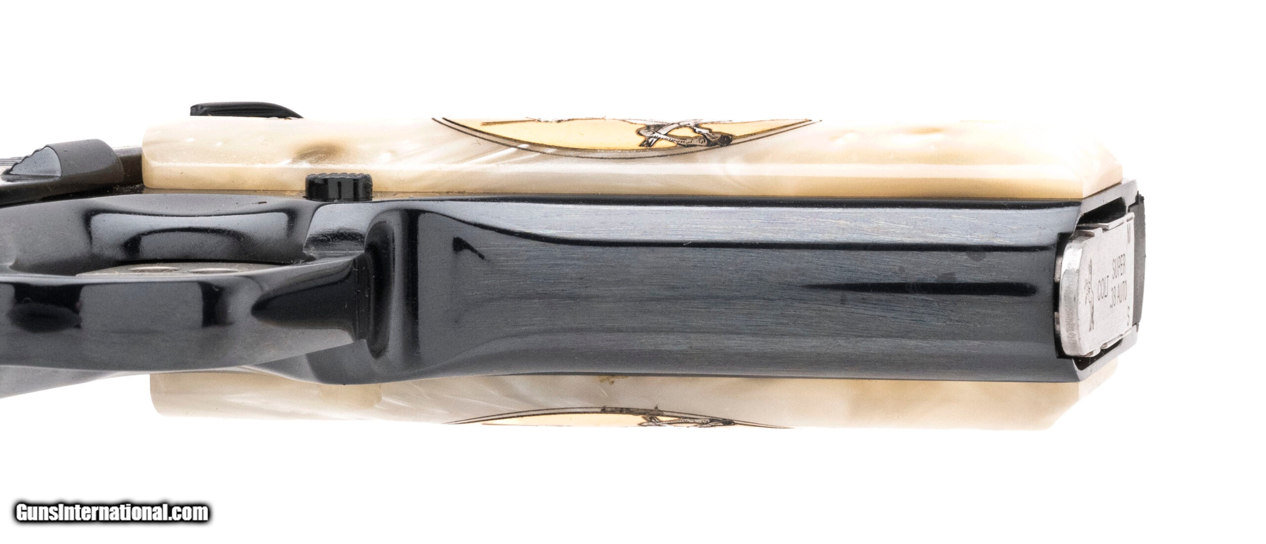 Description: "SN: EPI00324. Modern production .38 Super with an 5"" National Match Barrel. Bore is bright with excellent rifling. SK Customs Limited Edition, Semi-Auto Government 1911 with Engraving on Slide and Frame, Gold and Silver Plating and Polished Controls. High Polished Blue Finish is in excellent condition. Faux White Pearl with Gold Rampant Colt Grips are in very good condition with slight handling wear present. Overall condition is excellent, Comes with case. SOLD |