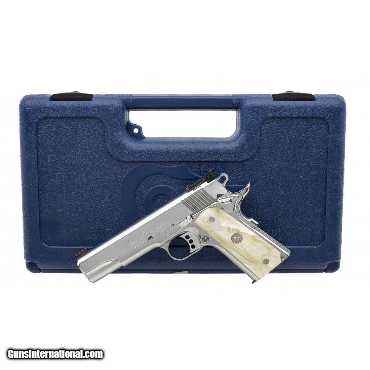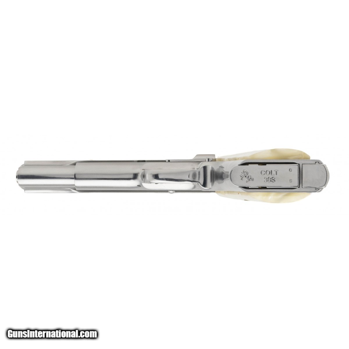 Description: " SN: GV060264. Modern production. .38 Super with a 5"" barrel. Bore is in excellent condition. Scarce stainless steel .38 Super target model with custom high polish finish. Metal is in excellent condition. Has fancy faux pearl grips. Overall condition is excellent. Comes with case and blue factory grips. SOLD |