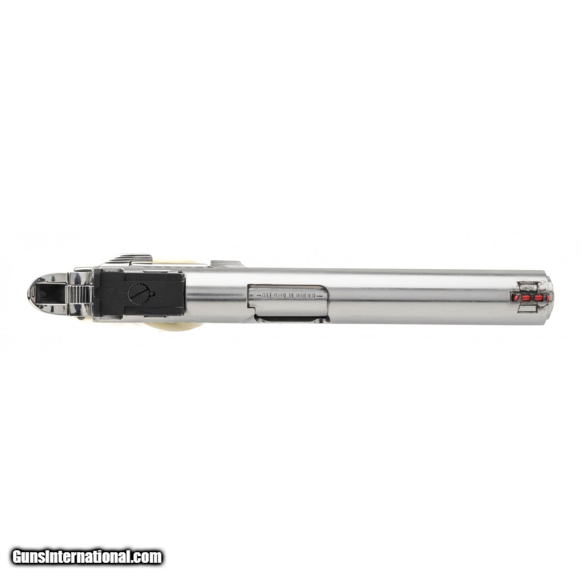 SN: GV060264. Modern production. .38 Super with a 5"" barrel. Bore is in excellent condition. Scarce stainless steel .38 Super target model with custom high polish finish. Metal is in excellent condition. Has fancy faux pearl grips. Overall condition is excellent. Comes with case and blue factory grips.