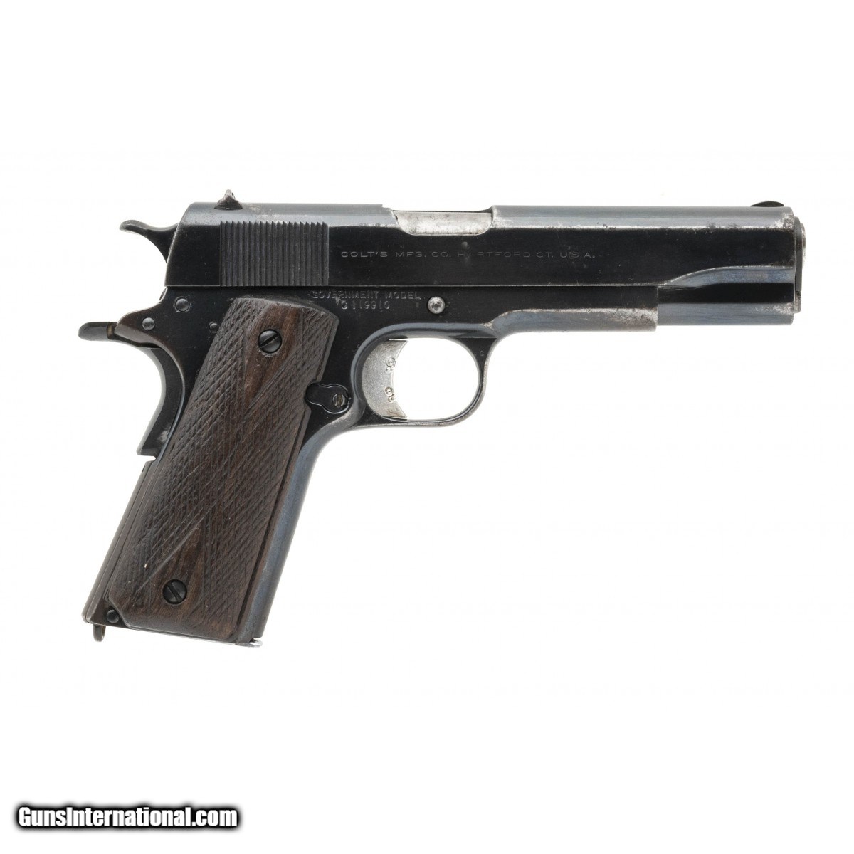 Description: " SN:C119910. Made in 1919, .45 ACP, 5"" barrel. Refinished Government Model with a replacement safety in overall good condition with an excellent bore. Comes with one seven-round magazine & diamond wood grips. SOLD |