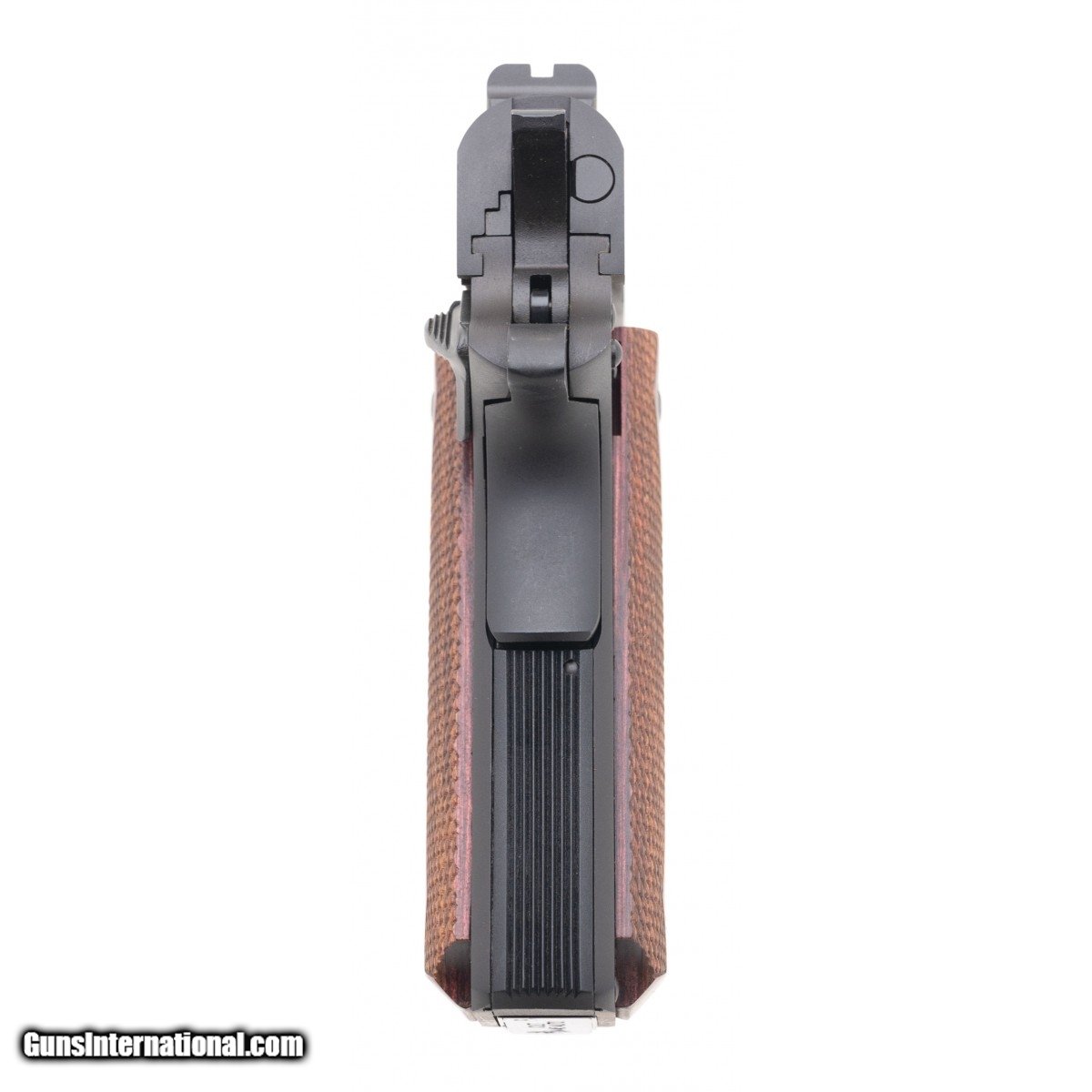 Description: " SN: GV212001. Modern production. .45 ACP with a 5"" barrel. Bore is excellent. Steel frame Government 1911. Blue finish and wood checkered grips are in excellent condition. Overall excellent condition. SOLD |