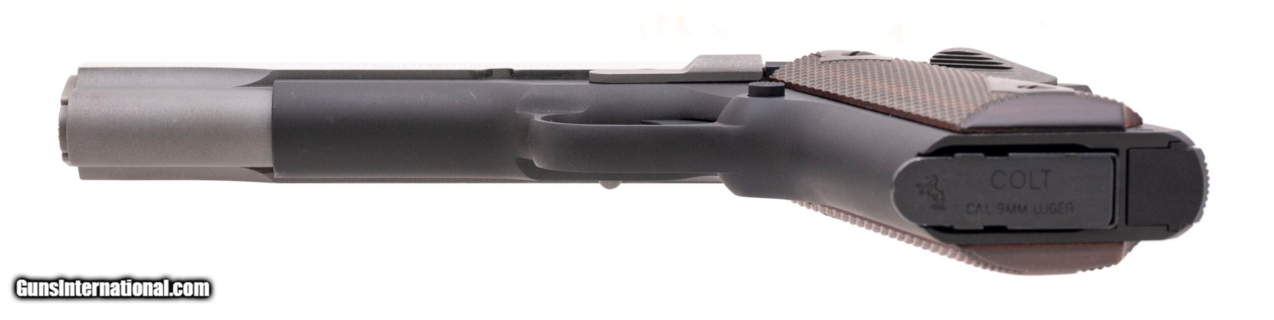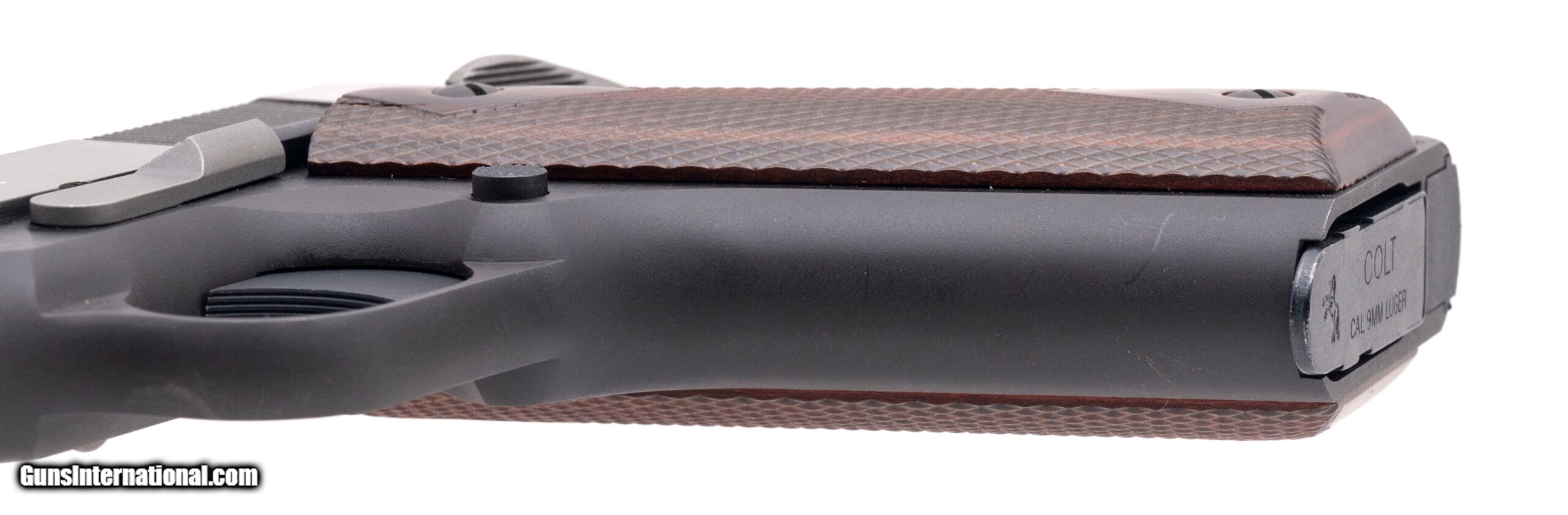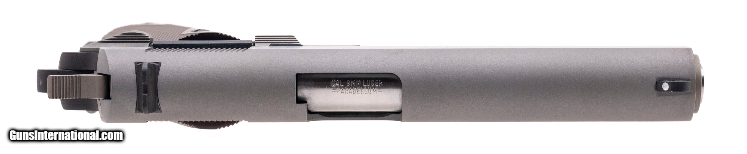 Description: "SN: NN05904. Modern production, 9mm with a 5"" barrel. Bore is bright with strong rifling. Scare two tone model steel frame 1911 with checkered wood grips. Overall condition is excellent. Comes with case and extra magazine. SOLD |