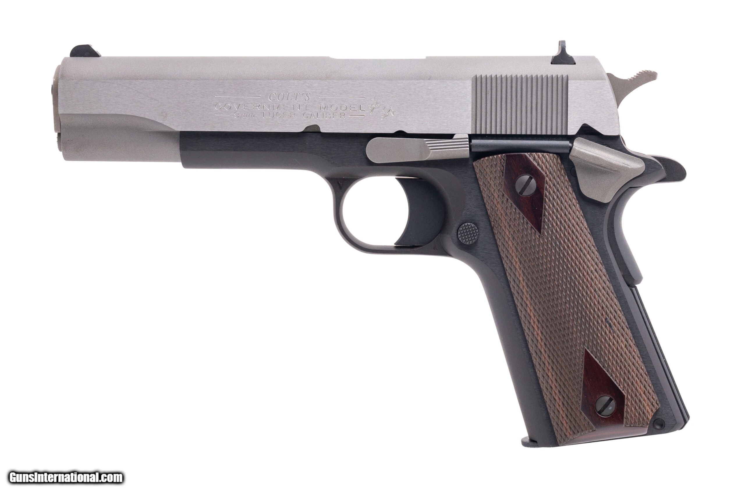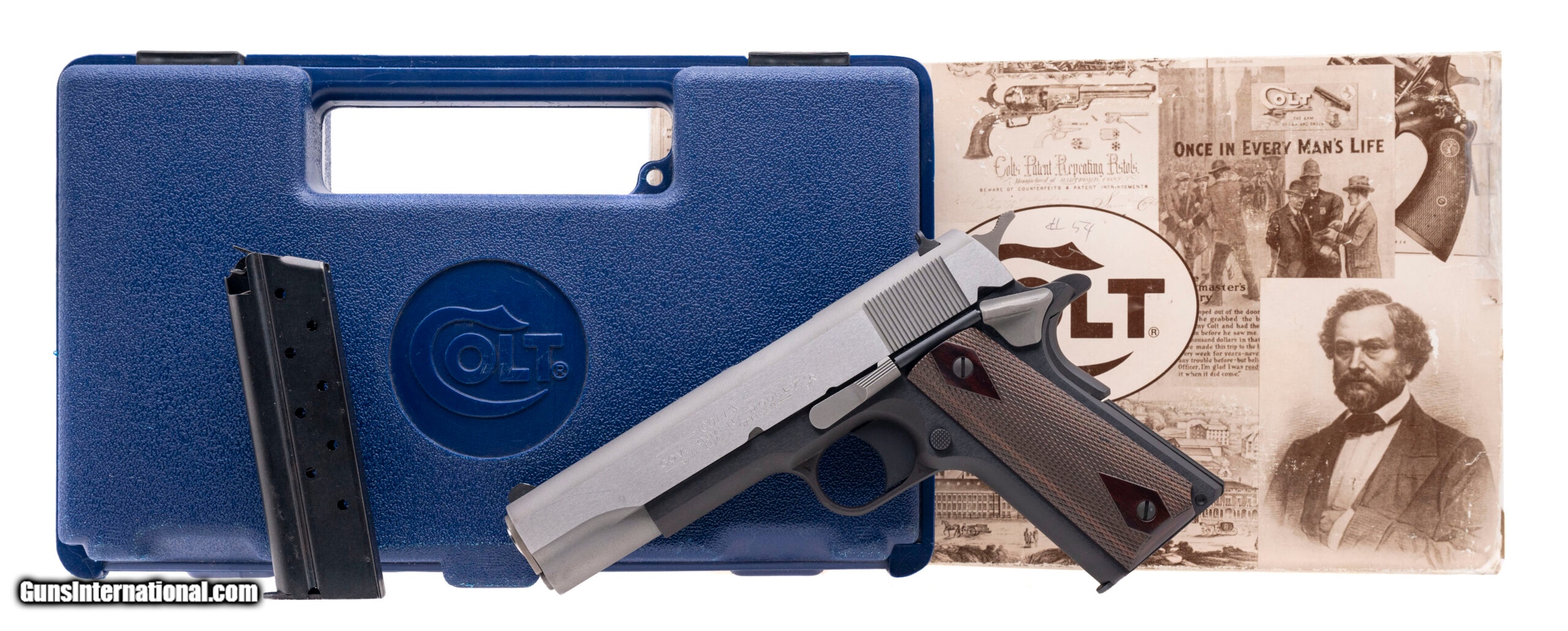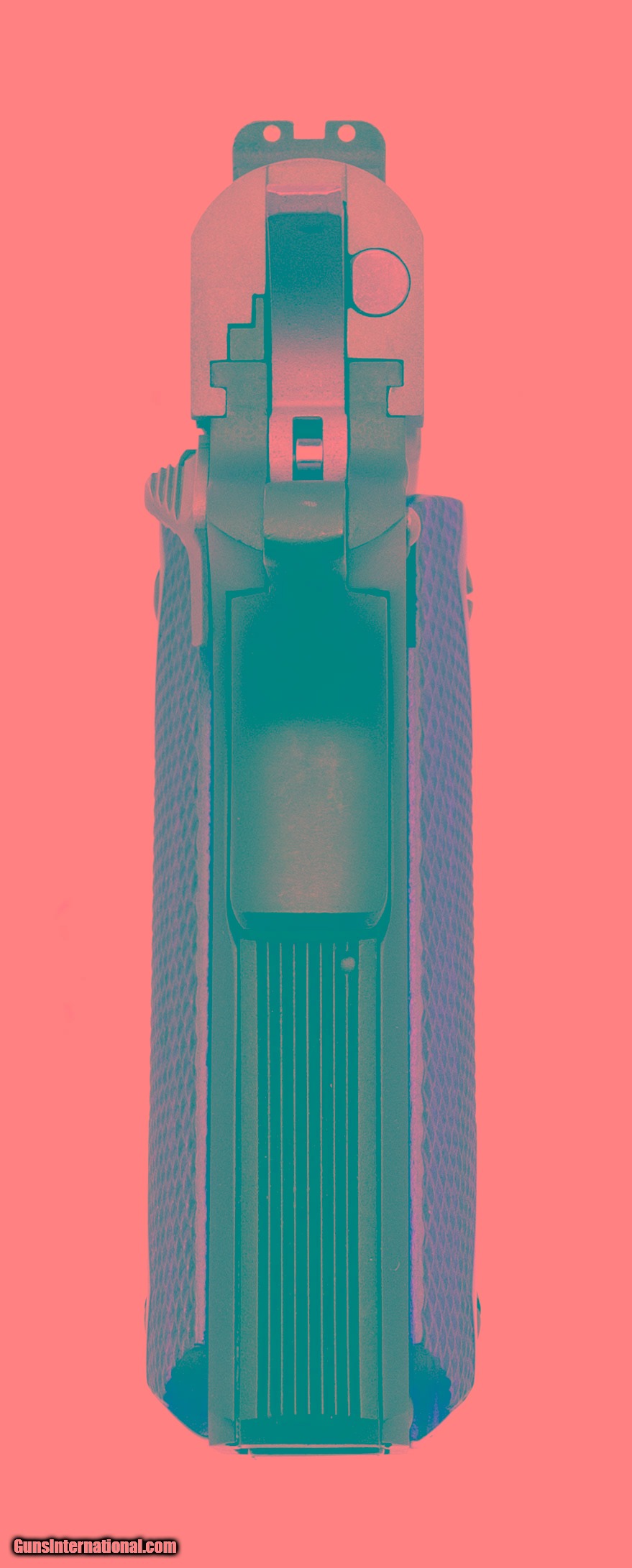 Description: "SN: NN05904. Modern production, 9mm with a 5"" barrel. Bore is bright with strong rifling. Scare two tone model steel frame 1911 with checkered wood grips. Overall condition is excellent. Comes with case and extra magazine. SOLD |
