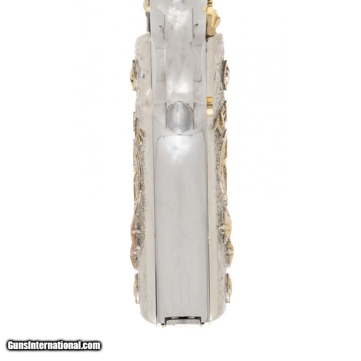 Description: " Custom engraved bright stainless Colt .38 Super. Has scroll engraving, gold plated small parts and fancy silver and gold plated Texas grips. A real beauty! SOLD |