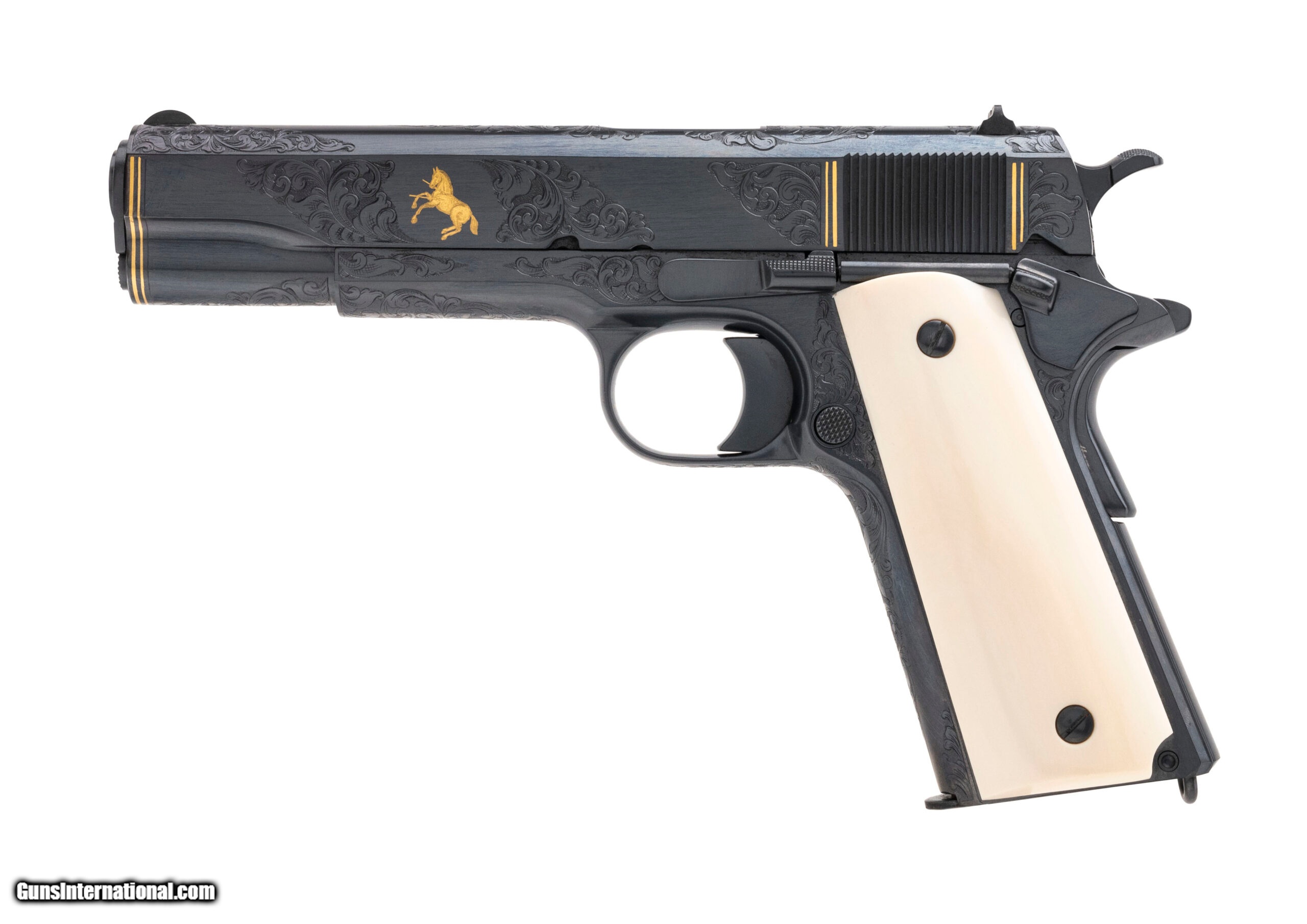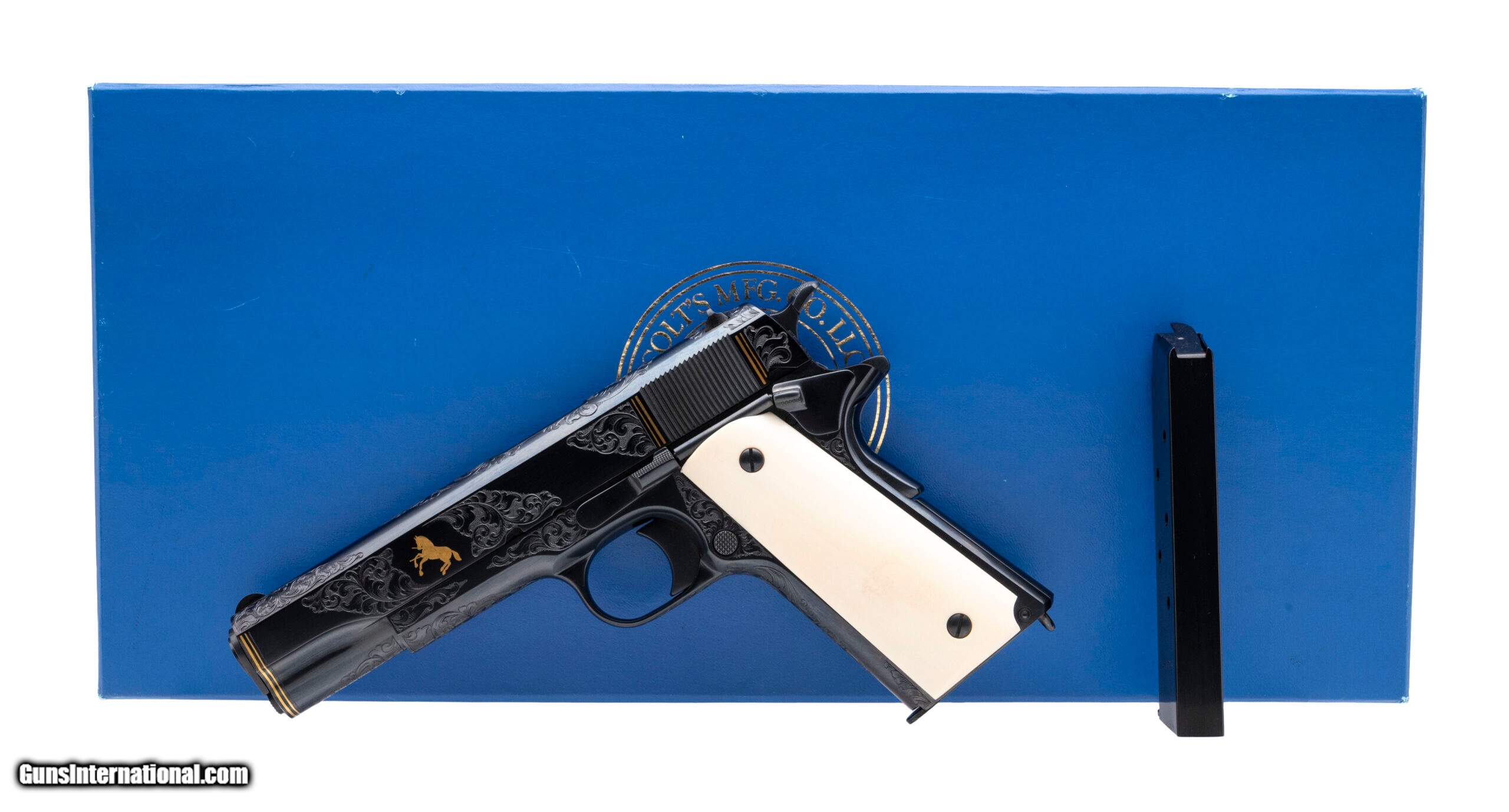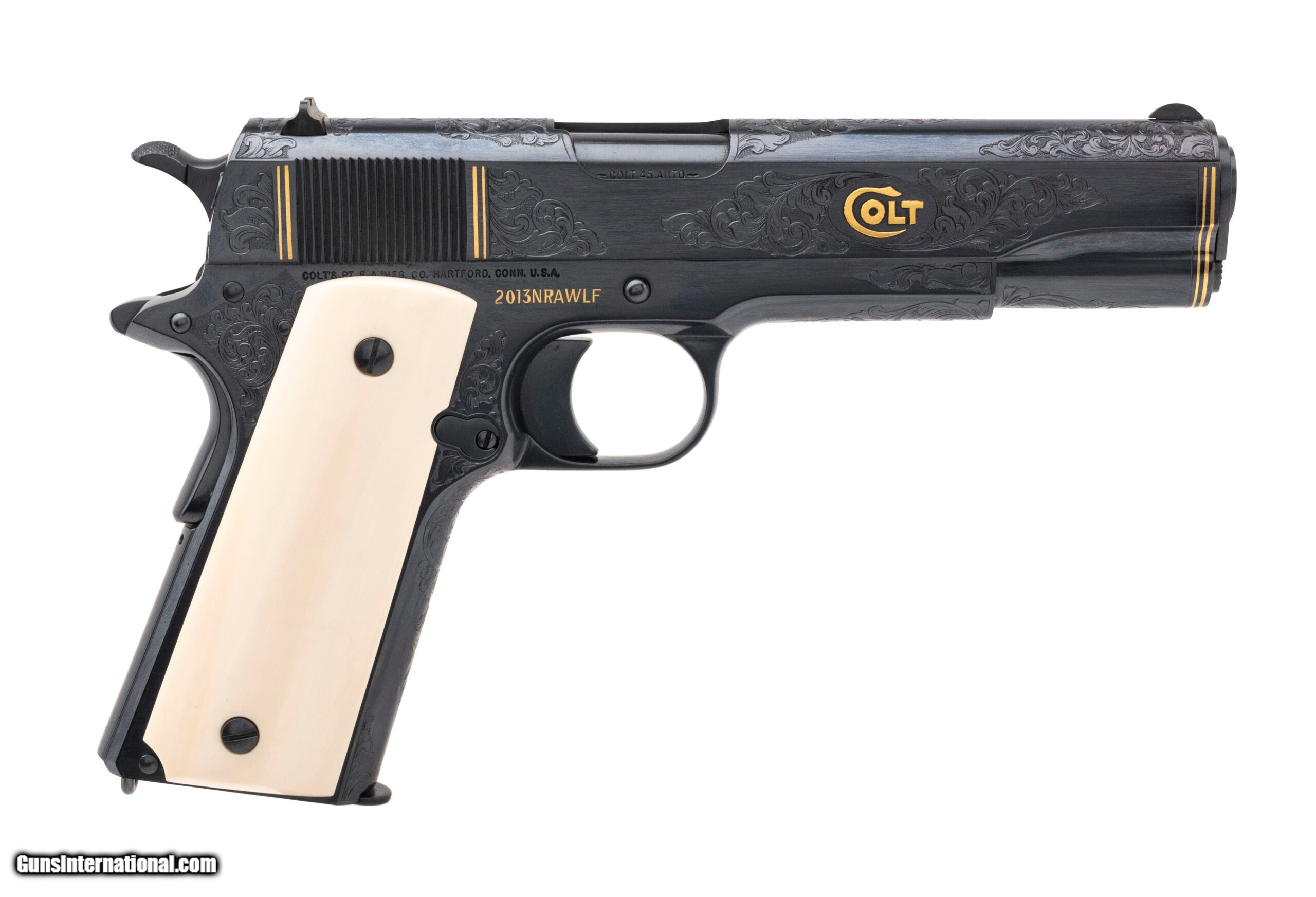 Description: "SN: 2013NRAWLF. Modern production .45 ACP with a 5"" barrel. Beautiful factory engraved 1911 with royal blue finish, scroll engraving and gold inlay. The grips are smooth ivory. The gun is engraved and signed by Master Engraver Steve Kamyk. An outstanding example, in excellent condition with box. SOLD |