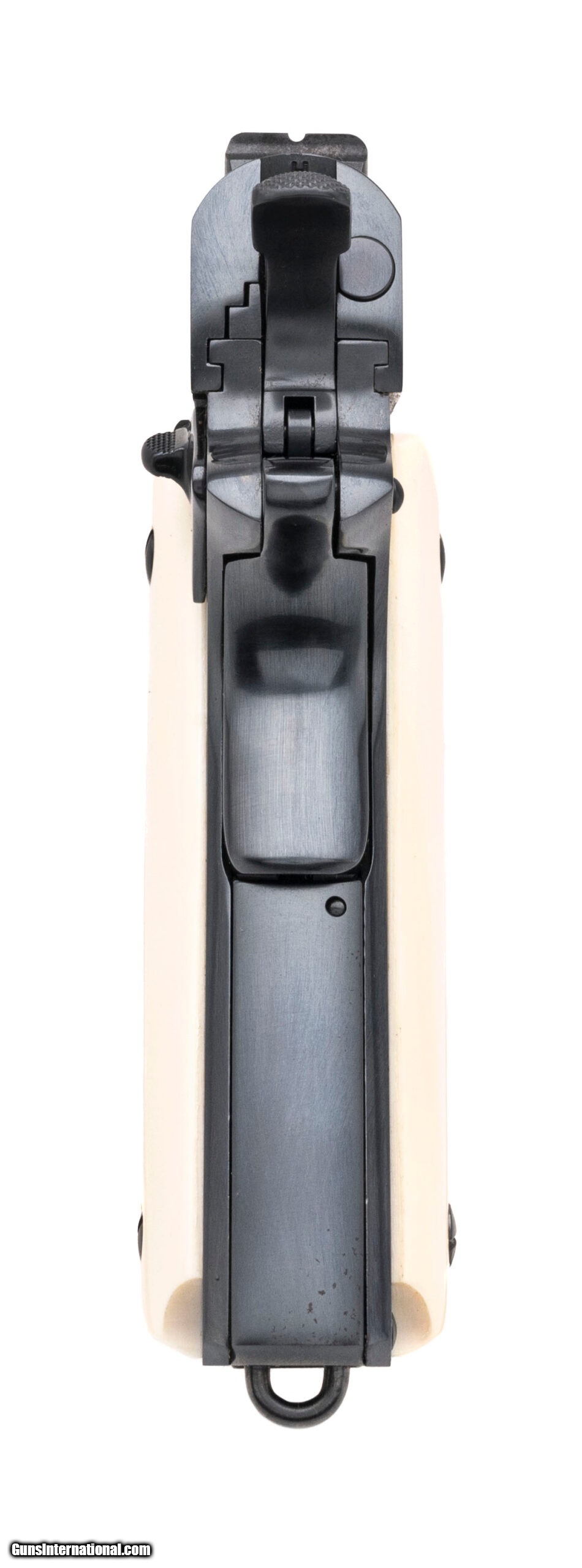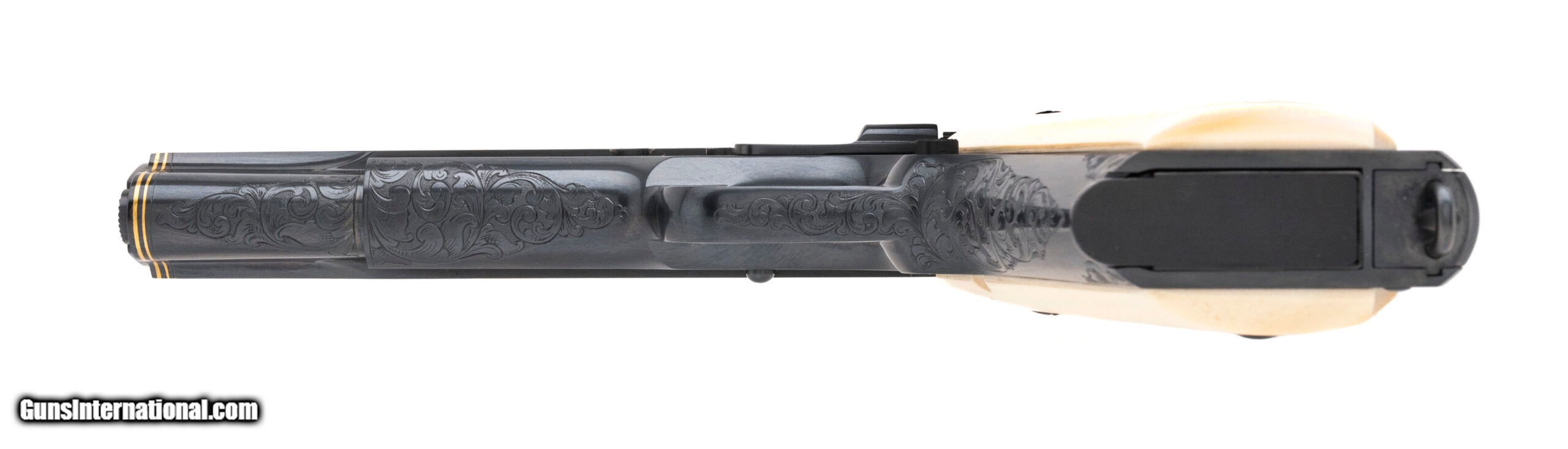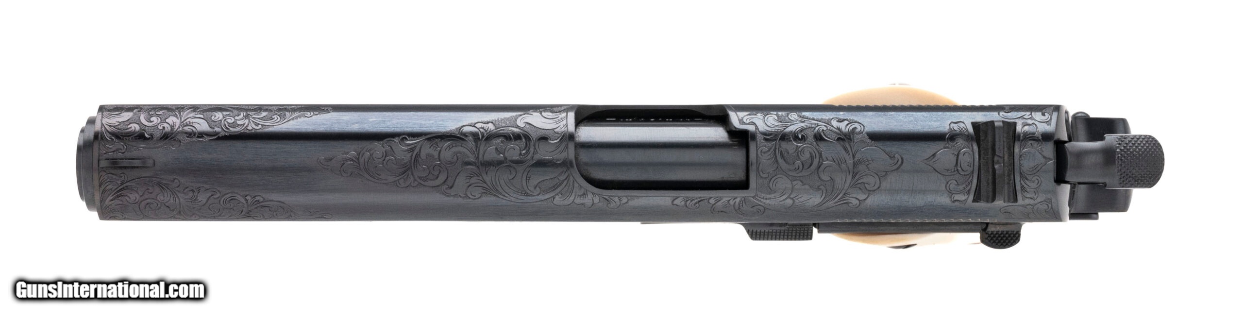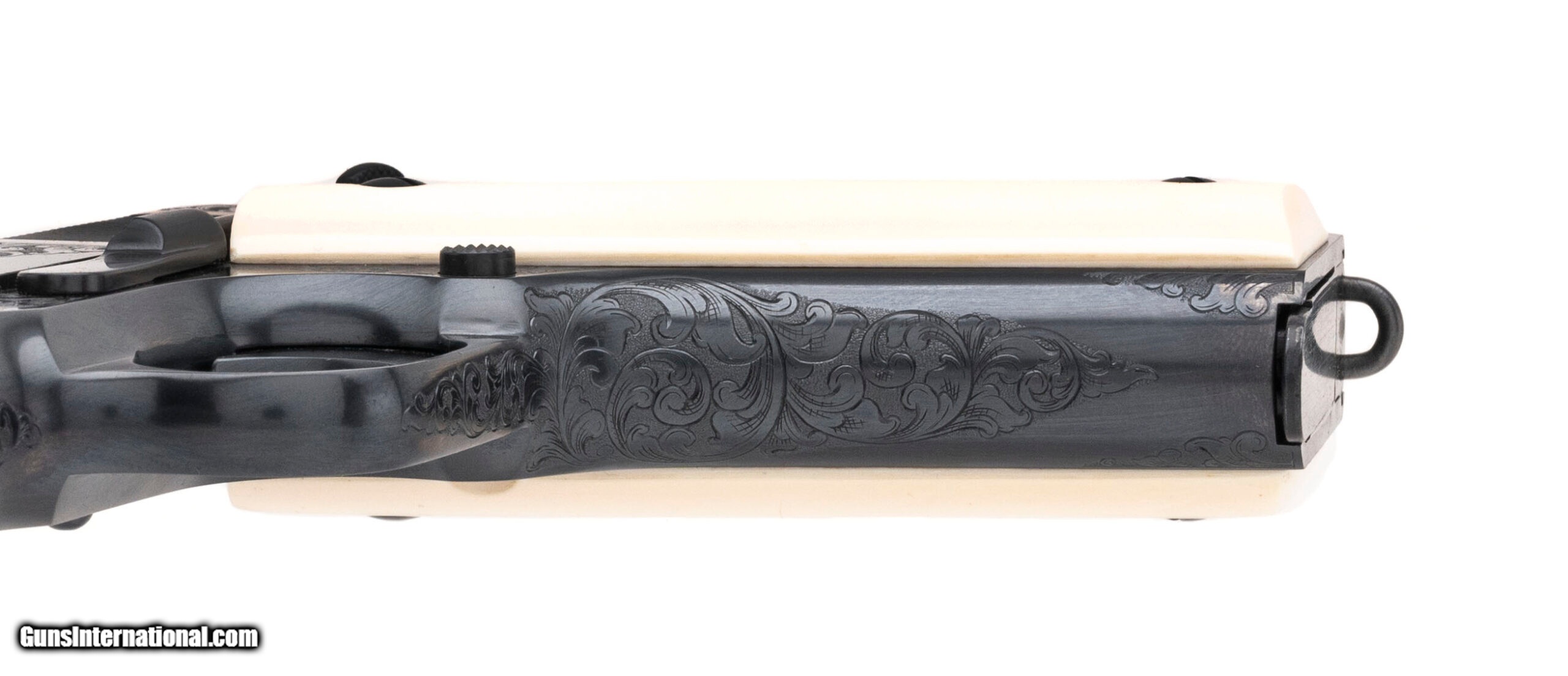 Description: "SN: 2013NRAWLF. Modern production .45 ACP with a 5"" barrel. Beautiful factory engraved 1911 with royal blue finish, scroll engraving and gold inlay. The grips are smooth ivory. The gun is engraved and signed by Master Engraver Steve Kamyk. An outstanding example, in excellent condition with box. SOLD |