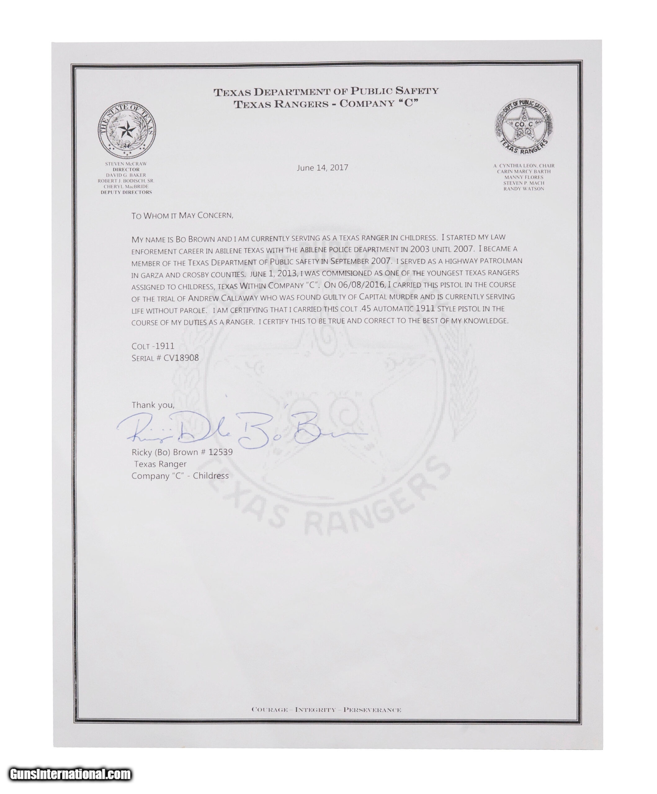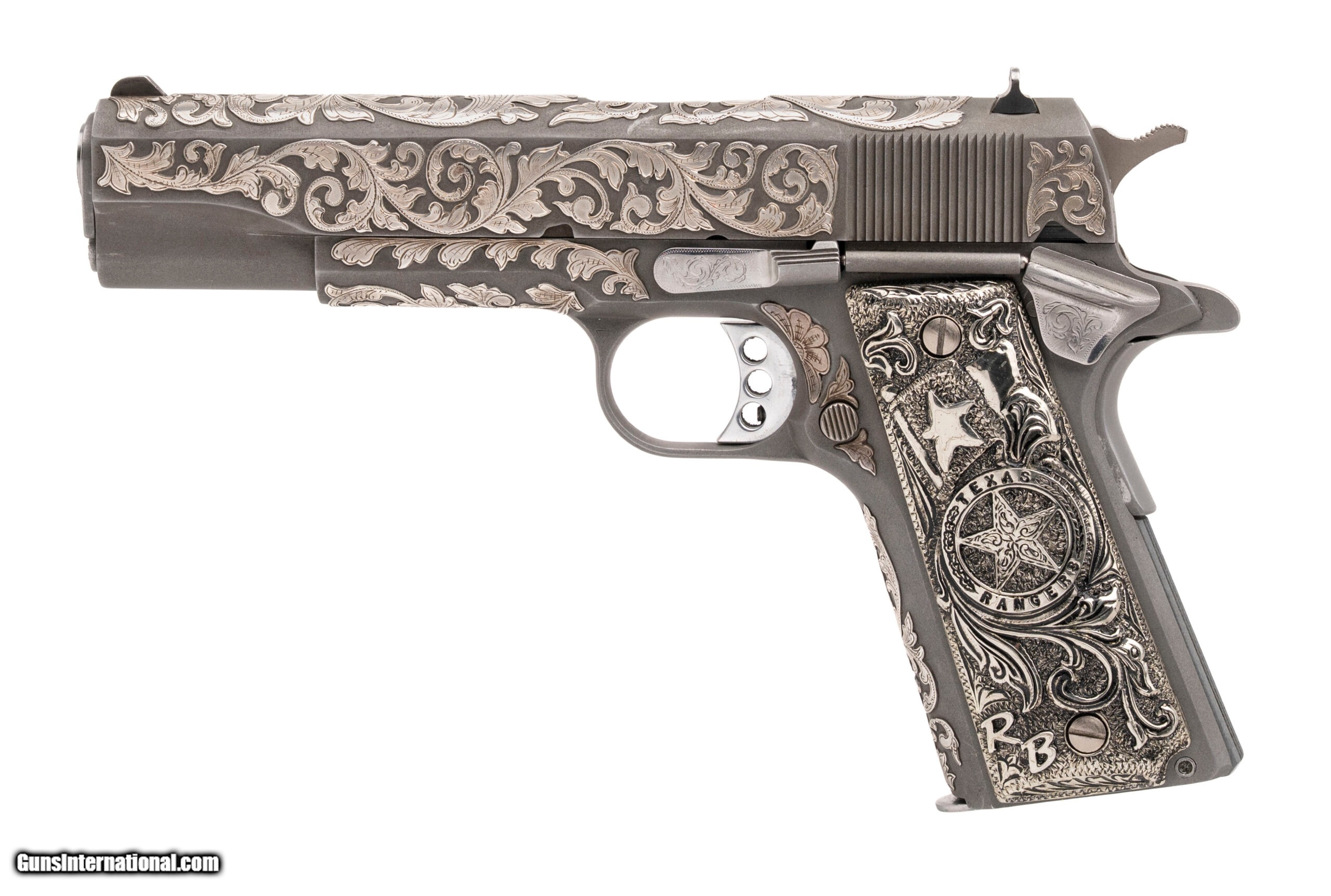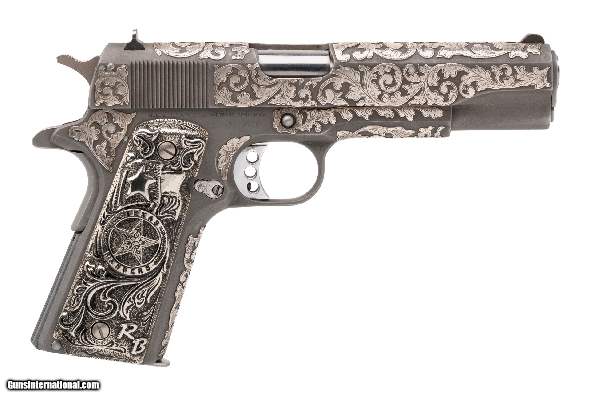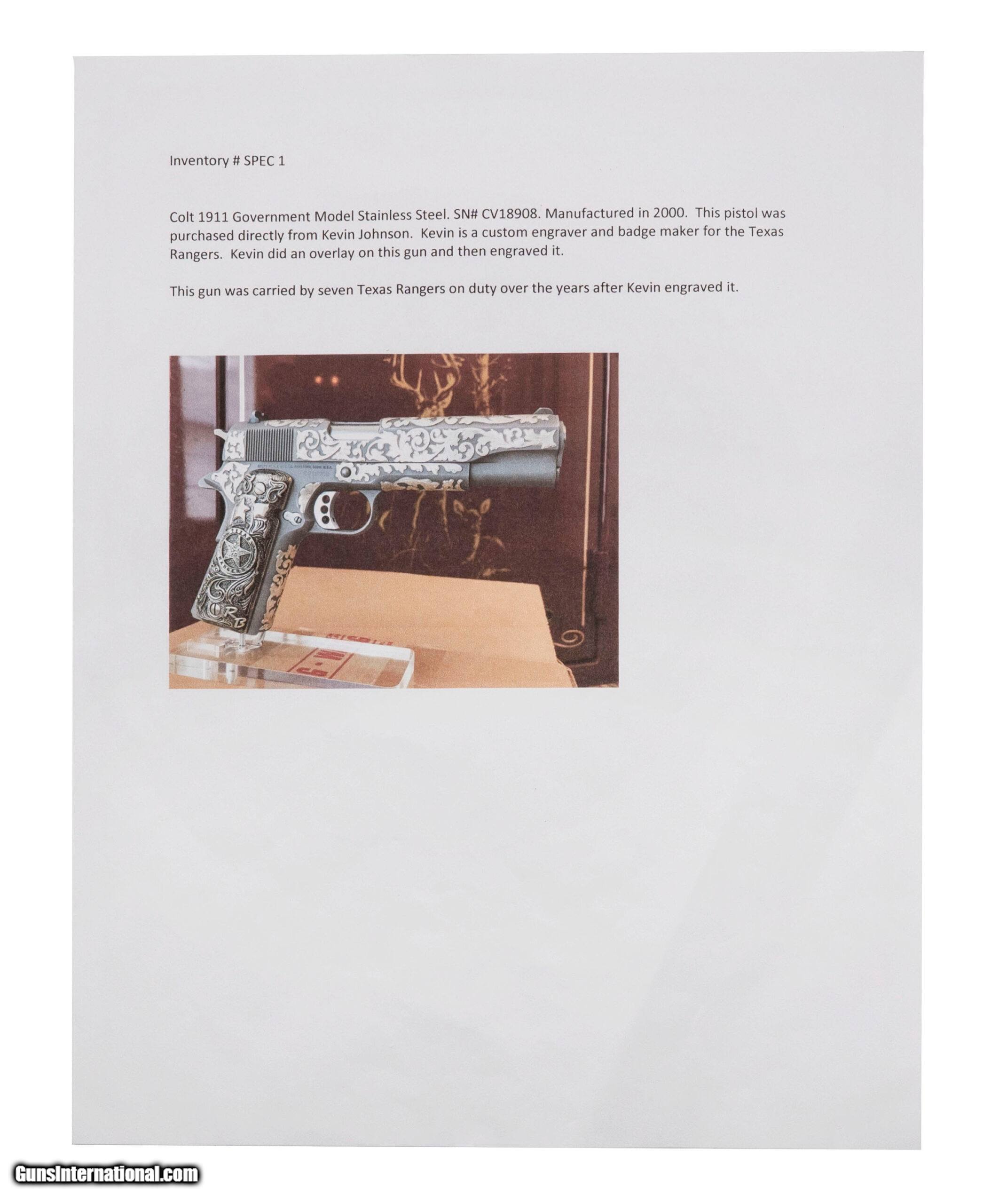 Description: "SN: CV18908. Made in 2000, .45ACP with a 5"" barrel. Outstanding Texas Ranger owned Colt 1911. Renowned Texas Ranger engraver and badge maker Kevin Johnson engraved and inlaid the pistol, and made the Texas Ranger badge style grips. The gun was carried by Texas Ranger Ricky ""Bo"" Brown and is accompanied by a letter on Ranger letterhead attesting so. The grips have the initials ""RB"" inlaid into them. The gun is a beautiful work of art and is in excellent condition. Price: $13,999.95 Contact Seller |