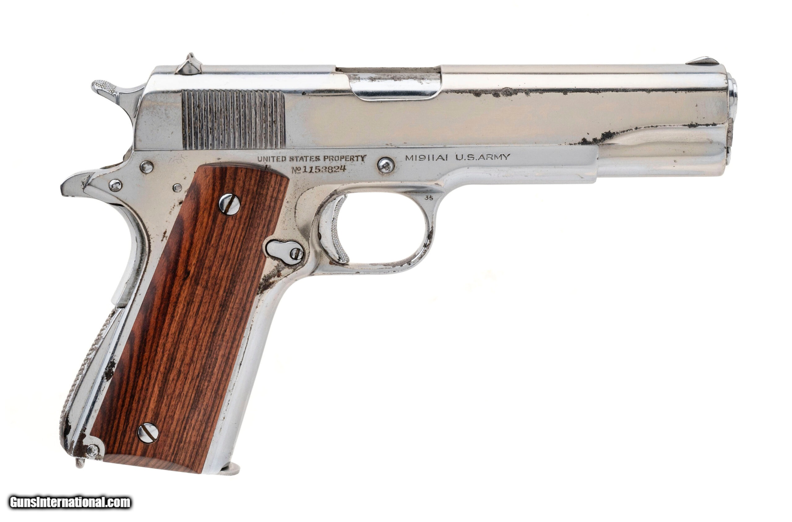 Description: "SN: 1153824. Made in 1943, .45 Auto with a 5"" barrel. Bore is bright with strong rifling. World War II U.S. Property marked Government size 1911. Gun was refinished with chrome polish. Finish shows wear but is overall fair condition. Wood grips are in excellent condition. Overall condition is fair. Comes with case and extra magazine. (Consignment) SOLD |