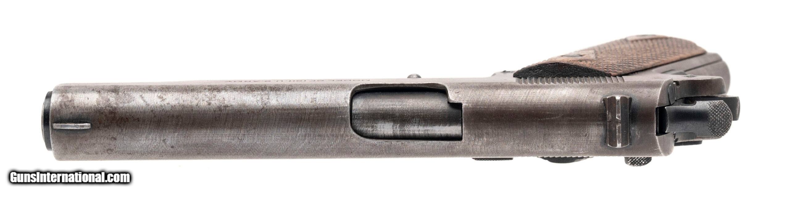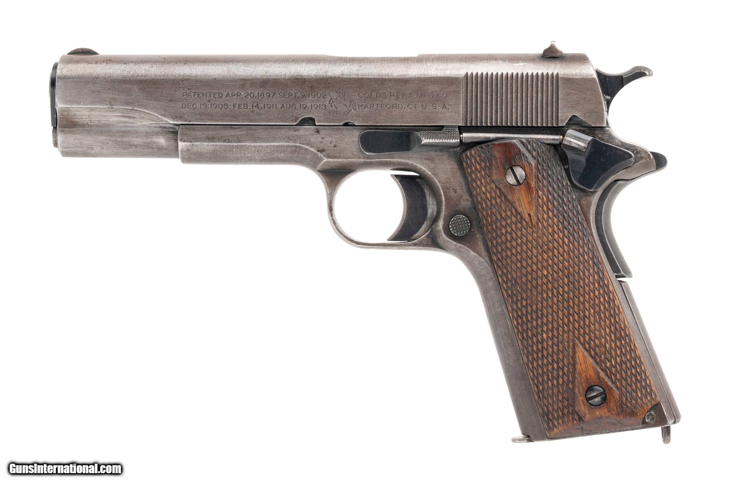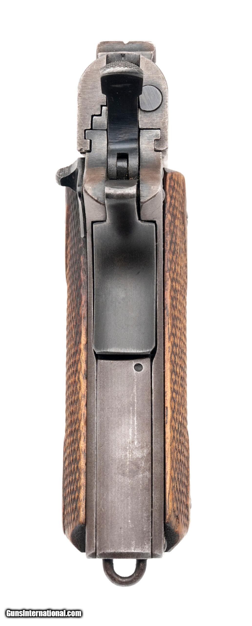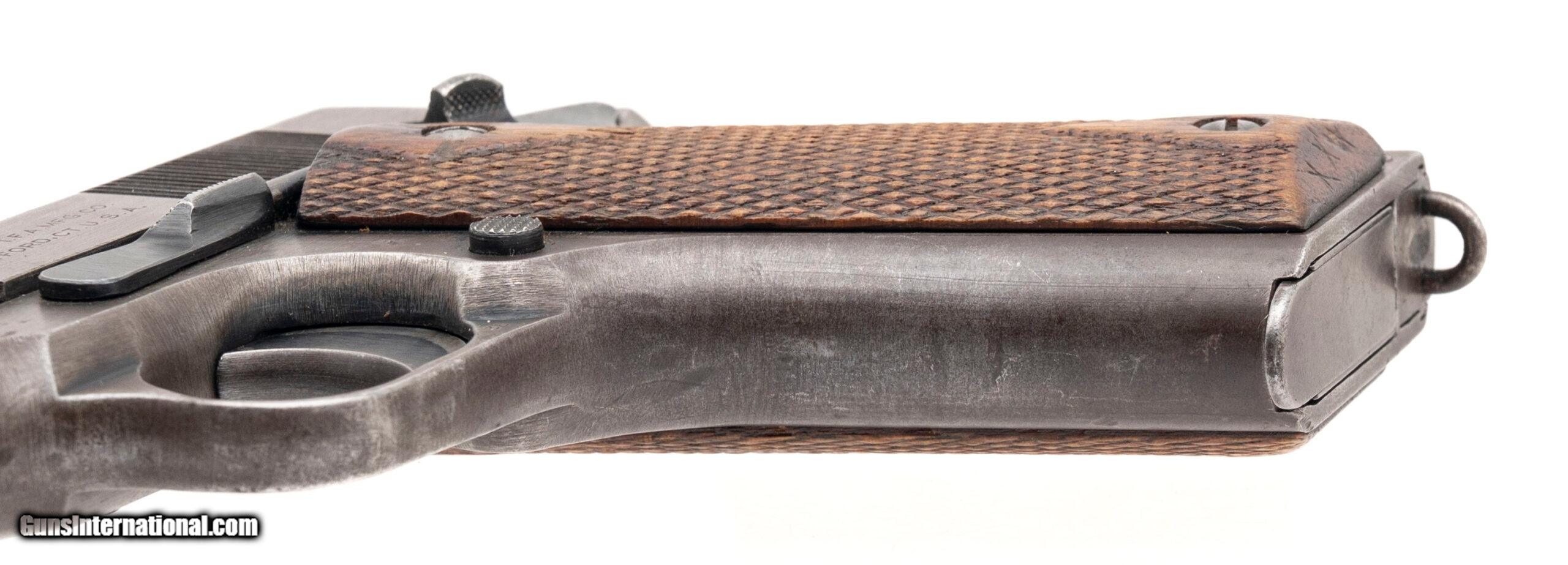 Description: "Serial No. 603586, manufactured in 1919, .45 ACP, 5" round barrel. Metal has turned to a smooth grey patina. Several external parts have been replaced with later production pieces. Factory markings on slide and frame are sharp. Wooden checkered grips have been lightly refurbished. Action is smooth and functions correctly. SOLD |