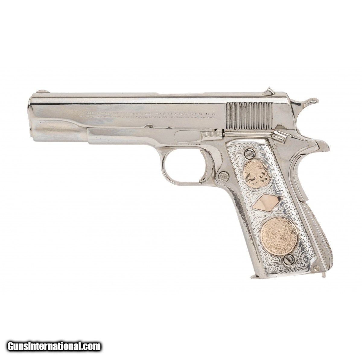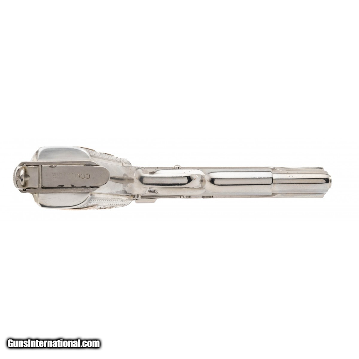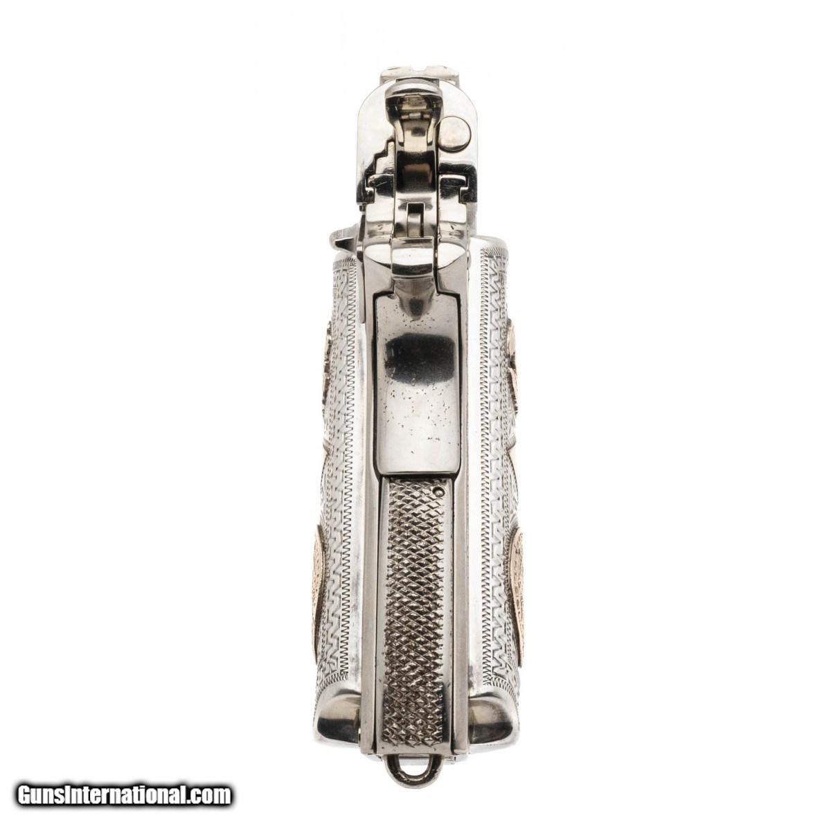 SN: 2554. Made in 1929, .38 Super with a 5"" barrel. Bore is very good. Rare and desirable pre-war Super 38 Colt, made in the first year of production. The gun has been re-nickeled and the markings are still mostly clear and legible. There's some light pit marks remaining, and the grip frame has some wear, otherwise the metal is very good. The grips are old Mexican made engraved silver and gold grips. A great looking Colt Super 38.