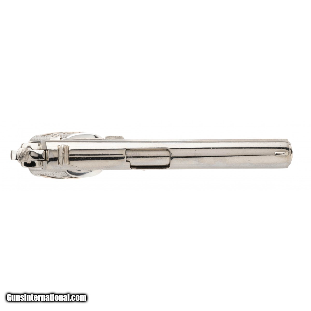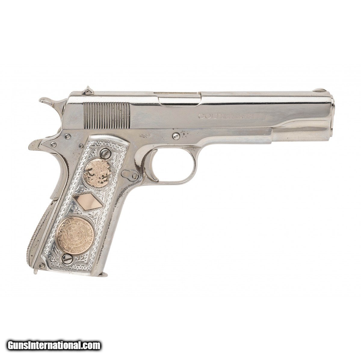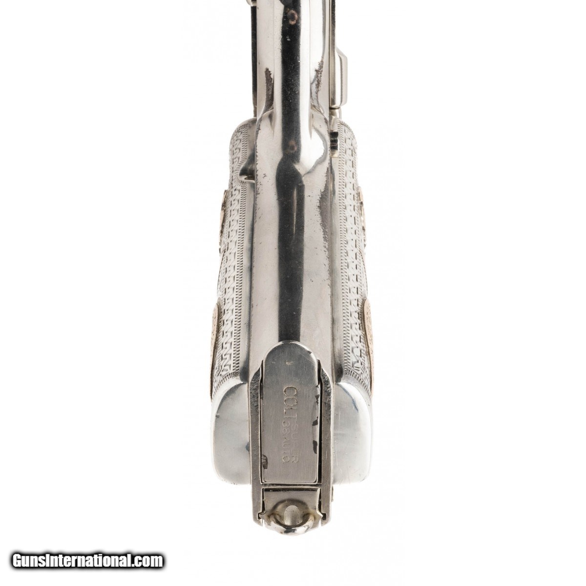 SN: 2554. Made in 1929, .38 Super with a 5"" barrel. Bore is very good. Rare and desirable pre-war Super 38 Colt, made in the first year of production. The gun has been re-nickeled and the markings are still mostly clear and legible. There's some light pit marks remaining, and the grip frame has some wear, otherwise the metal is very good. The grips are old Mexican made engraved silver and gold grips. A great looking Colt Super 38.