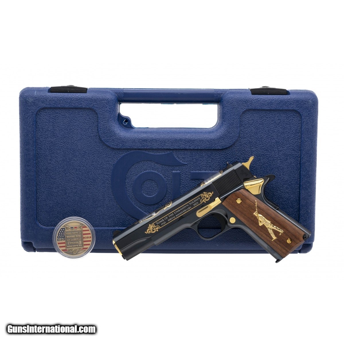 Description: "SN: 182-TOTUS. Modern production .45 ACP with a 5"" barrel. 1 of 500 Limited Edition 1911 pistol celebrating the 100th anniversary of the Tomb of the Unknown Soldier. Has a high polish blue finish with gold decorations and an inlaid vignette of the Tomb. A gorgeous piece, in perfect condition with box and commemorative coin. SOLD |