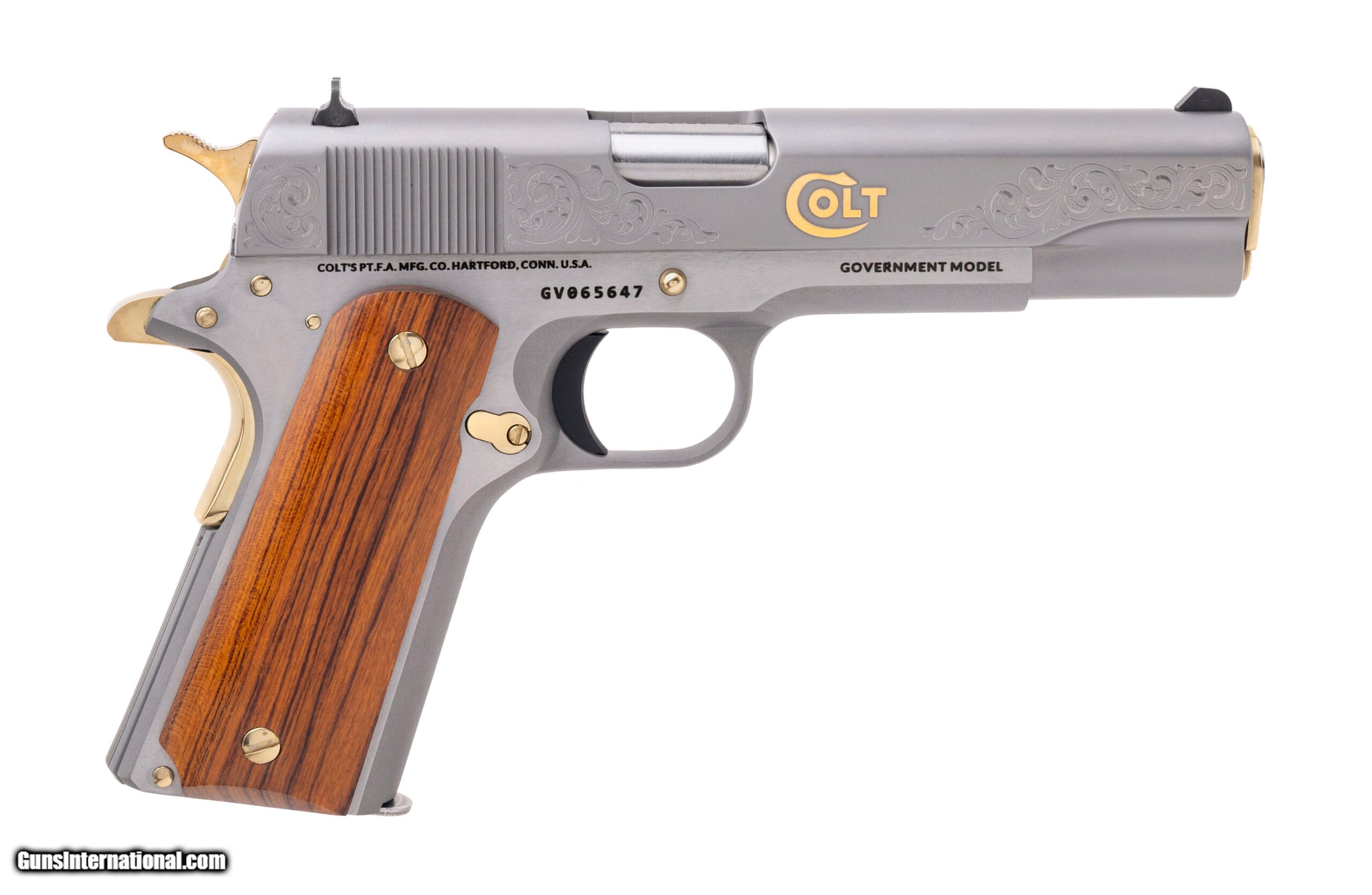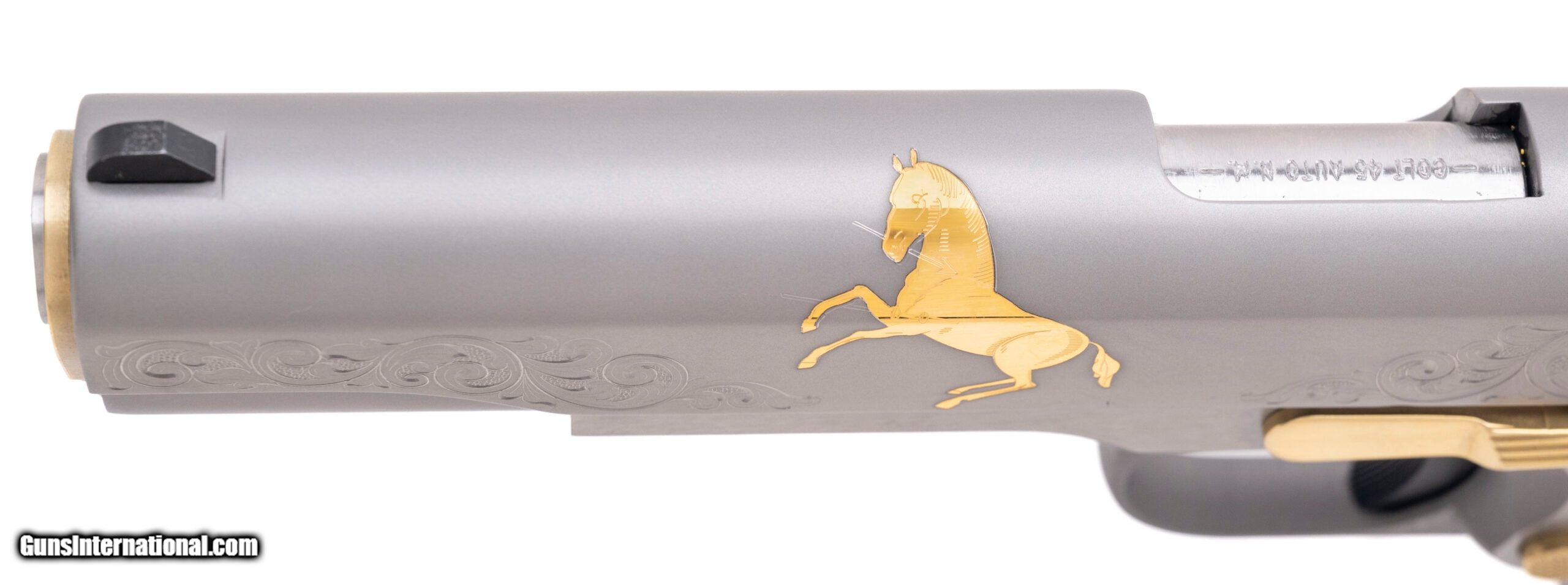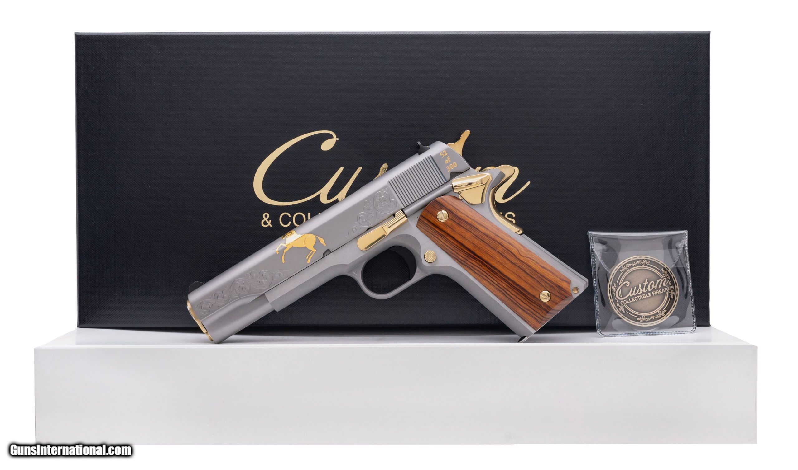Description: "CNC Limited Edition Colt Rampant 1911 Pistol .45 Auto. One of 300 Made Government Size 1911 with a 5"" Barrel. Stainless Steel w/ Engravings, Wood Grips, and Gold Accents. NEW. UPC: CNCCOLTRAMP (STOCK PHOTO) SOLD |