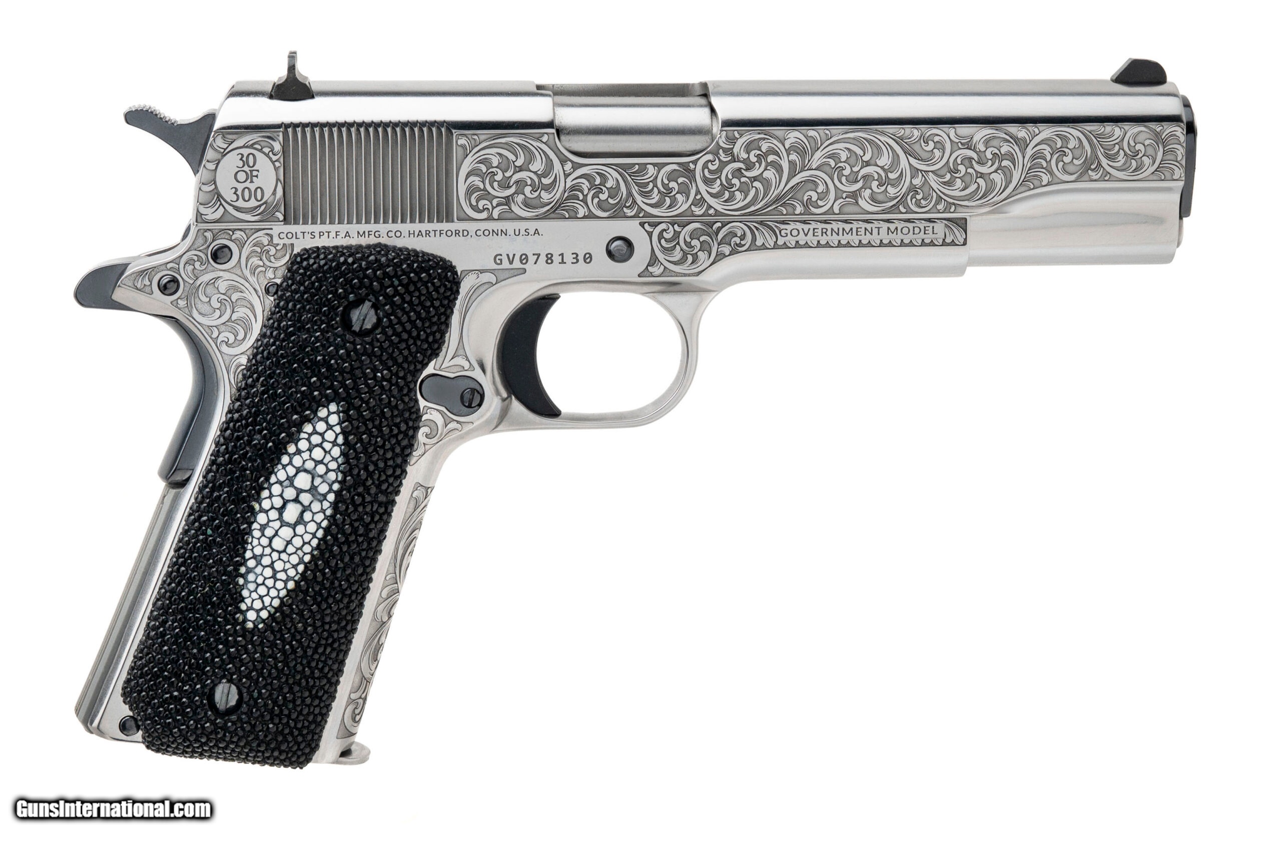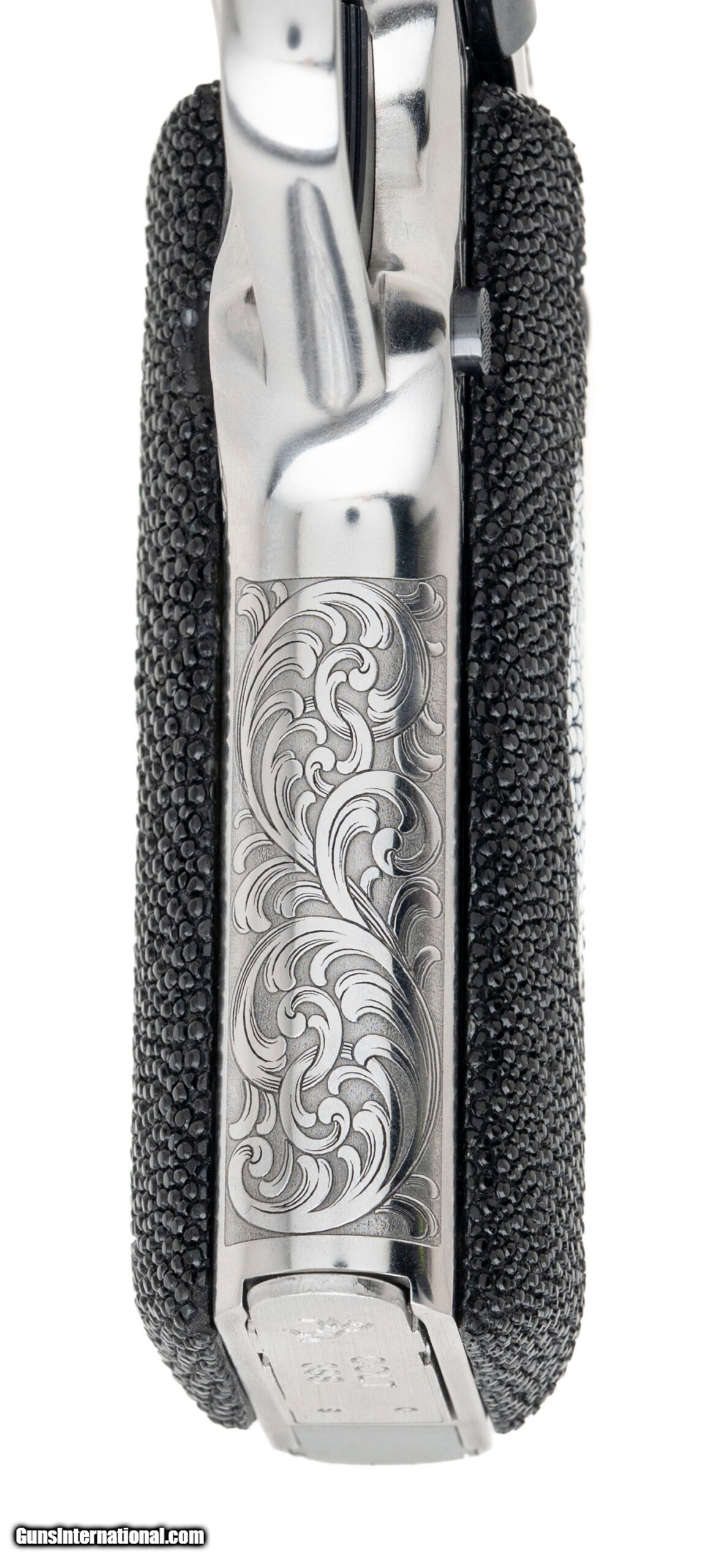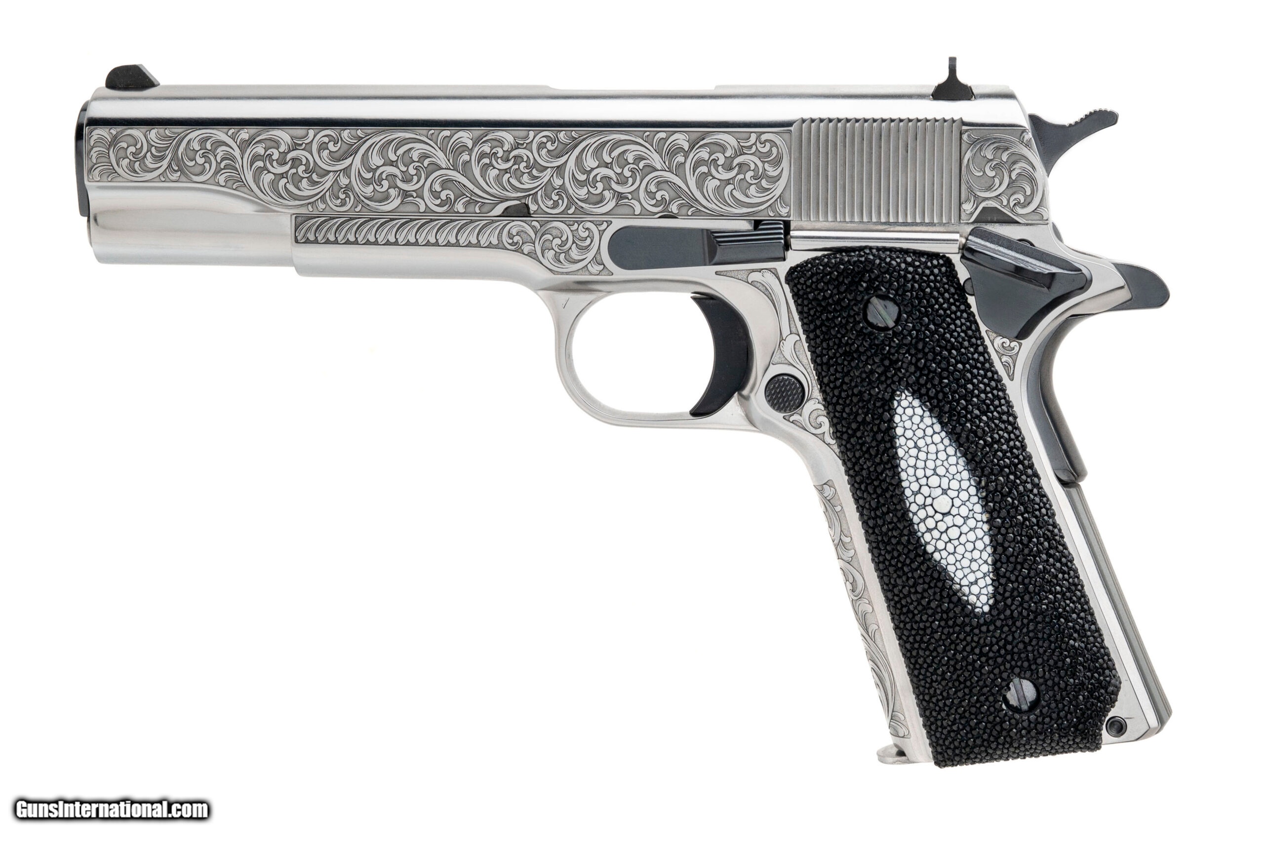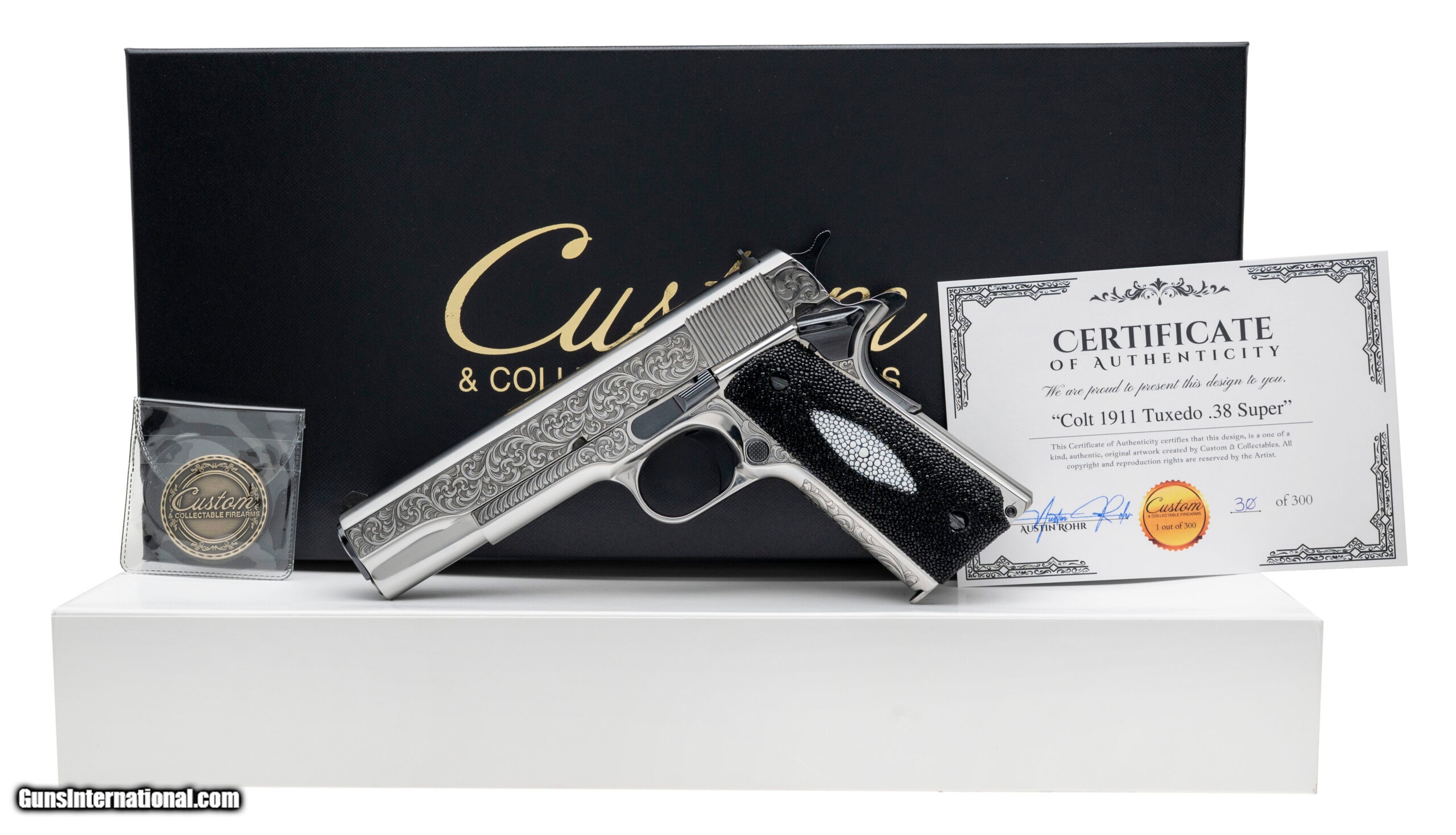 Description: "One of 300 Made Custom 1911 with a 5"" Barrel. Government Size, High Polished Stainless Steel w/Engravings, High Polish DLC Accents, Stingray Grips. Includes 1-9rd Magazine and a CNC Collectors Coin. NEW. SKU: CNCTUXEDO (STOCK PHOTO) SOLD |