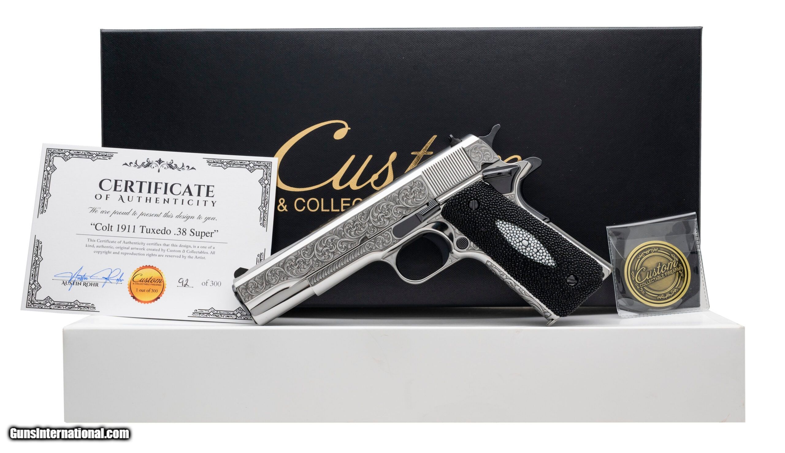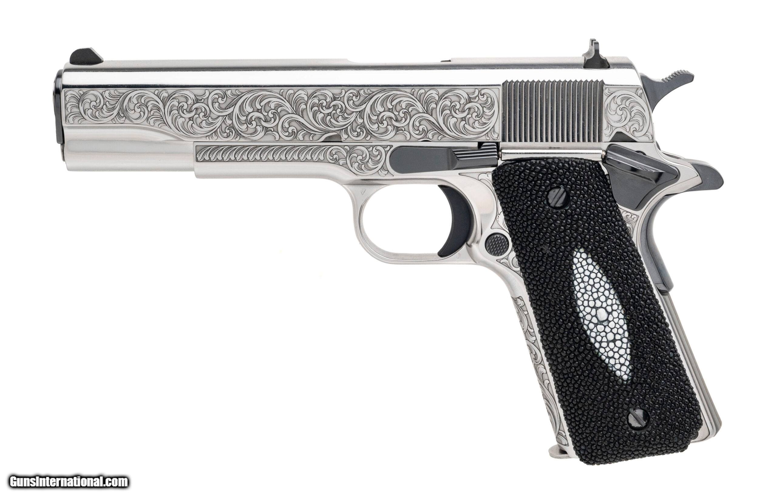 Description: "One of 300 Made Custom 1911 with a 5"" Barrel. Government Size, High Polished Stainless Steel w/Engravings, High Polish DLC Accents, Stingray Grips. Includes 1-9rd Magazine and a CNC Collectors Coin. NEW. SKU: CNCTUXEDO (STOCK PHOTO) Price: $2,599.95 Contact Seller |