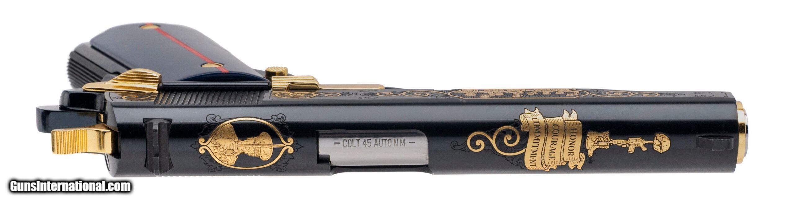Description: "Exclusive Limited Edition Commemorative 1911 Pistol with a 5"" Barrel. Government Size, Series 70, Engraved High Polished Blued Finish with Gold Accents, and Blue Grips w/Red Stripe. Includes 1-7rd Magazine, and Checkered Wood Grips. NEW. UPC: 098289112279 (STOCK PHOTO) Price: $2,499.95 Contact Seller |