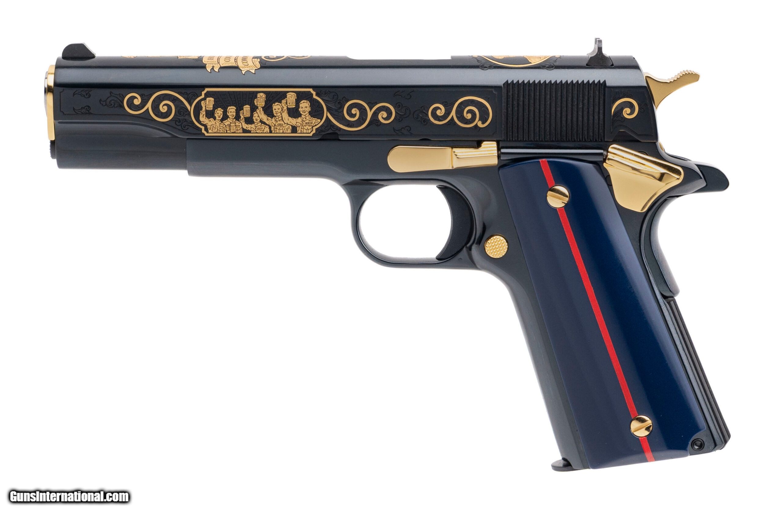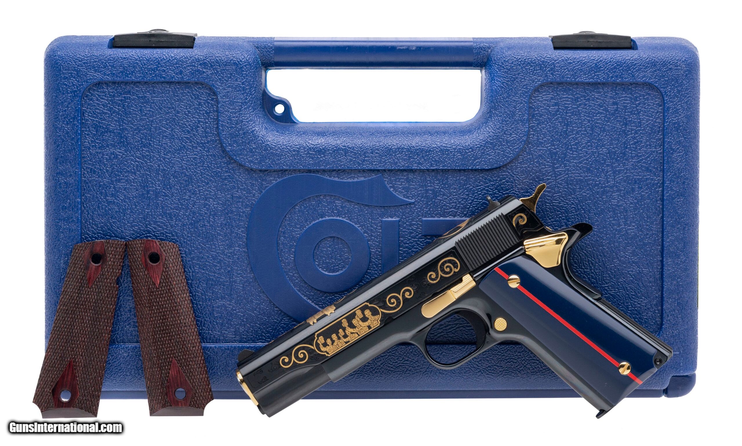 Description: "Exclusive Limited Edition Commemorative 1911 Pistol with a 5"" Barrel. Government Size, Series 70, Engraved High Polished Blued Finish with Gold Accents, and Blue Grips w/Red Stripe. Includes 1-7rd Magazine, and Checkered Wood Grips. NEW. UPC: 098289112279 (STOCK PHOTO) Price: $2,499.95 Contact Seller |