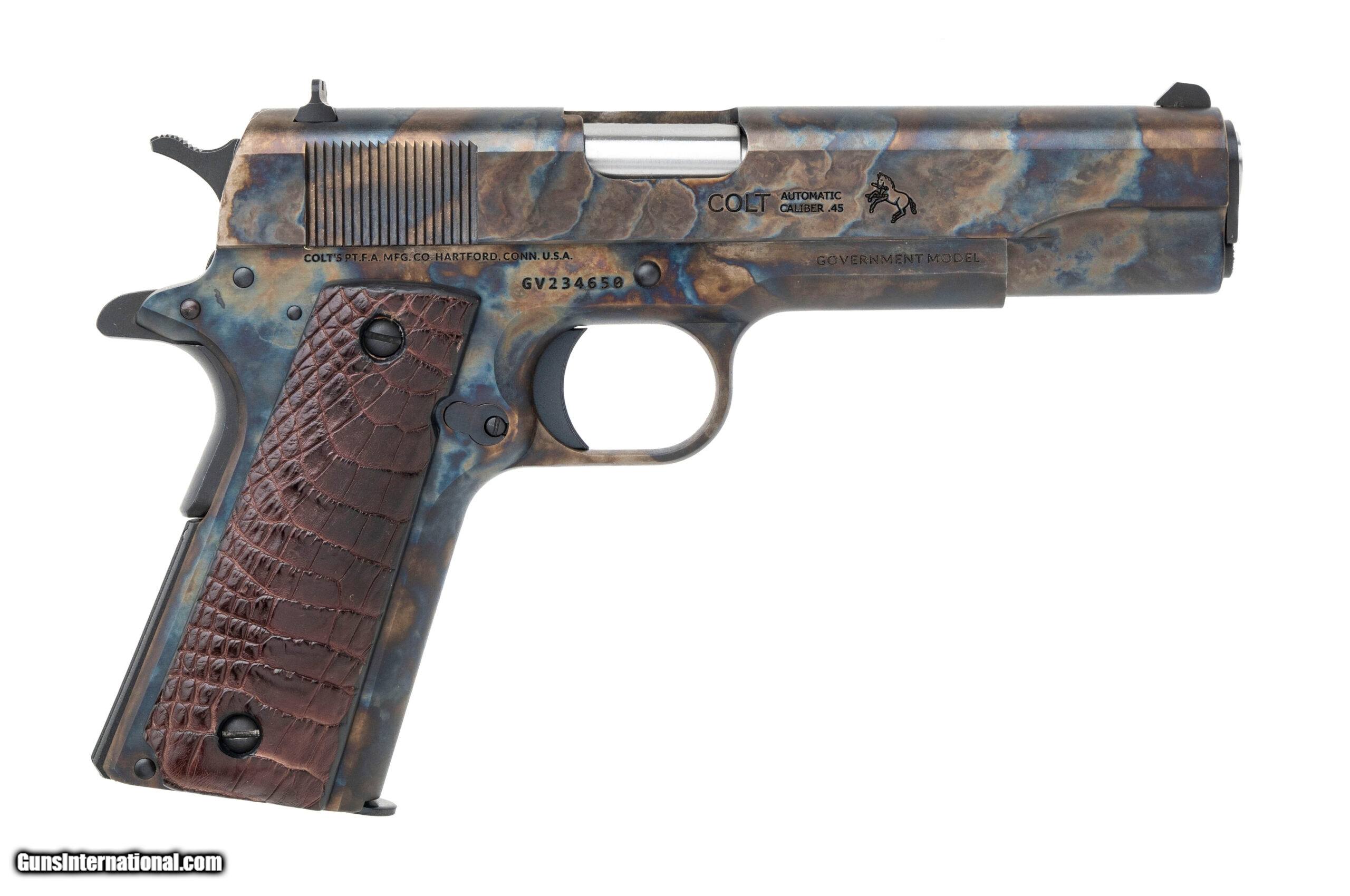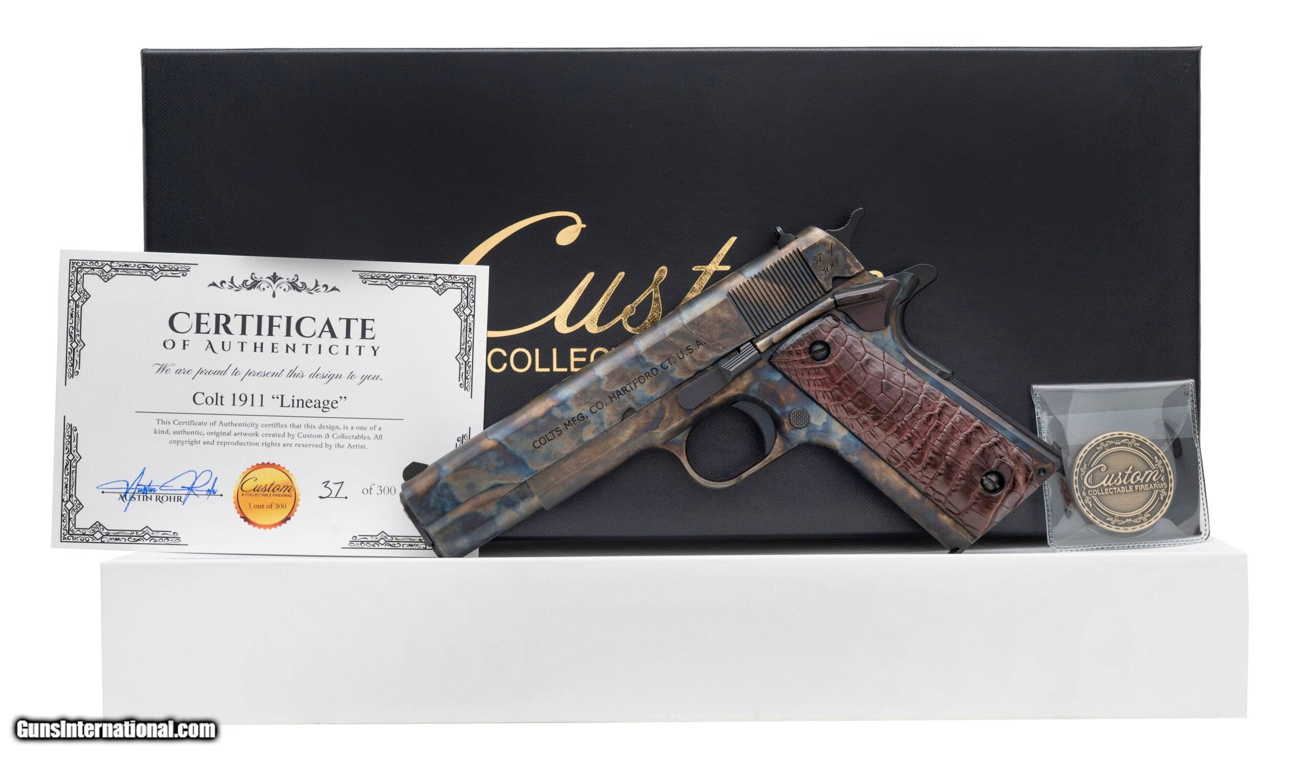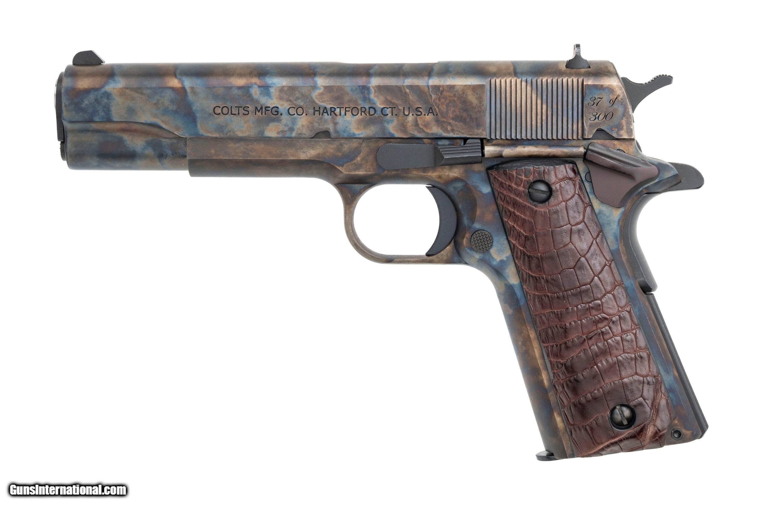 Description: "One of 300 Made Custom 1911 Pistol with a 5"" Barrel. Government Size, Color Case Hardened Metal, Genuine Alligator Grips, and Blacked Out Sights. Includes 1-9rd Magazine and Collectible Coin. NEW. UPC: 199284487017 SOLD |