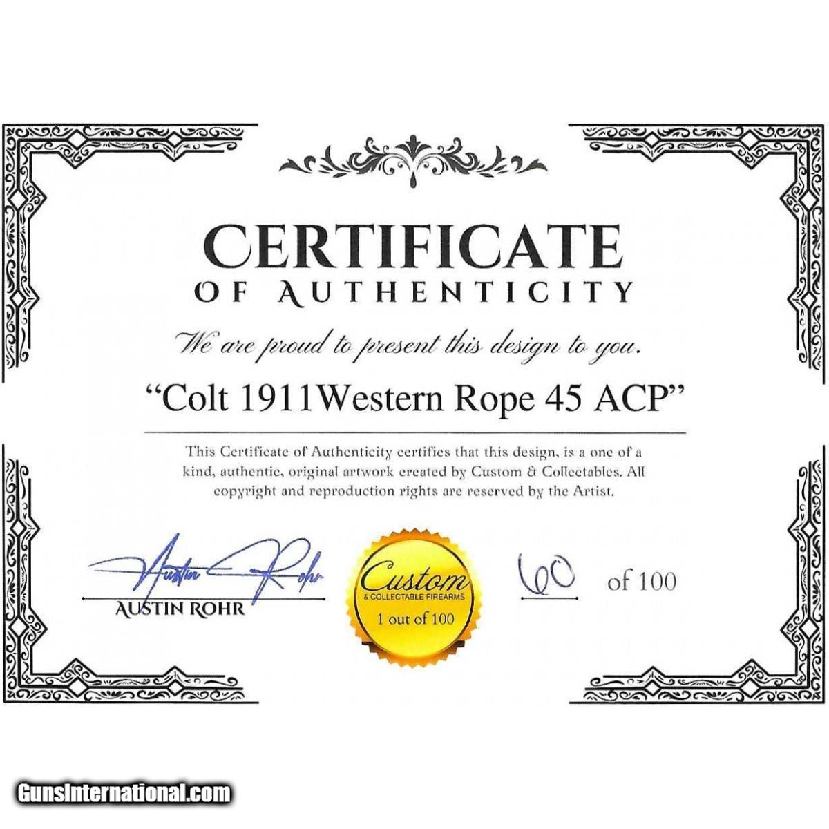 "(SN:SCC020653) Custom & Collectable Firearms Limited Edition Colt 1911 Western Rope Pistol .45ACP (NGZ4434) New