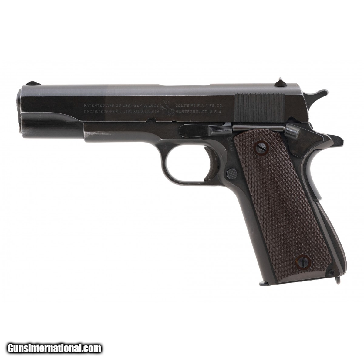 SN: 2285573. Manufactured in 1945, .45 ACP with a 5"" barrel. Bore has strong rifling with frosting in the grooves. WWII Colt 1911 with ""GHD"" marked on the left side of the frame and ordnance wheel marked on the right side of the frame. The barrel has British Nitro proof and the right side of the frame says ""notenglishmake"" under the ""M1911A1 U.S. Army"" marking. Overall very good condition. (Consignment)