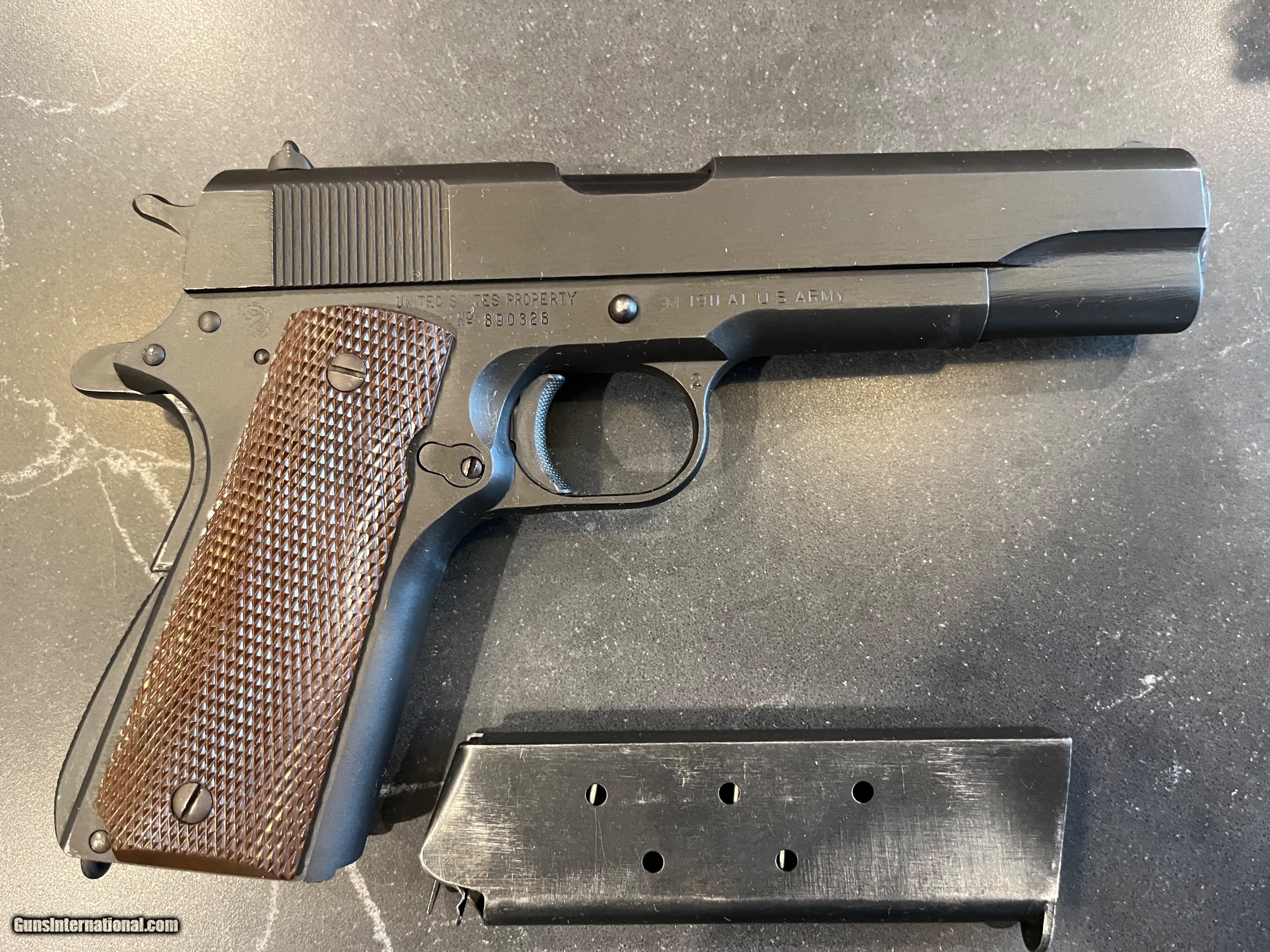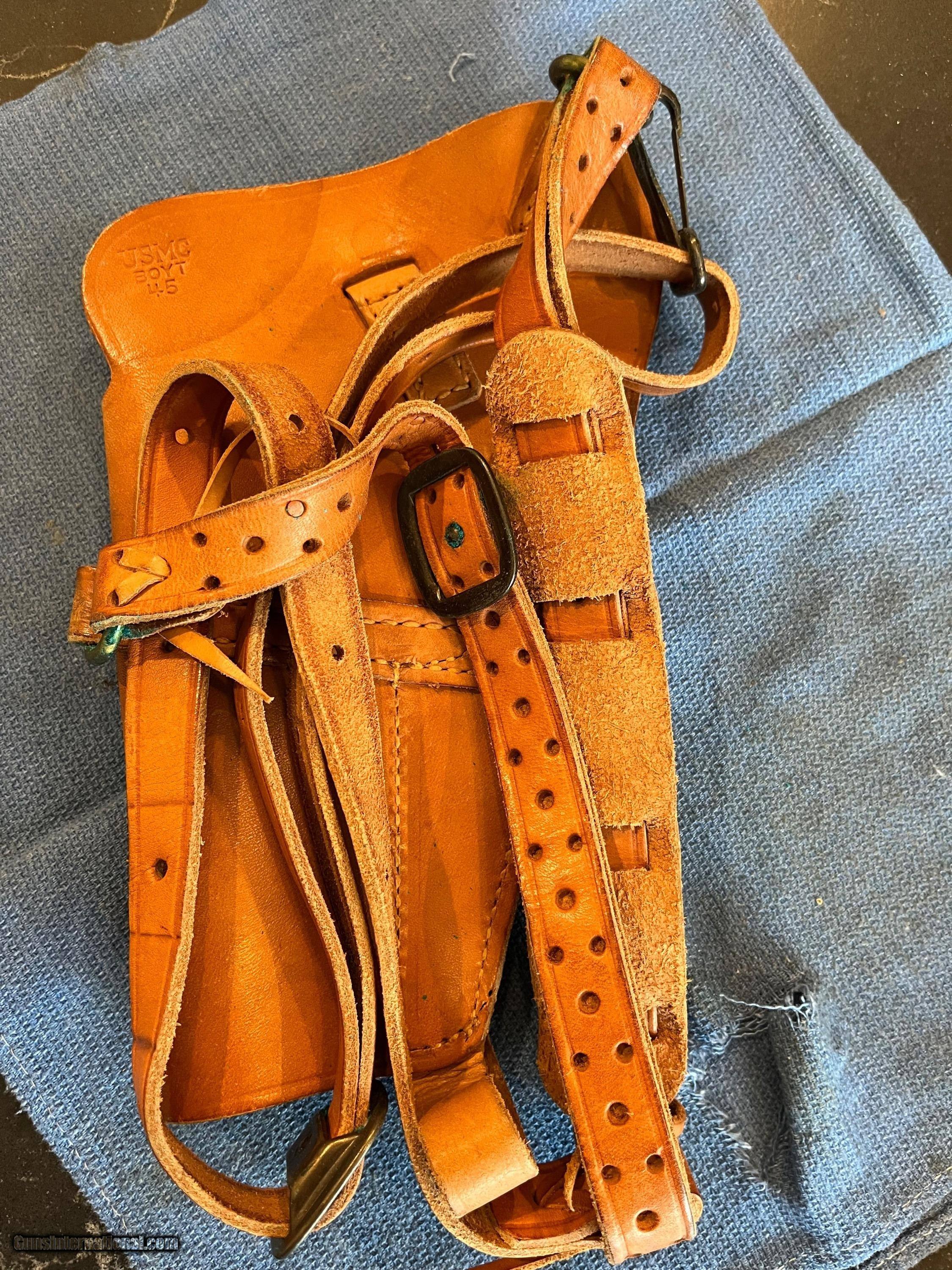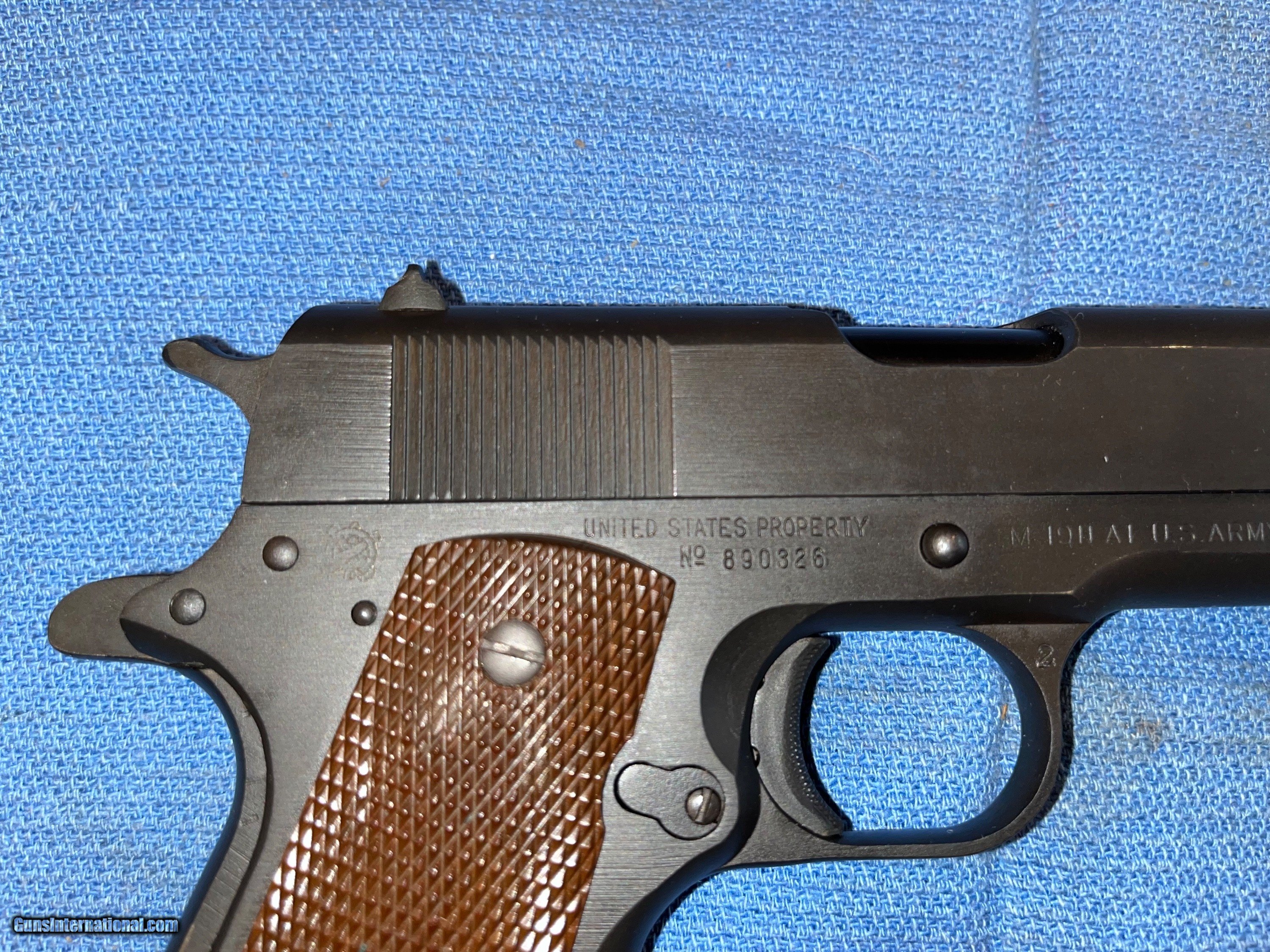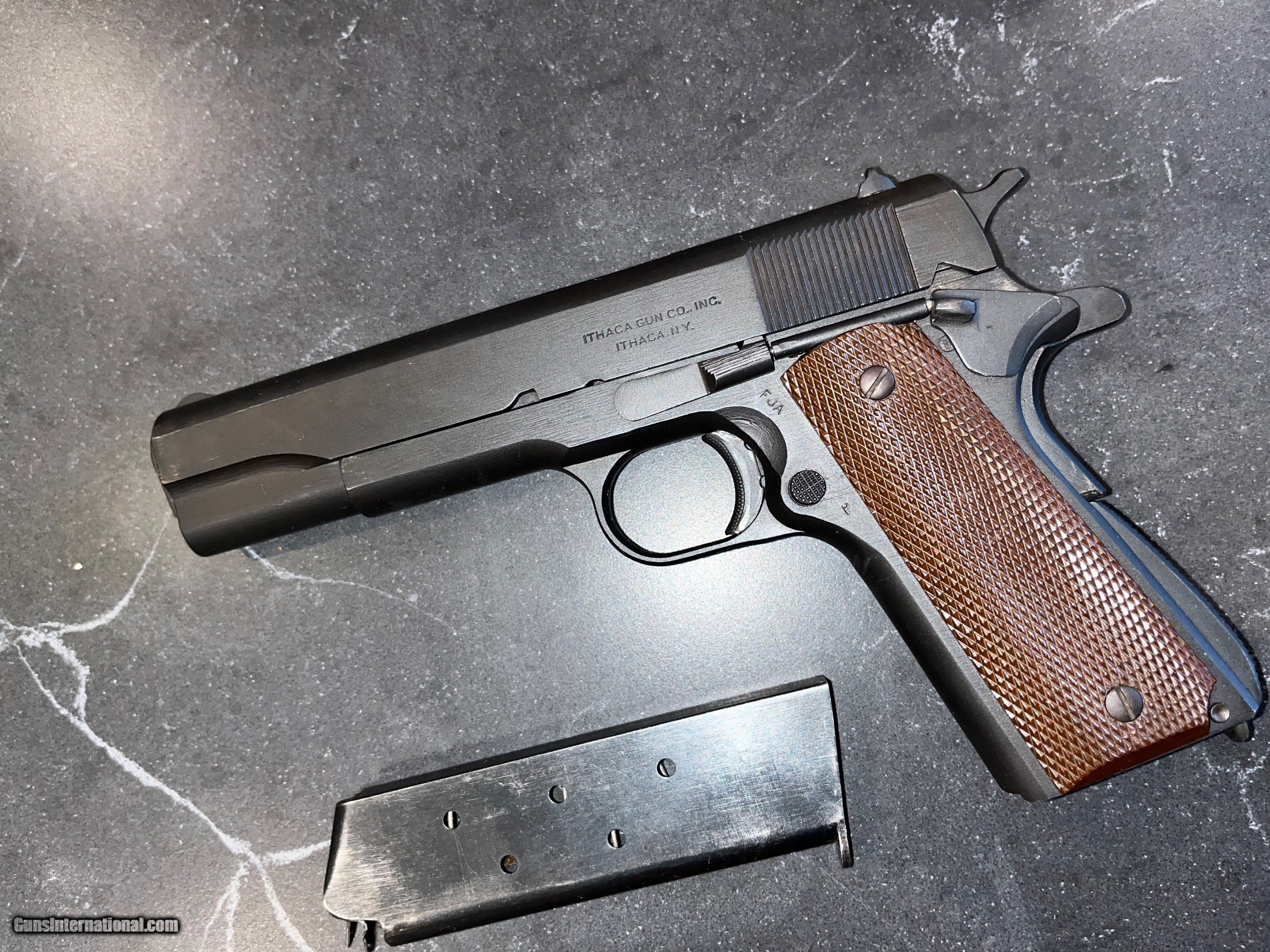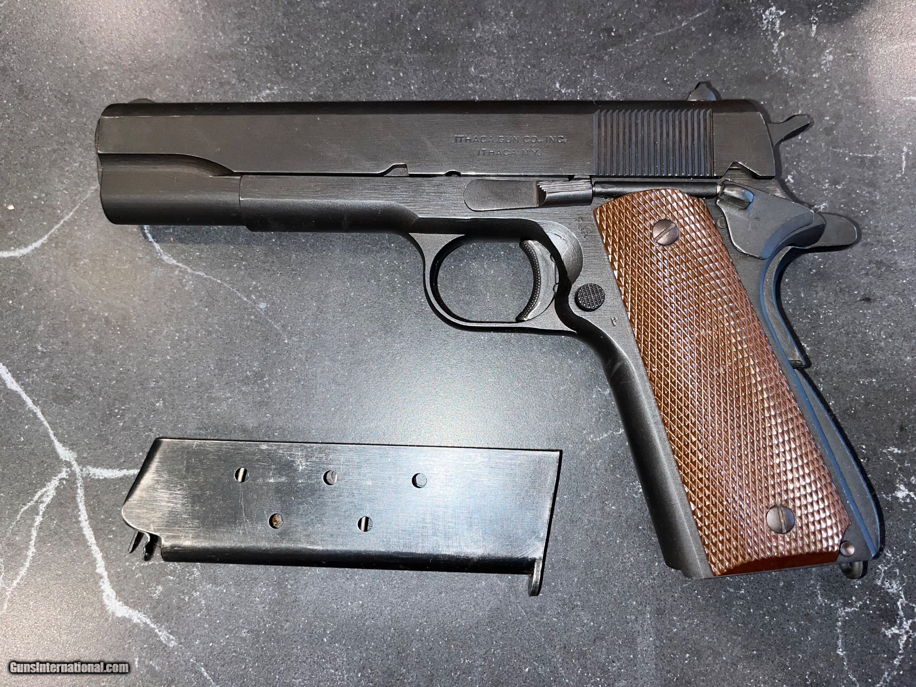 Description: Beautiful WW II Dulite Finshed ITHACA 1911A1 Early 1943 Production. Serial number 890326. FJA , P Proof and Crossed Cannons on the Frame.The slide is P Proofed. The Feed Ramp is in the White. Included is a late M7 USMC '45 Shoulder Holster in near new original condition. if you have questions please ask. SOLD |