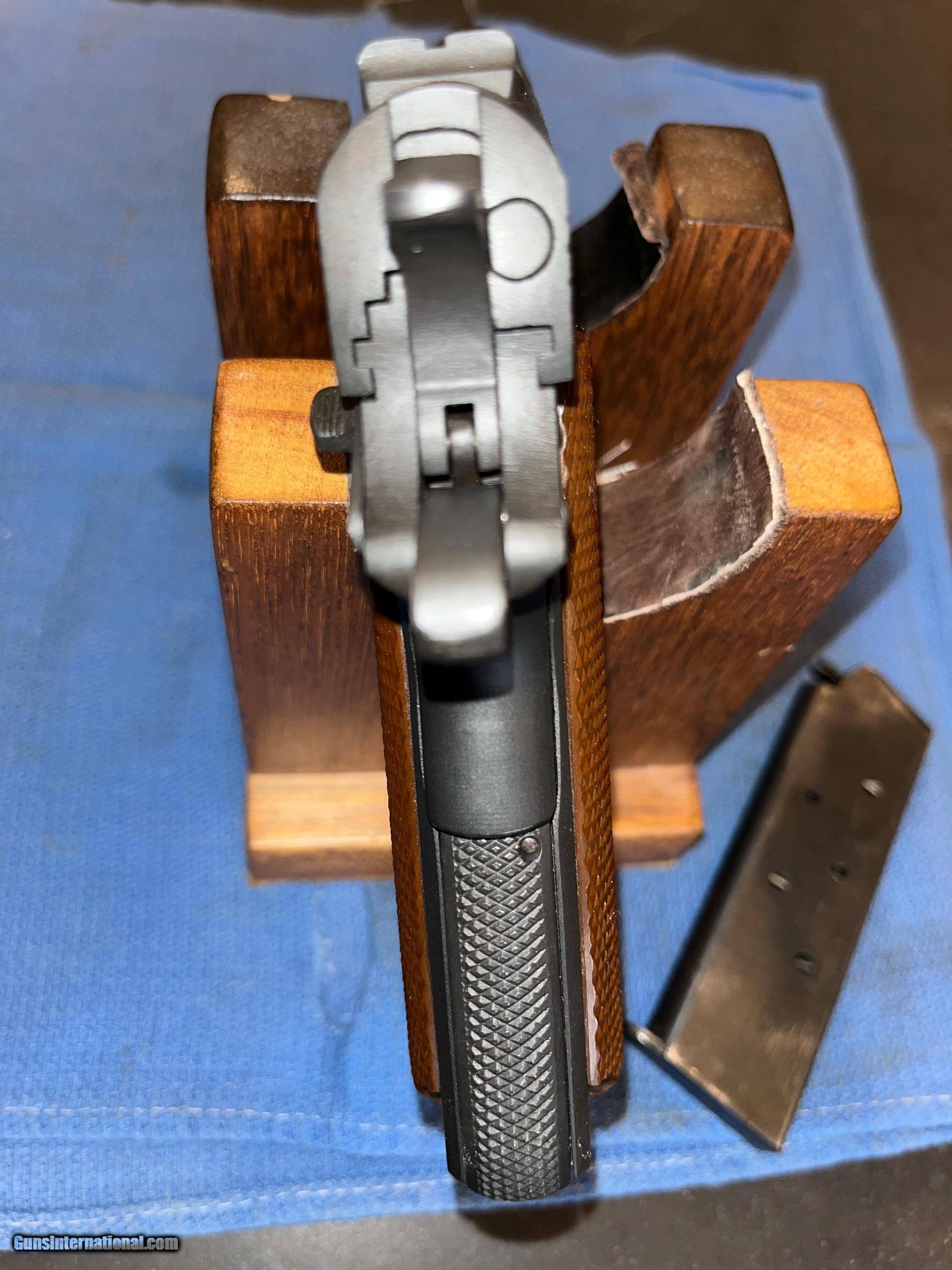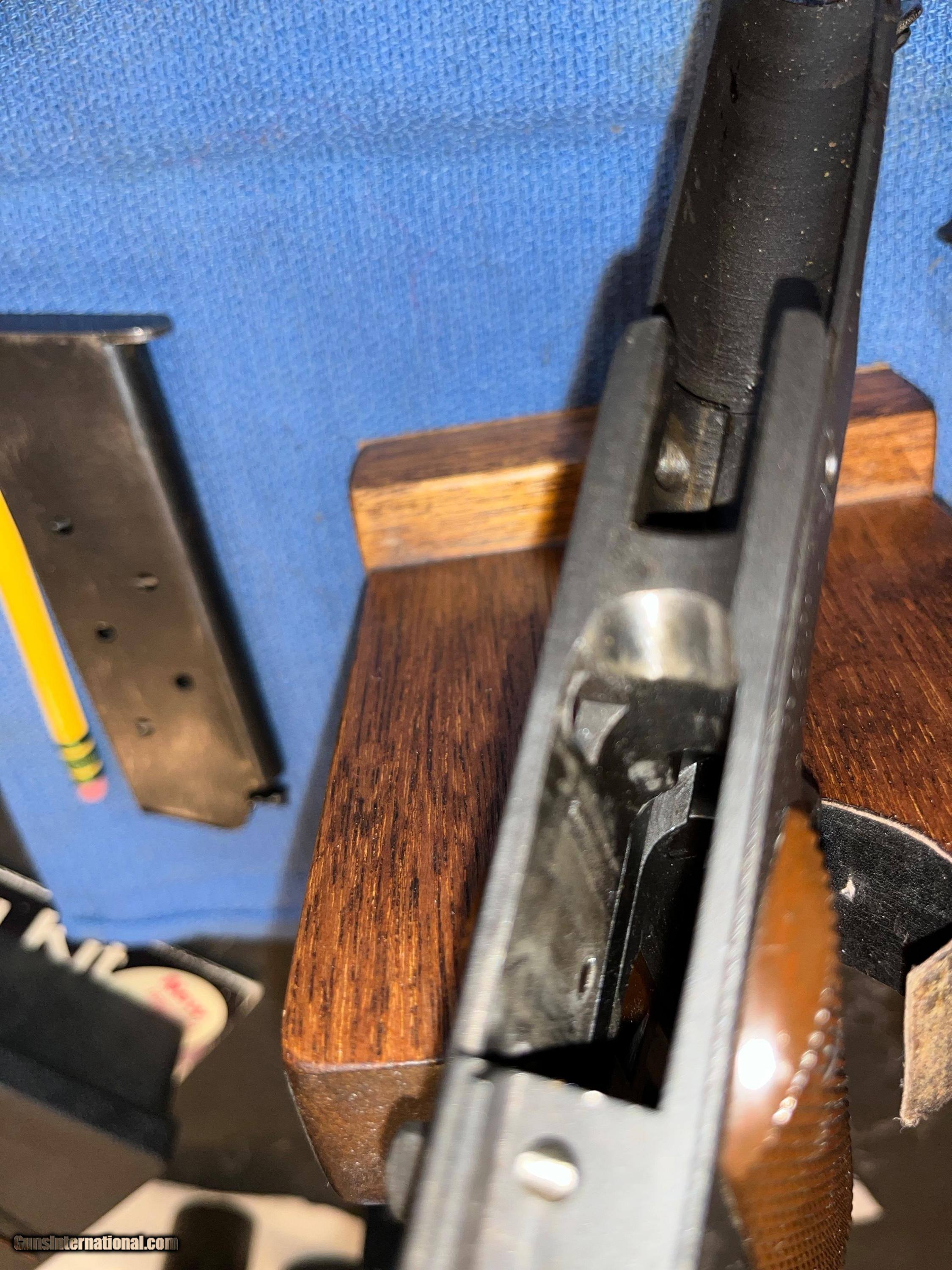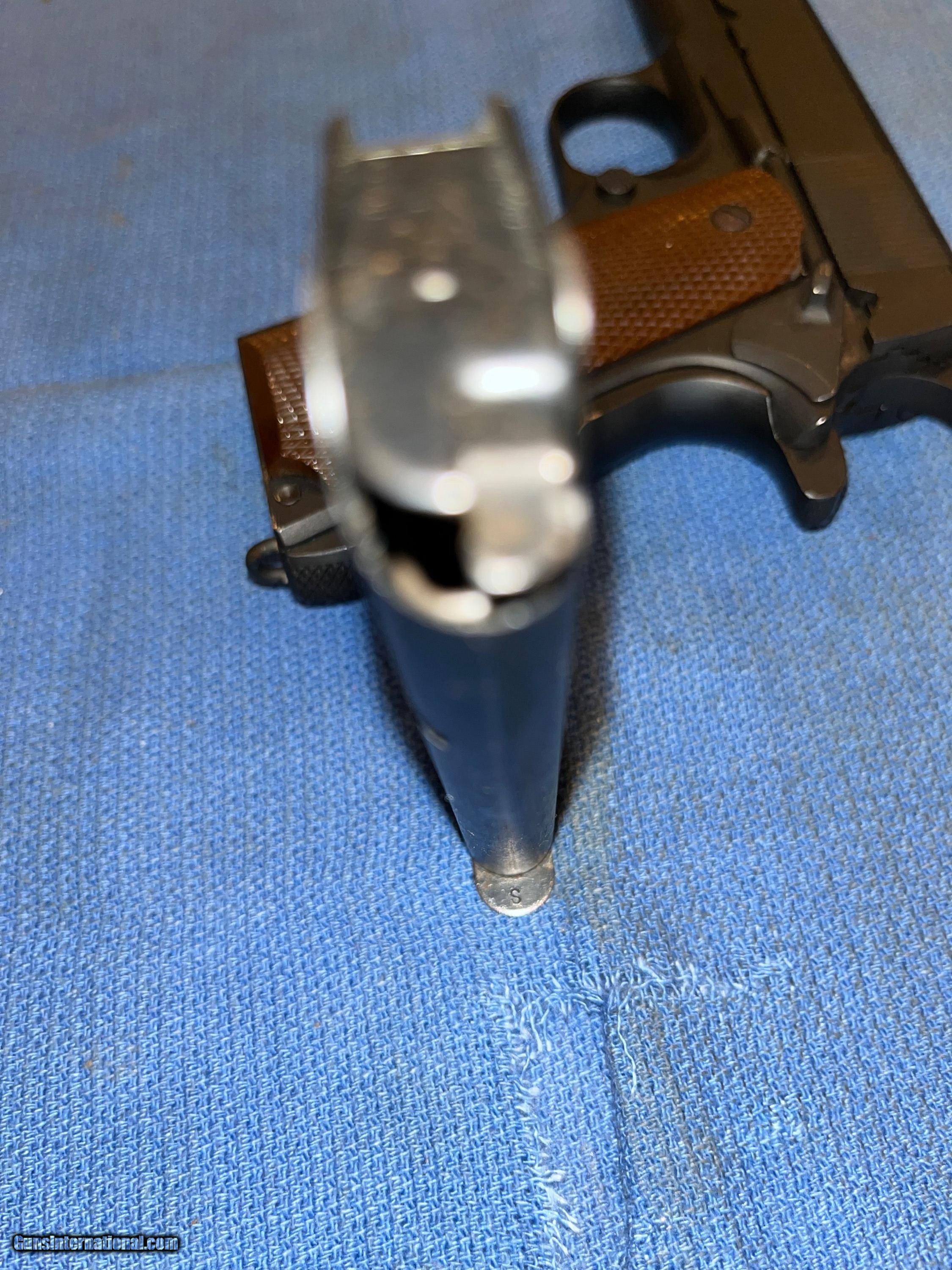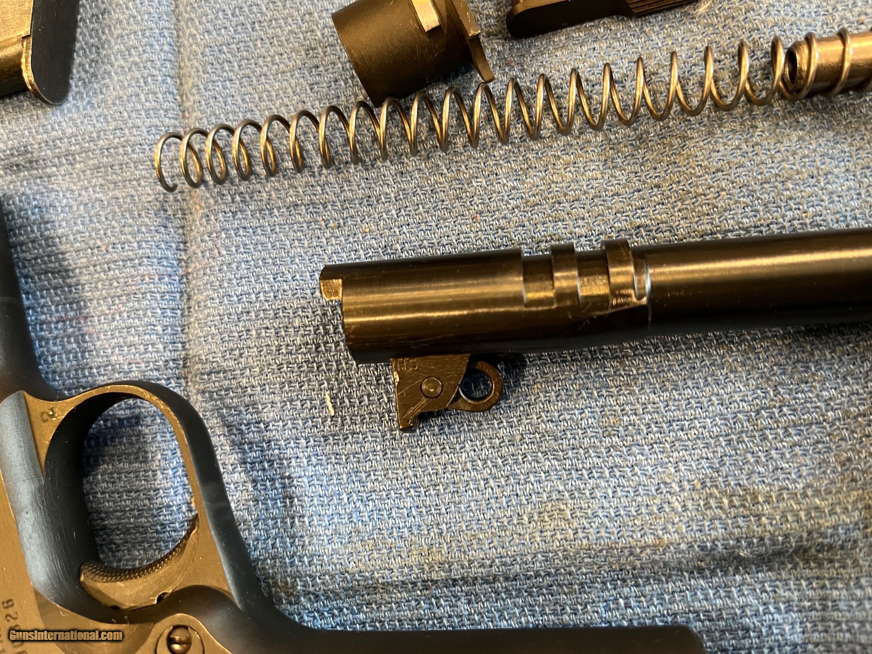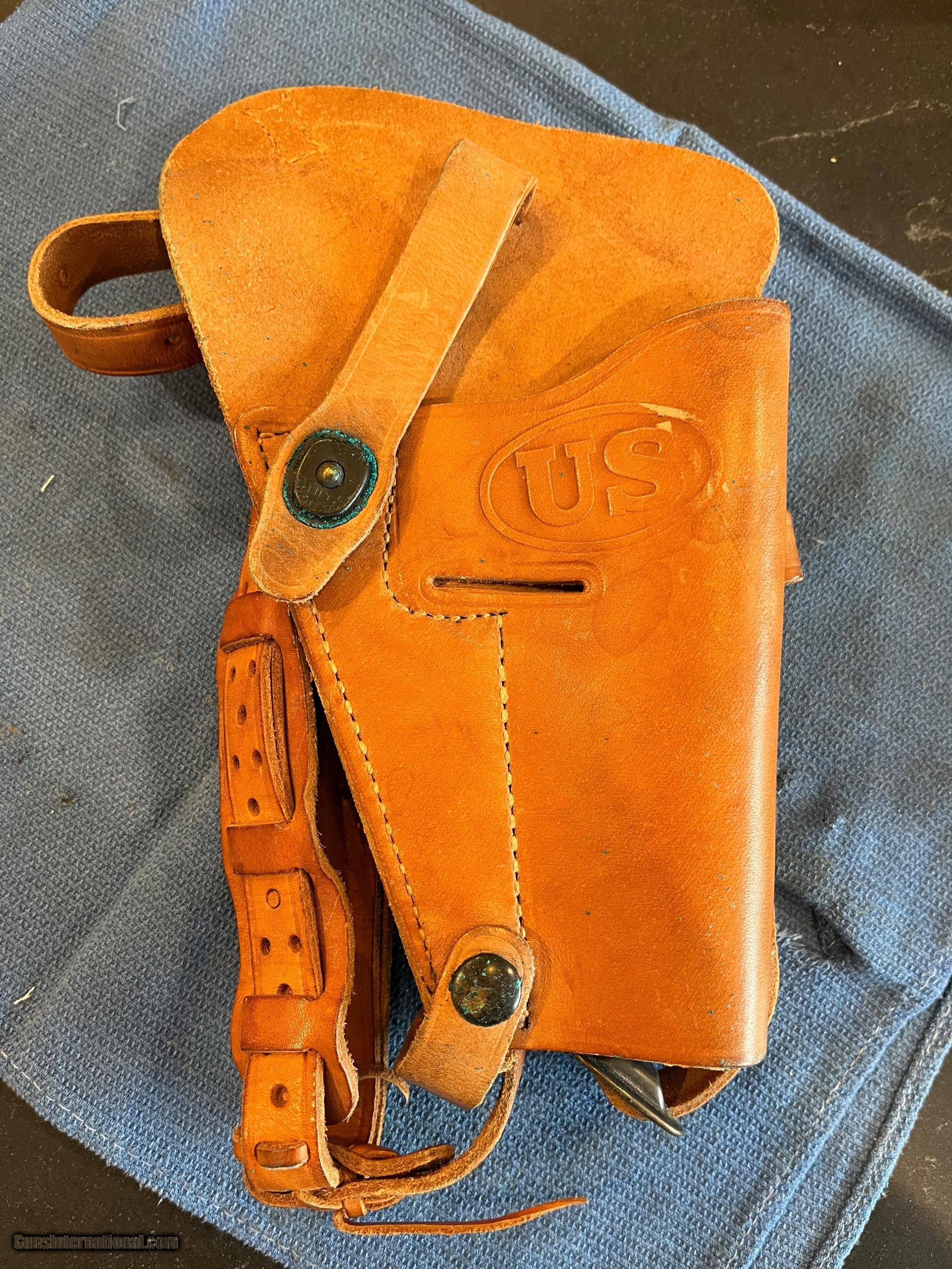 Description: Beautiful WW II Dulite Finshed ITHACA 1911A1 Early 1943 Production. Serial number 890326. FJA , P Proof and Crossed Cannons on the Frame.The slide is P Proofed. The Feed Ramp is in the White. Included is a late M7 USMC '45 Shoulder Holster in near new original condition. if you have questions please ask. SOLD |