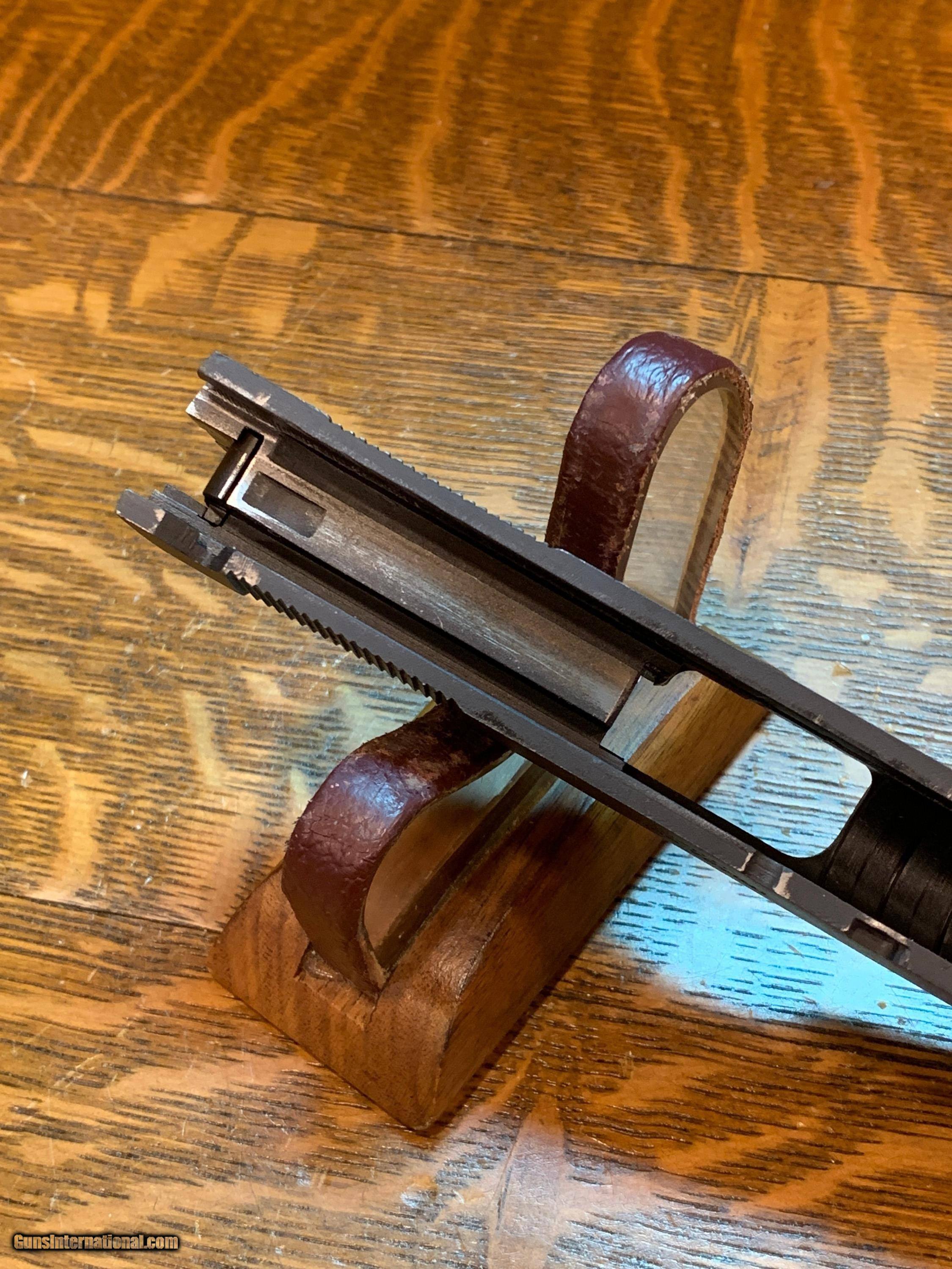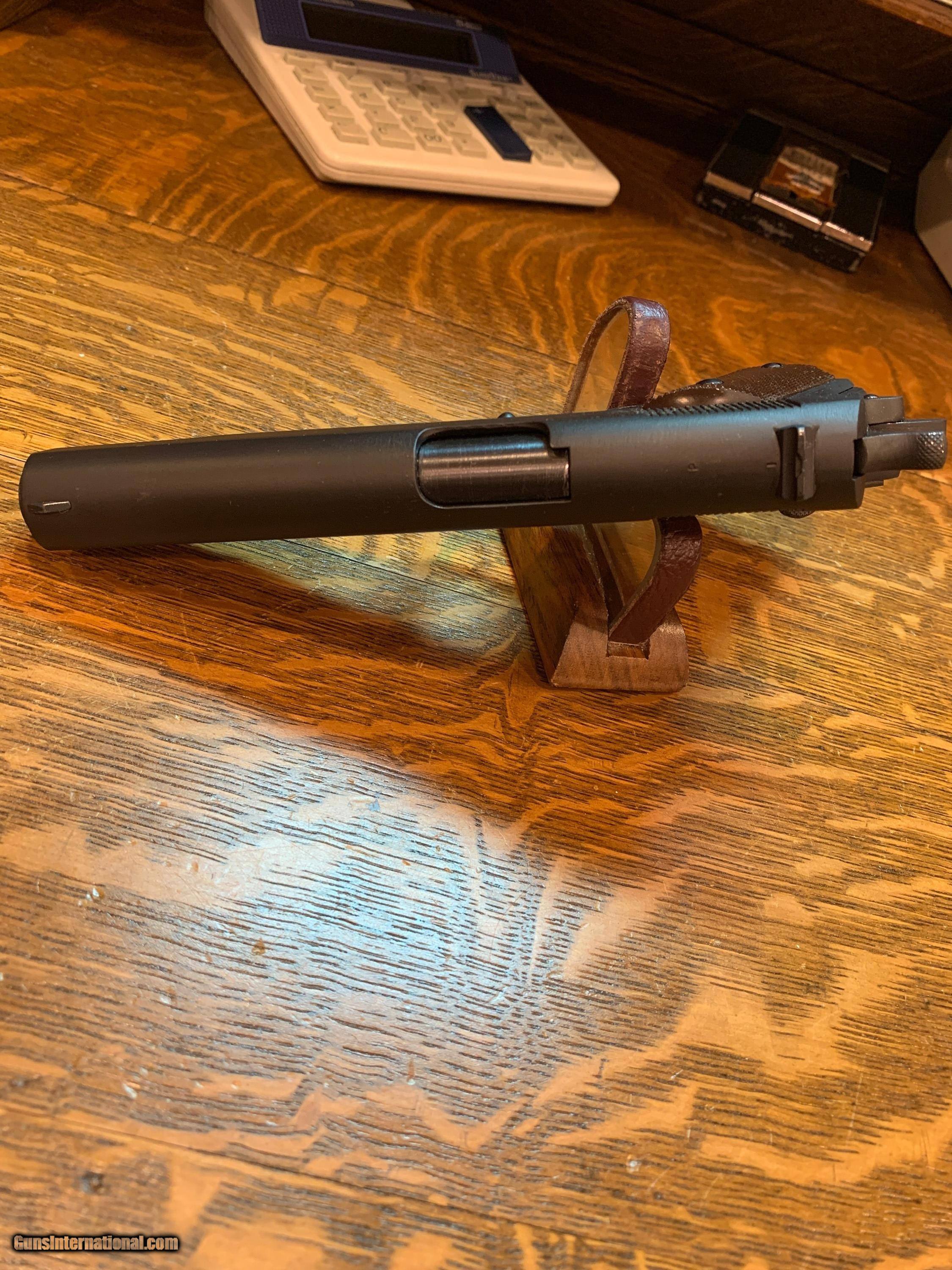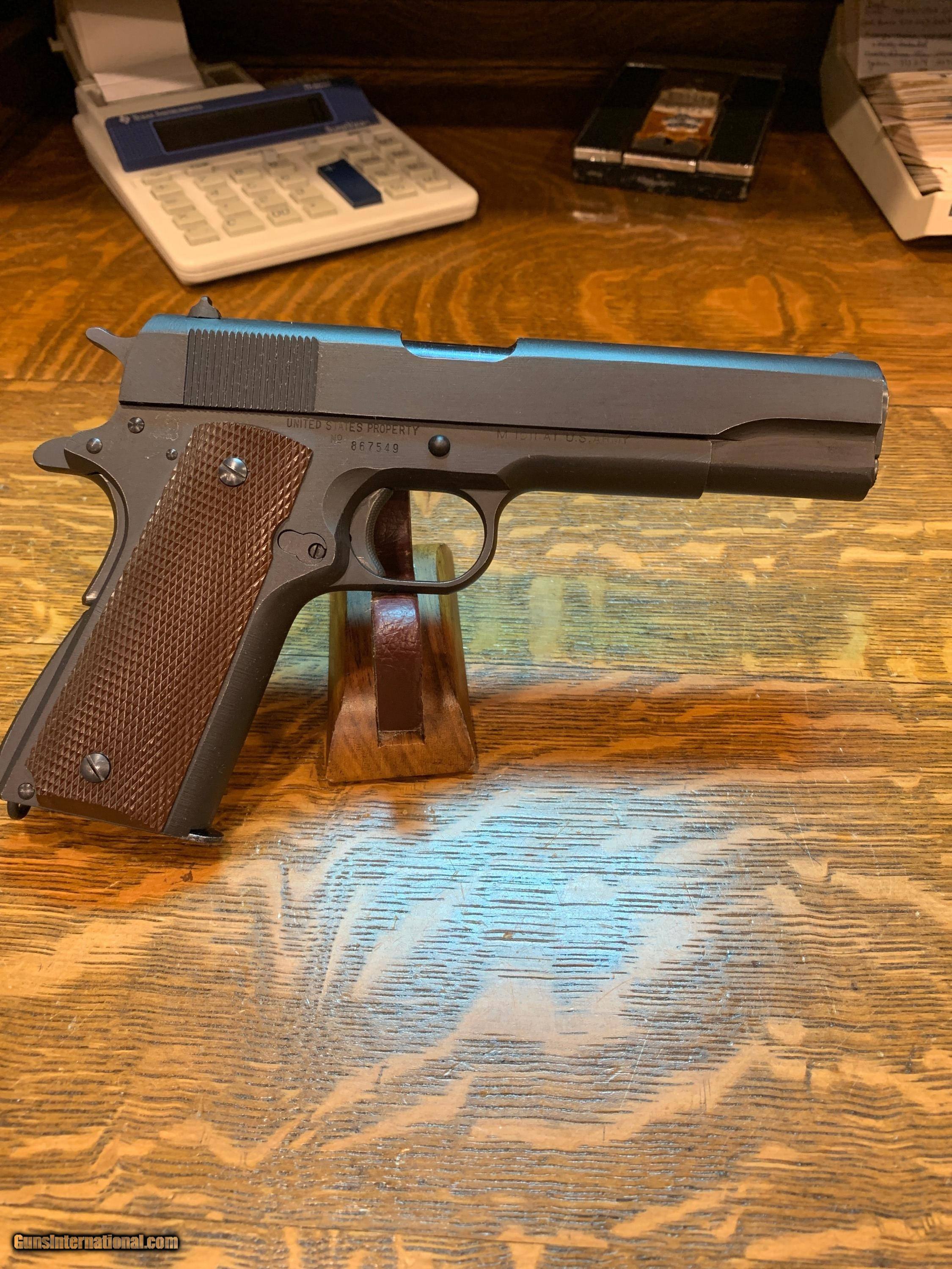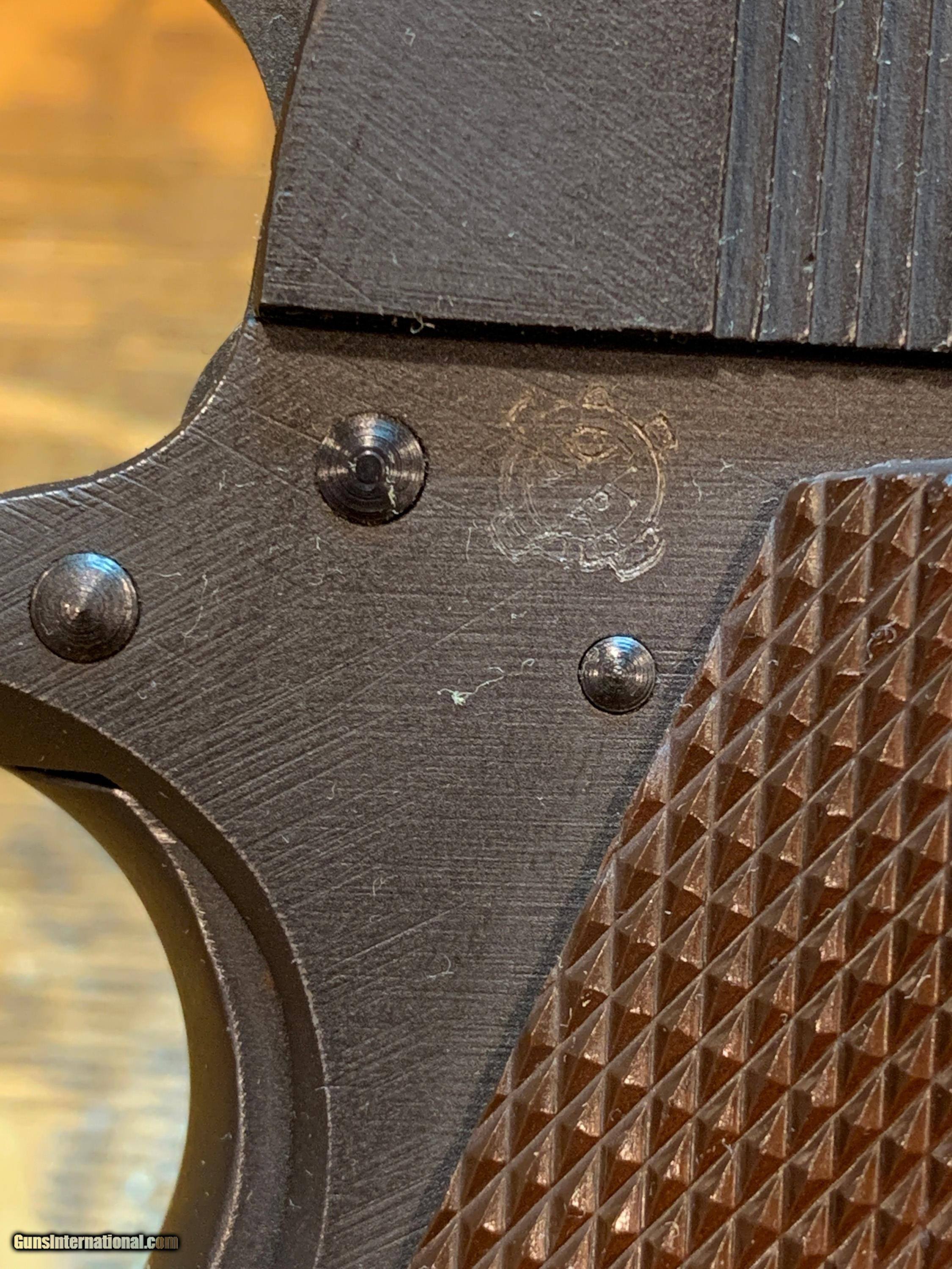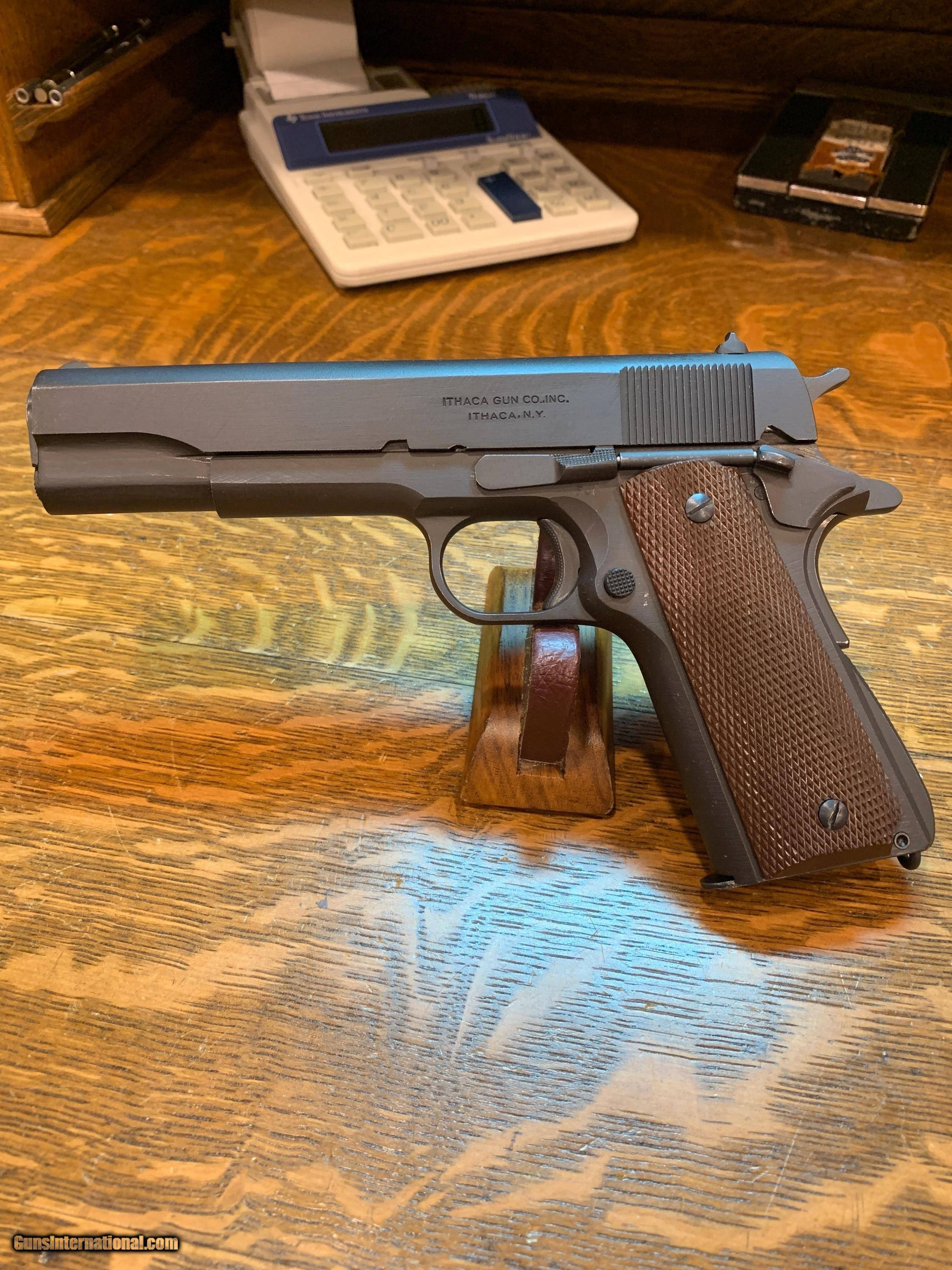Description: 1911A1 Manufactered by ITHACA GUN COMPANY. Serial no.867549 produced in 1943. Ithaca produced 335,466 during WWII. The sandblasted DULITE blue finish was only applied to roughly the first 35,000 pistols.This pistol retains a true 98-99% ORIGINAL FINISH. It has typical rough machining marks found on many Ithacas. These early guns were supplied with HIGH STANDARD barrels.This one has great bore with just a bit of frosting in the grooves. It has a Scovill magazine. Action is fine. Proof P on reciever has been double struck. This Dulite blue pistol is gorgeous, and worthy of the best 1911 collection. Please call 973-214-3407 with questions. Thankyou. FFL please SOLD Curio/Relic: Yes |