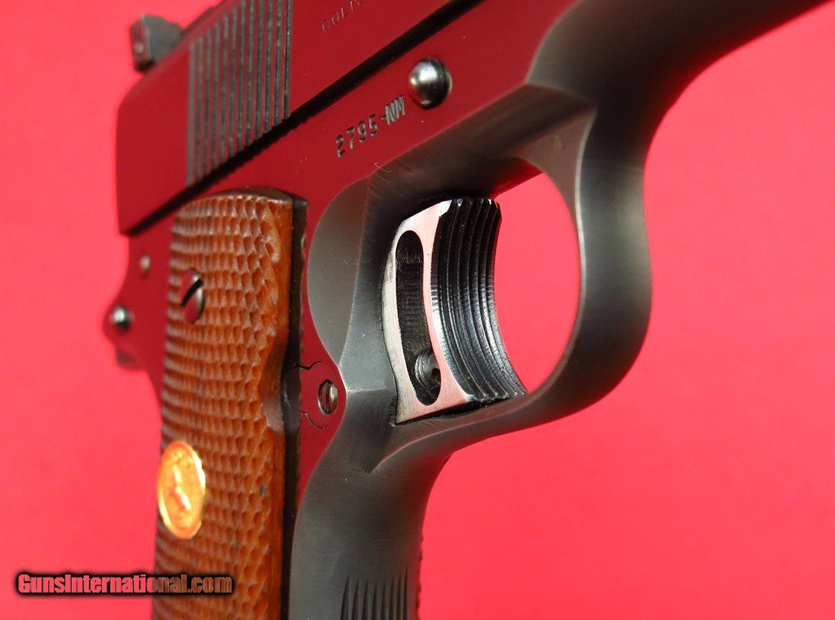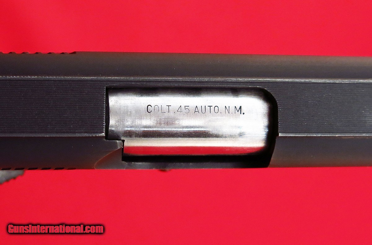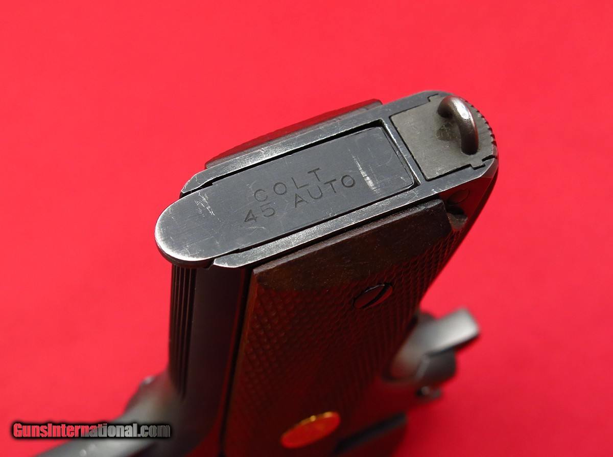 Description: 1958 Colt Gold Cup National Match, the second year of production. The Gold Cup National Match is the post-war competition/target version of the 1911/Government Model. Once considered the most accurate 'out of the box' pistol available. Features included the flat top slide with angled cocking serrations, Colt-Accro adjustable rear sight, flared ejection port, NM barrel, fitted barrel bushing with conical recoil spring plug, adjustable long trigger, etc. This pistol is in excellent overall condition with some minor handling wear from minimal use. The original flat mainspring housing has been replaced with a military arched/grooved unit with lanyard loop, all else is original. There are a few very light marks in the matte surfaces and minimal wear around the magazine well. The original blue finish is about 96-97% overall. Original checkered walnut grips feature gold Colt medallions and are excellent without cracks, chips or significant wear. The mechanics are in perfect working order and the bore is excellent, as new. The magazine is period correct and shows minor finish wear. This fine pistol comes in its original National Match box that numbers to the gun and includes the original Gold Cup instruction sheet. Professional pictures are very indicative of condition. Shipping will be $40 east of the Mississippi, $35 west. Private seller - make sure your FFL will take delivery. SOLD |
