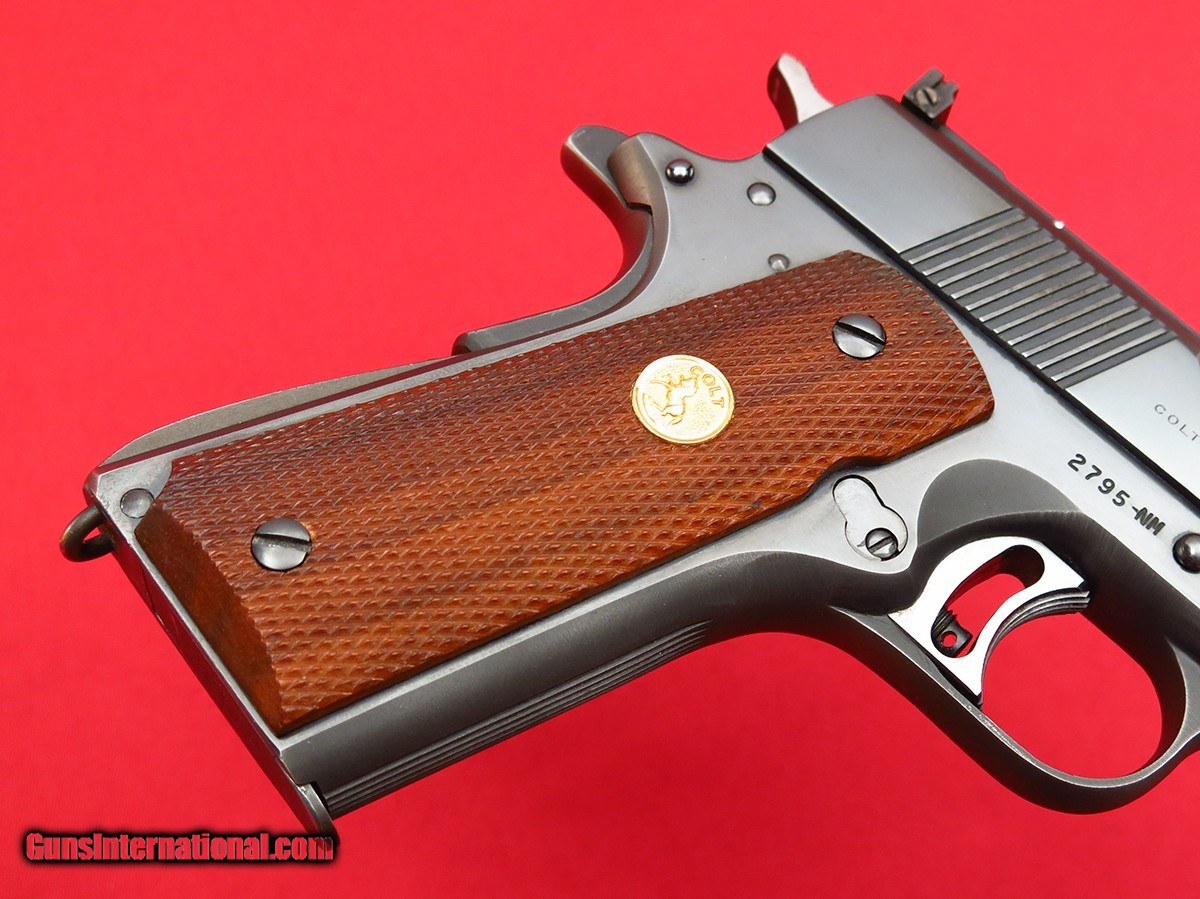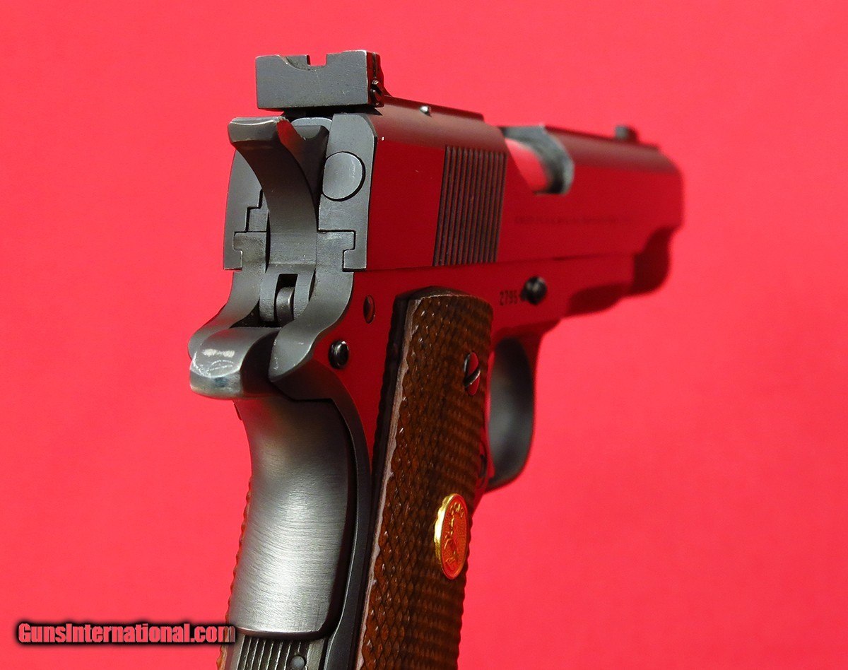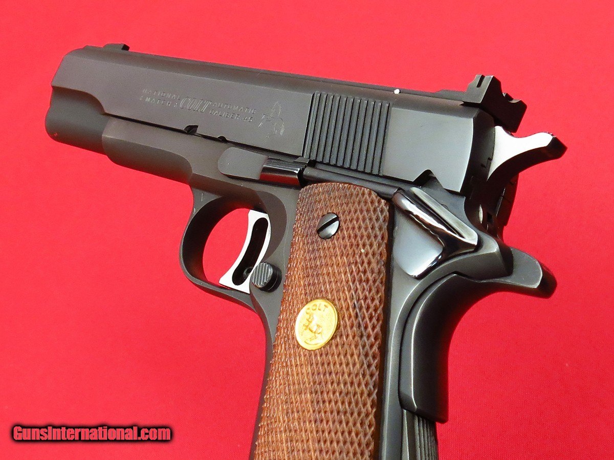 Description: 1958 Colt Gold Cup National Match, the second year of production. The Gold Cup National Match is the post-war competition/target version of the 1911/Government Model. Once considered the most accurate 'out of the box' pistol available. Features included the flat top slide with angled cocking serrations, Colt-Accro adjustable rear sight, flared ejection port, NM barrel, fitted barrel bushing with conical recoil spring plug, adjustable long trigger, etc. This pistol is in excellent overall condition with some minor handling wear from minimal use. The original flat mainspring housing has been replaced with a military arched/grooved unit with lanyard loop, all else is original. There are a few very light marks in the matte surfaces and minimal wear around the magazine well. The original blue finish is about 96-97% overall. Original checkered walnut grips feature gold Colt medallions and are excellent without cracks, chips or significant wear. The mechanics are in perfect working order and the bore is excellent, as new. The magazine is period correct and shows minor finish wear. This fine pistol comes in its original National Match box that numbers to the gun and includes the original Gold Cup instruction sheet. Professional pictures are very indicative of condition. Shipping will be $40 east of the Mississippi, $35 west. Private seller - make sure your FFL will take delivery. SOLD |