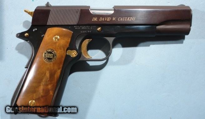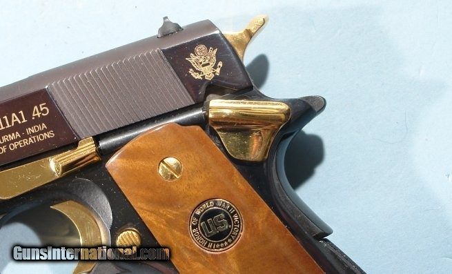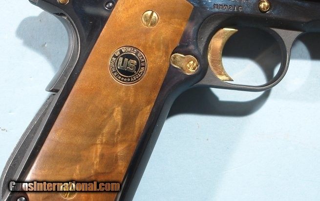 Description: AUTO-ORDNANCE WW2 AMER. HISTORICAL ASSN. COMMEMORATIVE COLT 1911-A1 OR 1911A1 PISTOL CA. 1985 NIB IN DISPLAY CASE W/PAPERS. .45 ACP cal. All original with the outer cardboard box (not pictured) and all the original papers. Unfired and new condition. One owner gun with his name engraved on the slide. Very handsome walnut velvet lined display casing. SOLD |