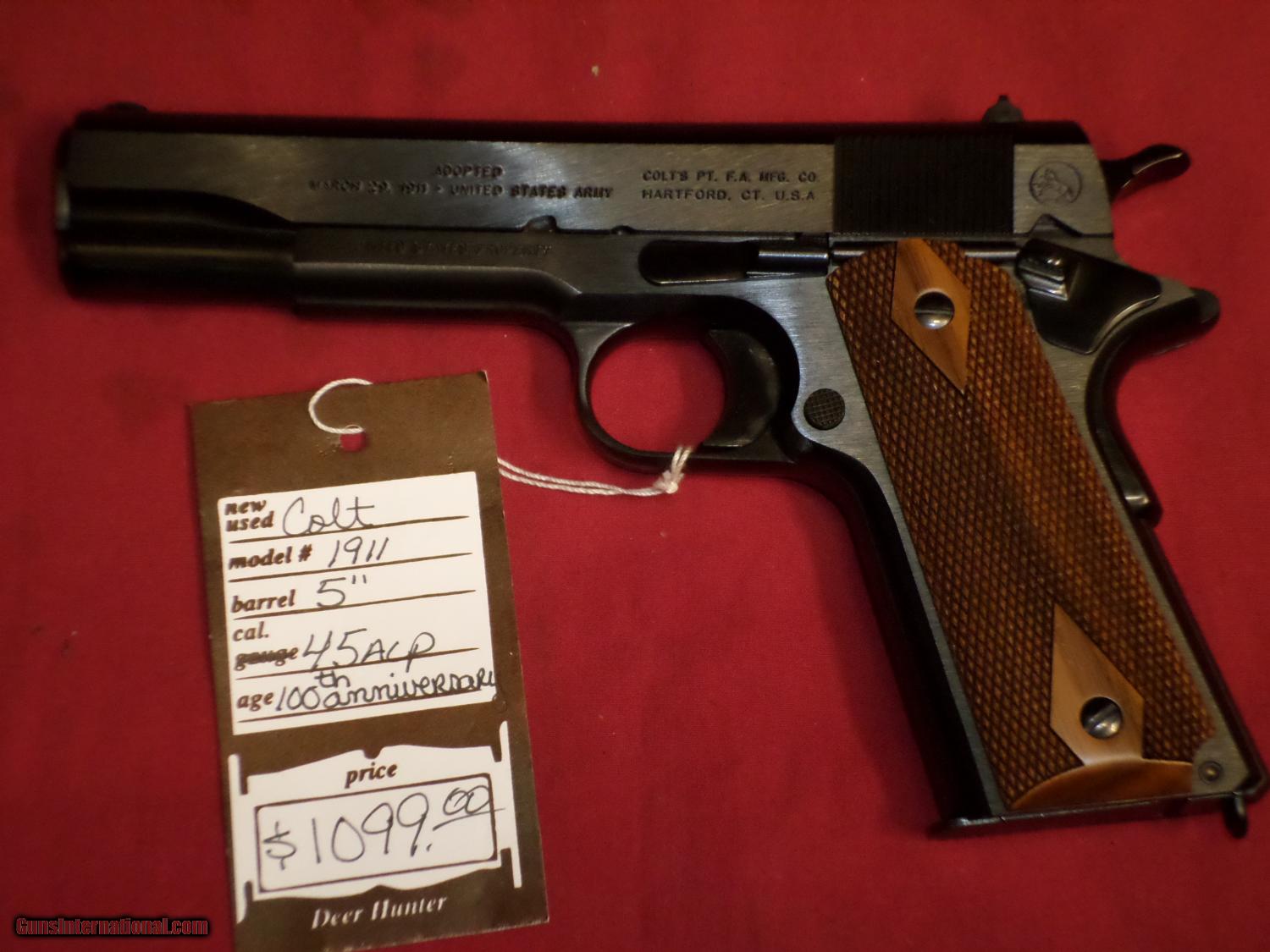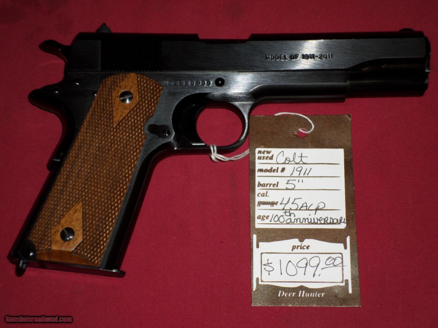 Description: SOLD For sale, Colt 1911 100th Anniverasry Edition. Excellent condition, unfired in the original box.SOLD To see more of our inventory, visit deerhunter guns,com We accept MC, Visa and Discover, no AmEx. No Sales to California. Like us on Facebook: Deer Hunter Guns SOLD |