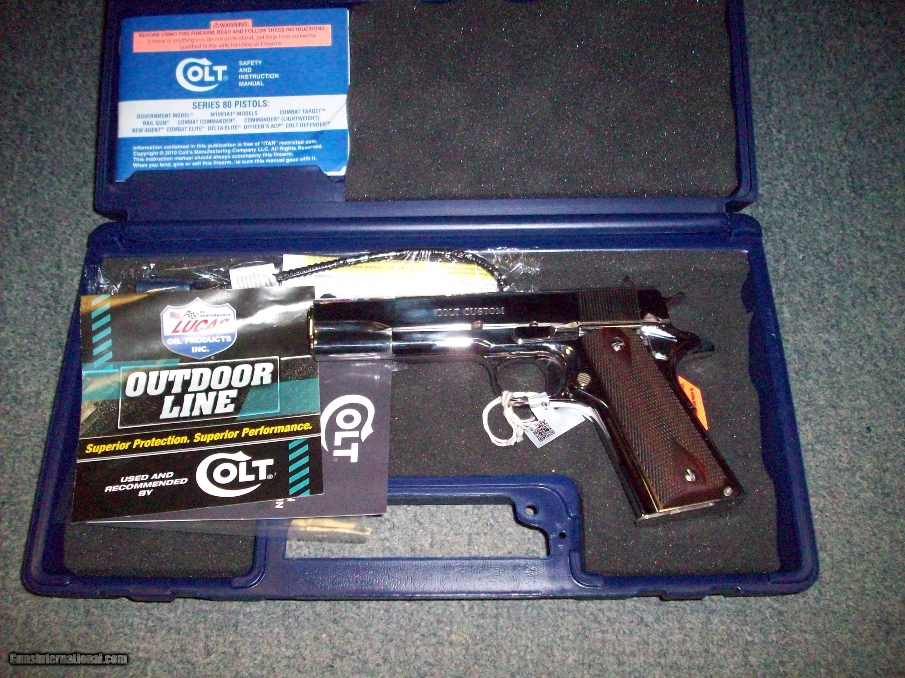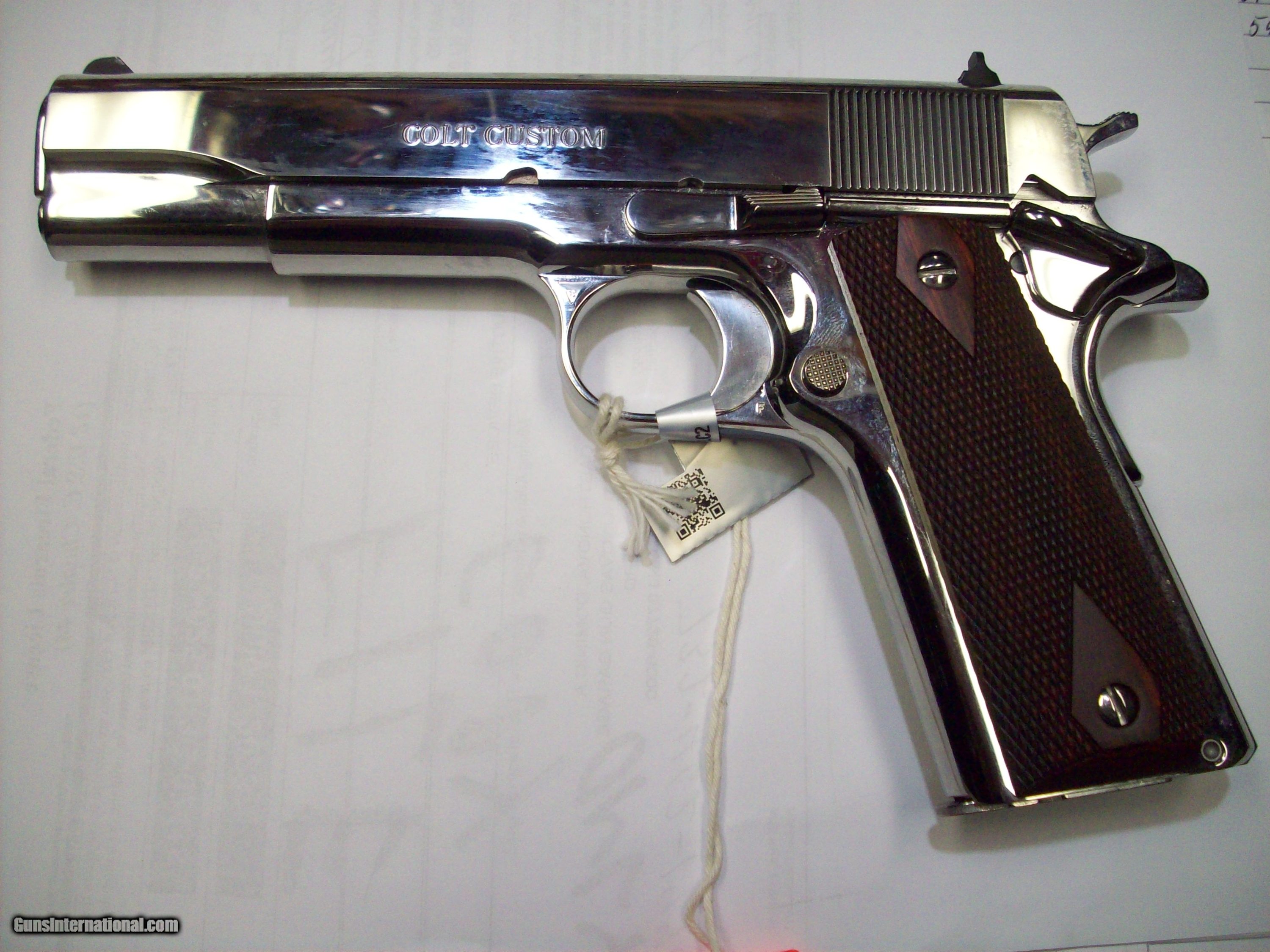 Description: This .38 SUPER Cal. pistol is a NICKEL 1911 COLT CUSTOM GOVERNMENT model. Still has the packing grease on it. Condition AS NEW. $2149.00. rmgrigolettoyahoo 732 280 8750. SOLD |