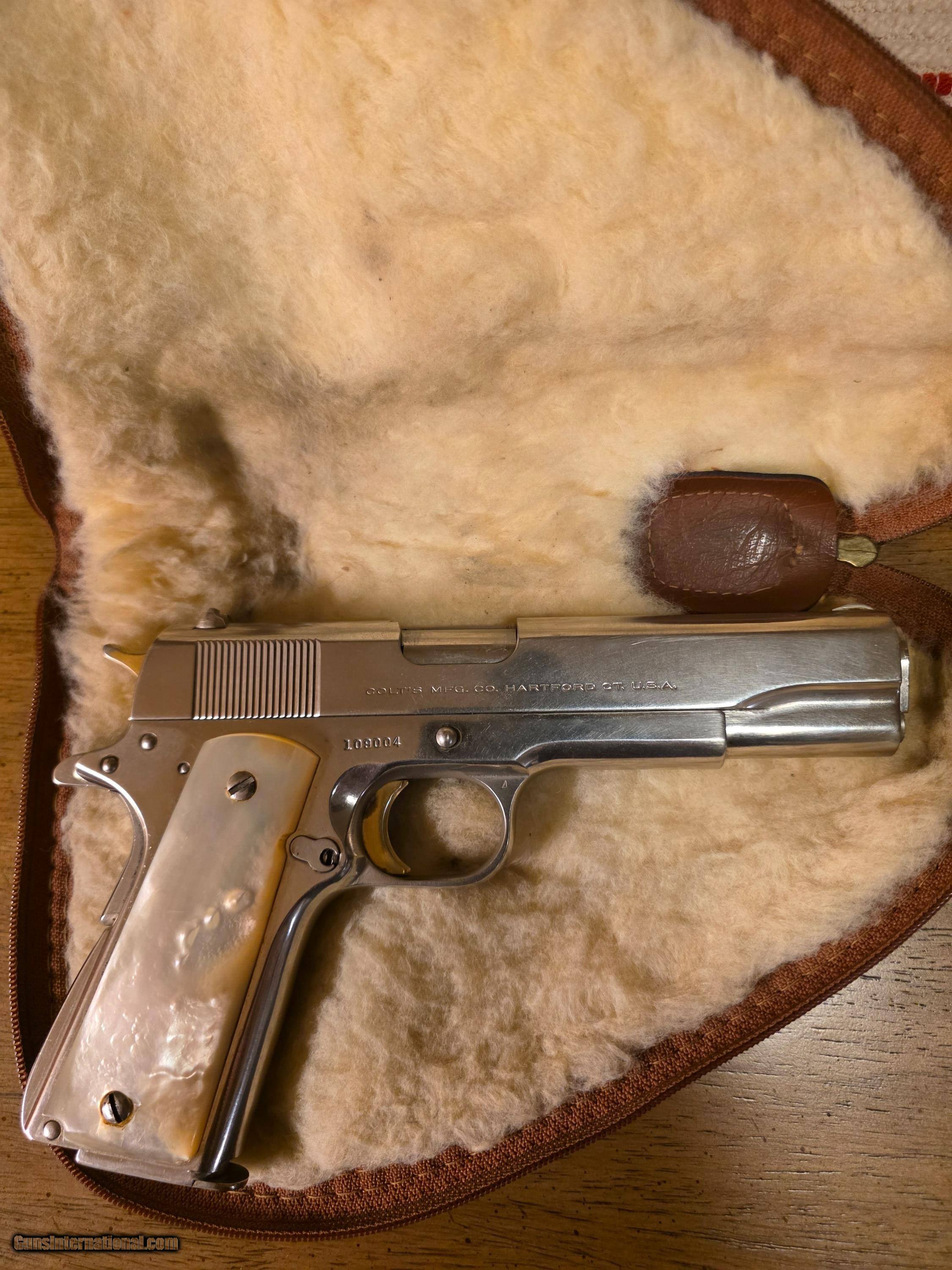 Description: 1953 Colt 1911 .38 super serial number 109004 Nickel plated with pearl grips. Overall condition is good with very little visible rub wear on usual areas of barrel. Original Colt magazine. Overall a very nice example of an antique 73 year old 1911. Curio/Relic: Yes Rifle Caliber: .30-338 Winchester Magnum, .38 Manufacturer: Colt Model: 1911 Serial Number: 109004 Barrel Length: 5 Ejectors: Good Condition: Good Metal Condition: Good Bore Condition: Good Price: $5,500.00 Buy Now Contact Seller |