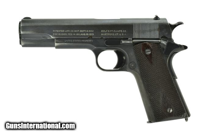 Description: Colt 1911 .45 ACP caliber pistol. WWI U.S. Military pistol made in 1919. Has about 85% original finish, with most of the wear on the grip frame. The bore is near excellent with light wear. The grips have a few marks and are in good condition. A good looking example of a WWI GI 1911.