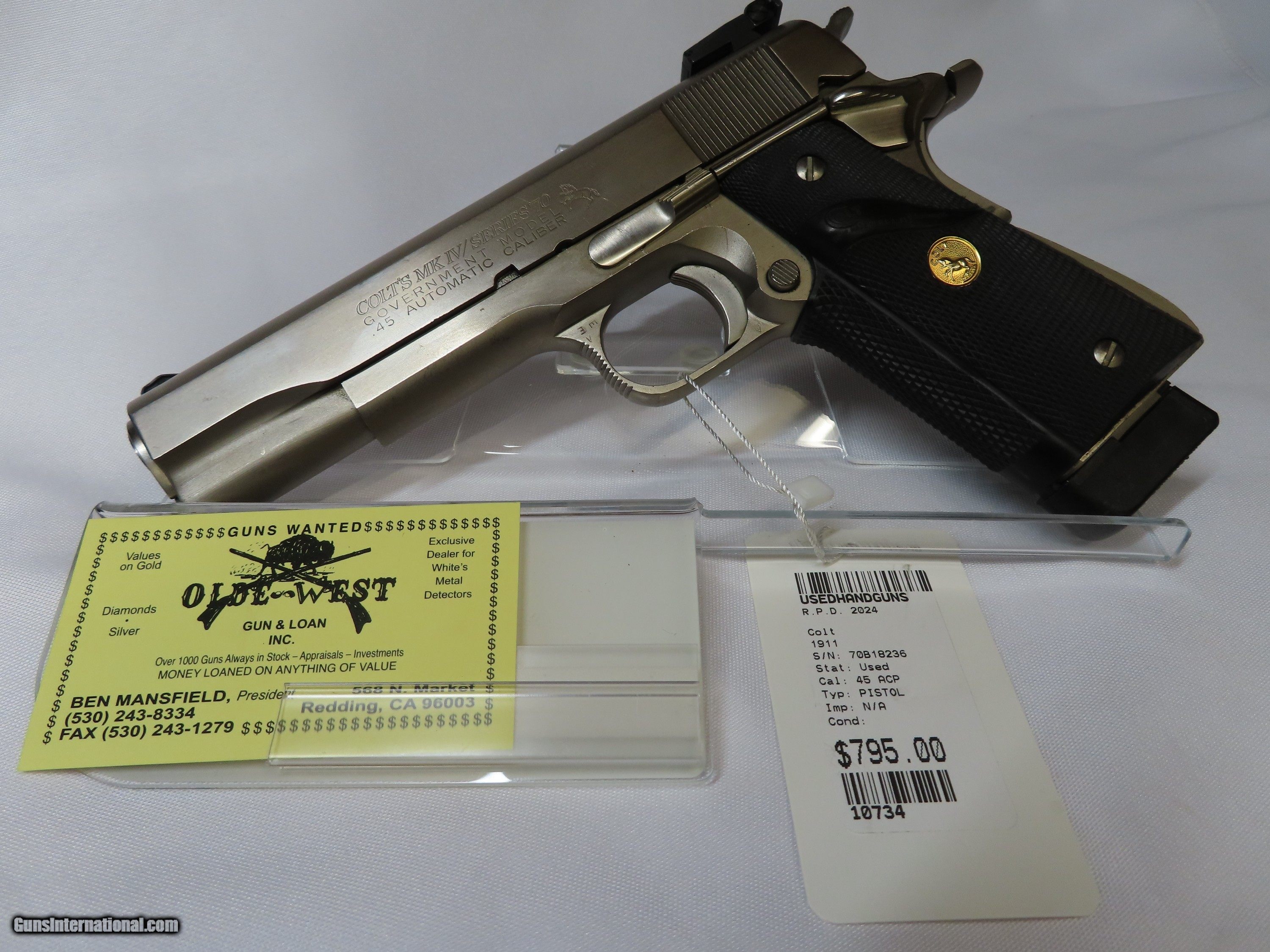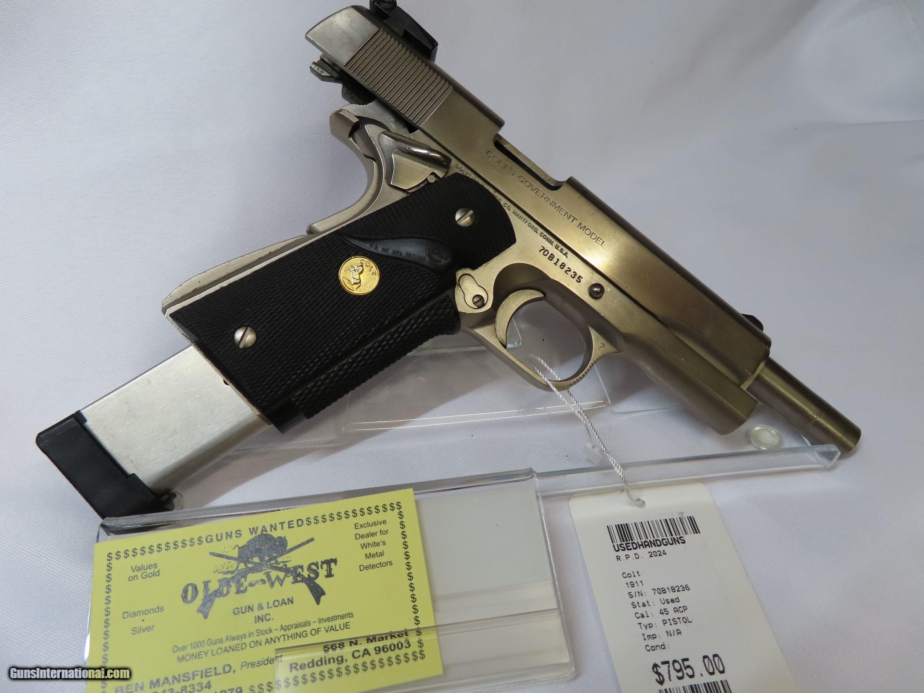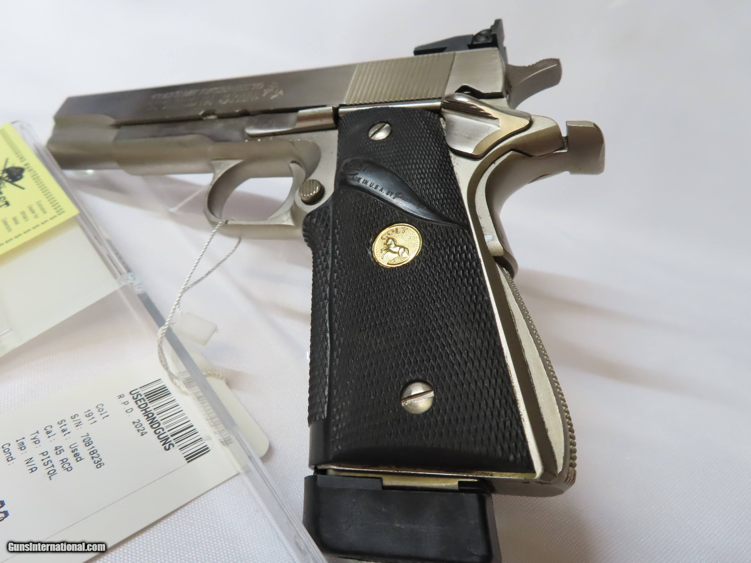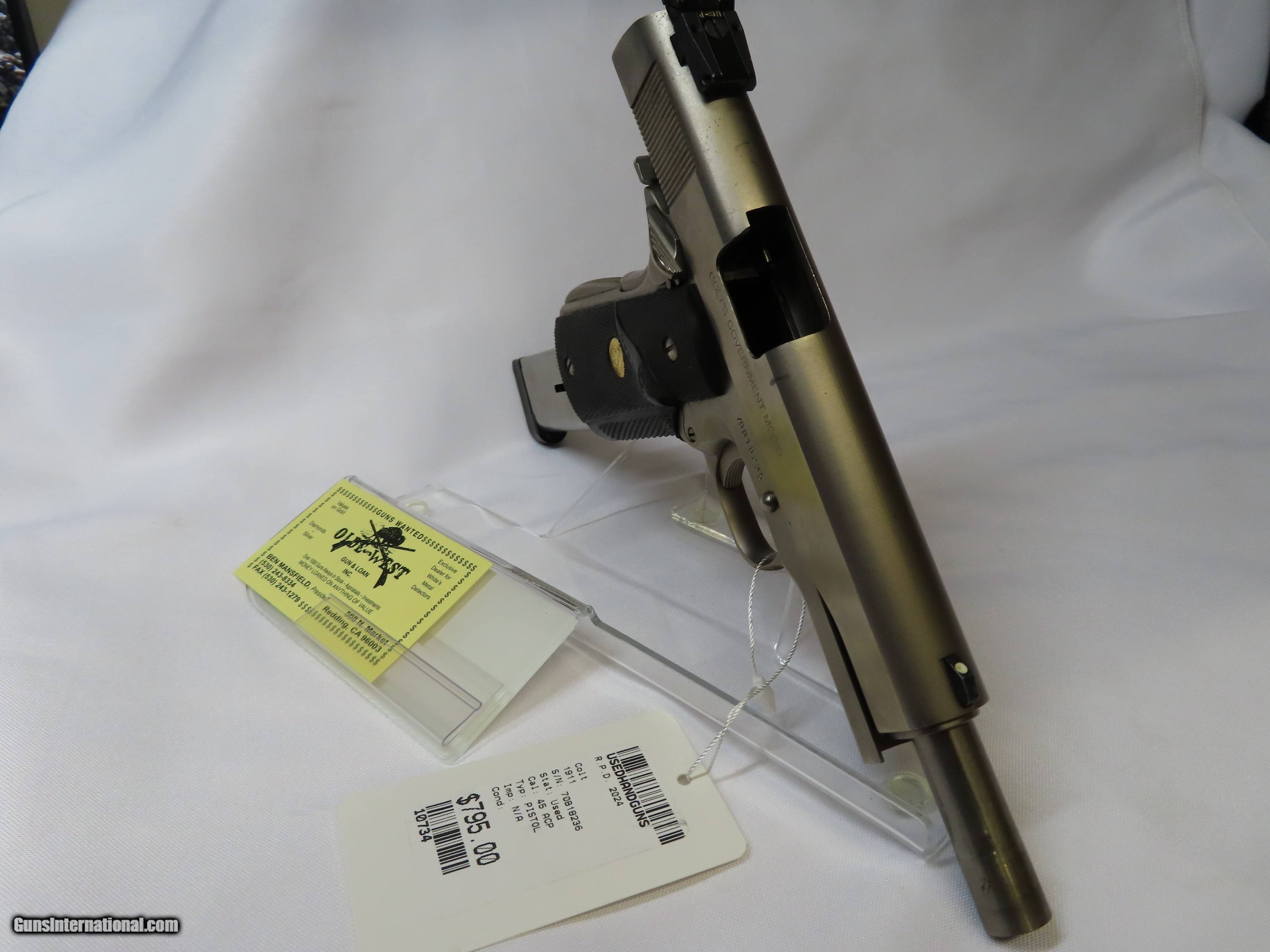 Description: COLT 1911, 45 ACP PISTOL IN STAINLESS STEEL WITH BLACK GRIPS, COMES WITH ONE MAGAZINE AND IS IN GREAT CONDITION. PLEASE REFER TO THE PICTURES BELOW TO GET ALL THE DETAILS OF THIS FIREARM AND IF YOU HAVE ANY QUESTIONS PLEASE CONTACT NICKOLE OR BEN AT OLDE WEST, (530) 243-8334. SHIPPING WITHIN THE USA $35 NOTE: THIS FIREARM IS NOT LEGAL FOR SALE TO CALIFORNIA RESIDENTS -Payment Must be Received Within 15 Days or Item Will be Relisted -There Will Be a 3% Processing Fee Applied to all Credit Card Transactions -California Residents Will be Required to Pay Sales Tax of 7.25% -All Firearms Shipped and Insured Within the USA. Shipping Fees Calculated to Lower 48 States. Alaska and Hawaii May Cost Extra -NO INTERNATIONAL SALES -Generally Handguns Ship USPS Priority and Long Guns Ship UPS Ground -Shipping Can be Combined to Save You Money if You Purchase Multiple Guns of the Same Type (E.G. Pistols or Long Guns) -Please Message me for a Shipping Quote if the Listing Does not Specify a Rate -Many Handguns are Not Legal for Sale in California. Please Check the Item Description and California DOJ Handgun Roster Before Purchasing -C&R Eligible Firearms May not be Shipped to C&R Holders Within California. They Must be Shipped to an FFL Dealer and Picked Up From There. We can Ship C&R eligible firearms directly to C&R Holders in all Other States -Antique Firearms (Firearms Made Before 1899) May be Shipped Direct Without an FFL Required. We do Require Photo Identification Proving That you are at Least 21 Years of age for Antique Firearms to be Shipped Direct. For Antique Firearms, we Also Require a Statement That you May Legally own Firearms -Please Check Your Local and State Laws Regarding Firearms and Magazine Restrictions Before Purchasing. As the Buyer, it is Your Responsibility to Make Sure That This Firearm is Legal in Your State and Jurisdiction Due to Varied Laws in Every State SOLD Handgun Caliber: .45 ACP (.45 Auto) Manufacturer: COLT Model: 1911 Serial Number: 70B18236 Condition: GREAT |